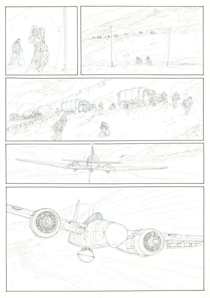 When asked if he has a favorite drawing, Romain explains that he doesn’t have one specific favorite. Instead, he finds the greatest interest in whatever project he’s currently working on. Once a drawing is complete, the next one becomes his new focus, driving him to continually improve his craft. Romain is not just a master of aviation art; he is also a skilled comic book artist. Unlike a one-off illustration for an airshow poster or model plane box art, creating a comic book requires a broad range of skills. Romain is responsible for everything from drawing backgrounds and vehicles to capturing the correct expressions on characters, controlling story rhythm, lighting, and maintaining the reader’s interest from page to page. He likens the process to making a Hollywood blockbuster—but all by himself with just paper and pencil.