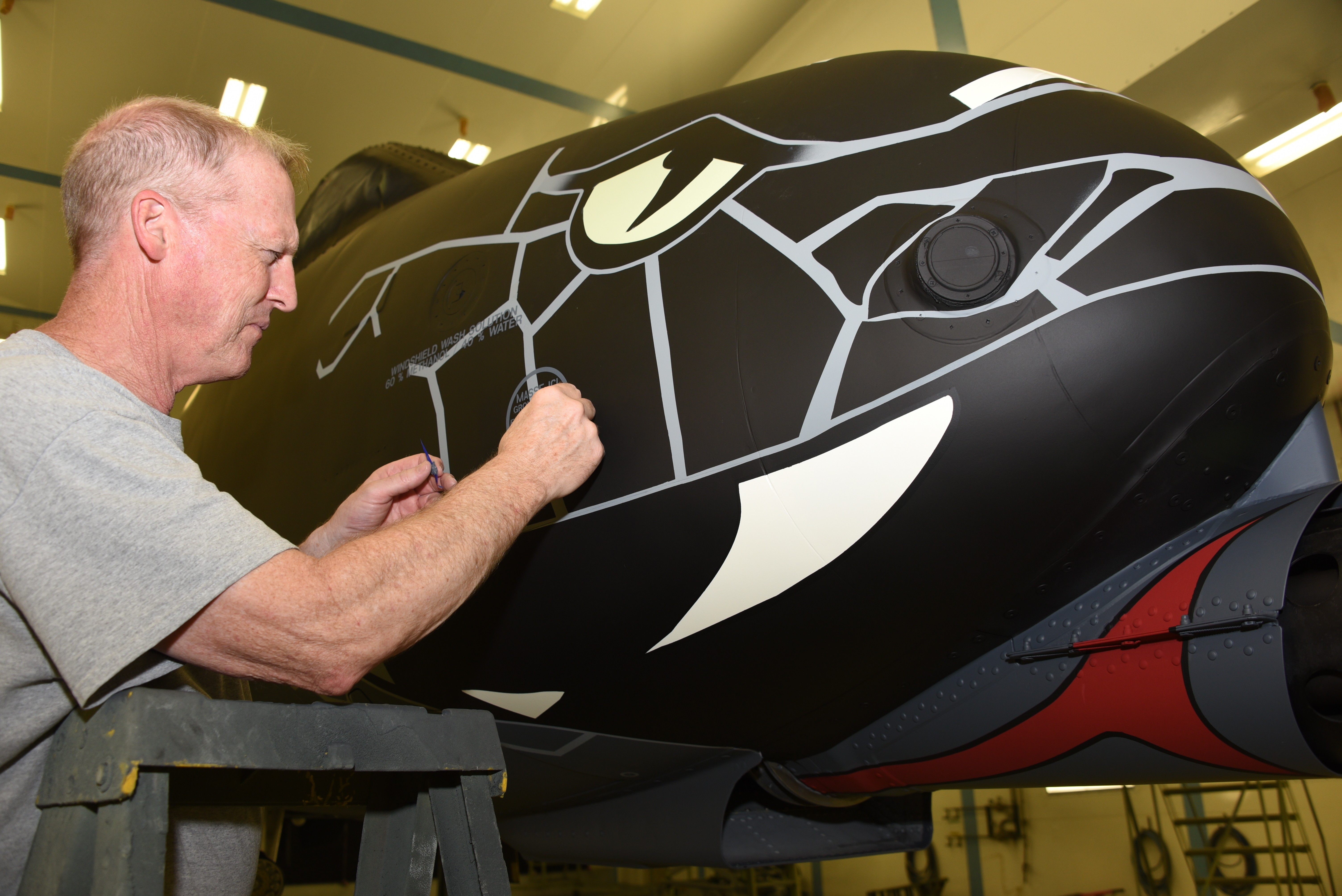 Air National Guard Paint Facility technician, Paul Grigsby cleans up stenciling on the nose of a U.S. Air Force A-10 Thunderbolt II while in the paint booth at the Sioux City, Iowa based Air National Guard Paint Facility on June 29, 2021. The aircraft from the 122nd Fighter Wing has been painted with a non-standard paint scheme in order to commemorate the 100th anniversary of aviation in the Indiana National Guard.