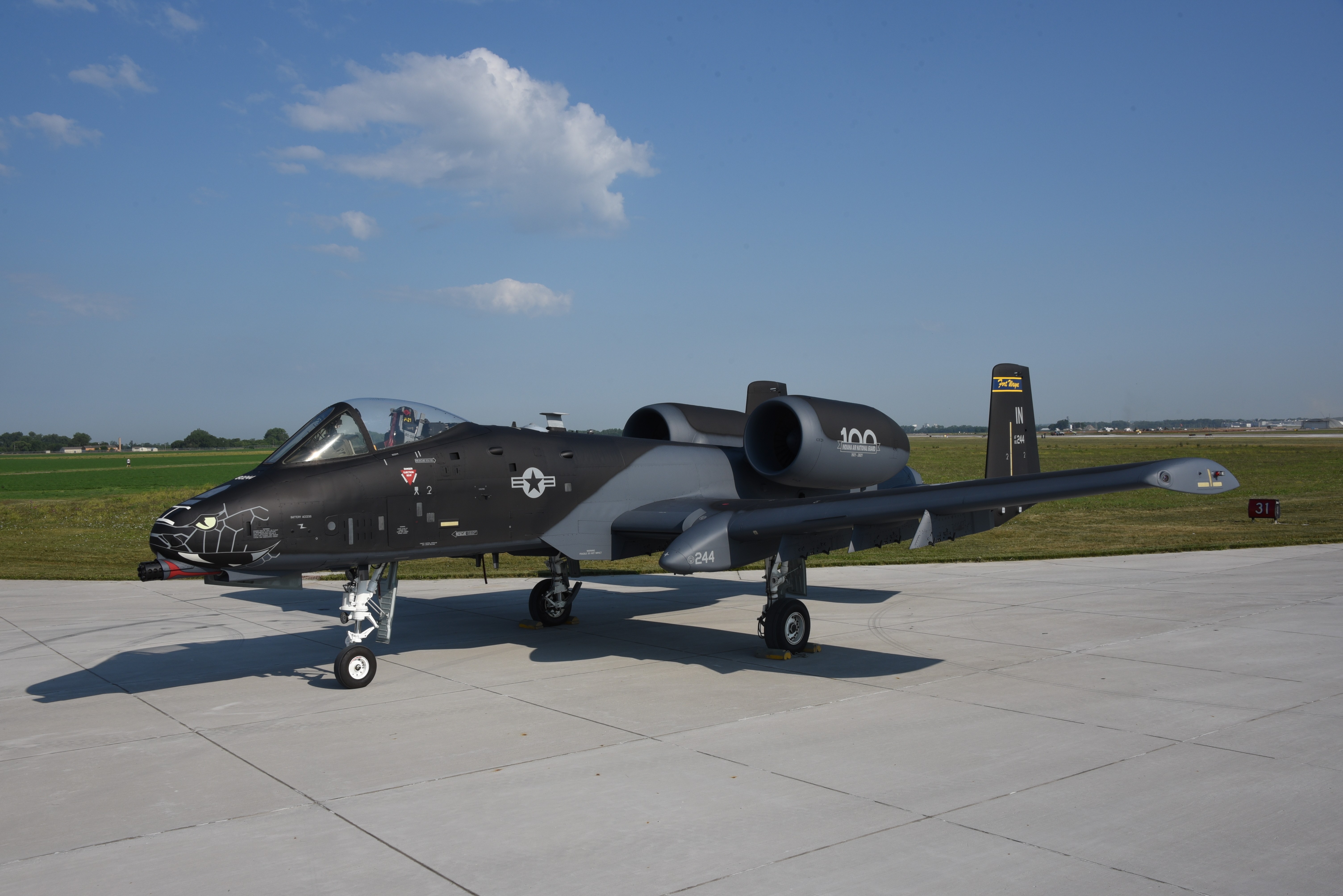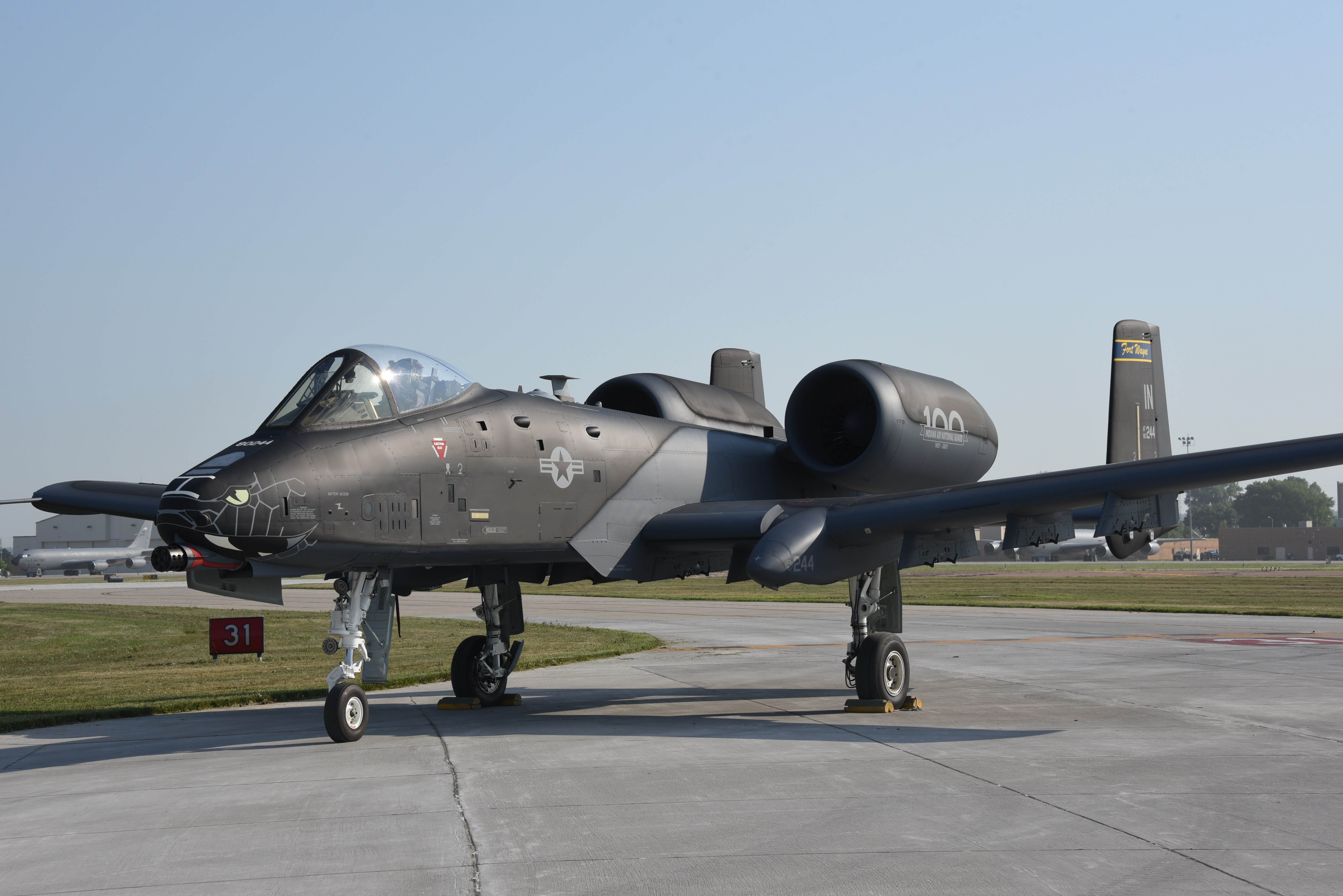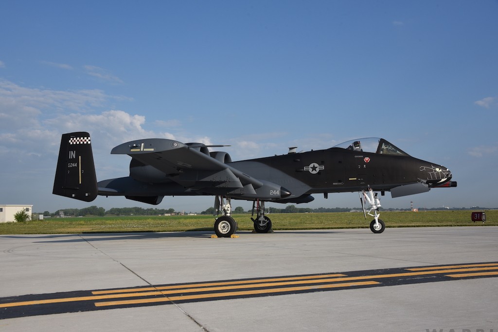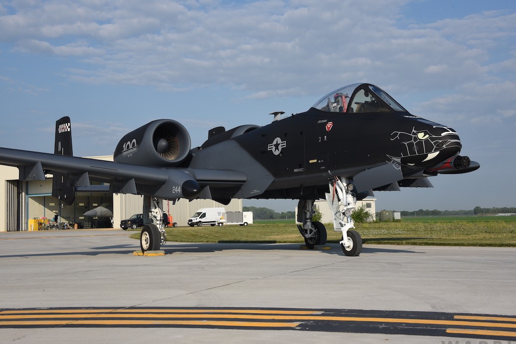 A black and grey U.S. Air Force A-10 Thunderbolt II from the Indiana Air National Guard’s 122nd Fighter Wing “Blacksnakes,” painted at the Air National Guard paint facility in Sioux City, Iowa on July 2, 2021. In a departure from the standard A-10 two-tone grey, the paint scheme was created by request in order to commemorate the 100th anniversary of aviation in the Indiana National Guard.