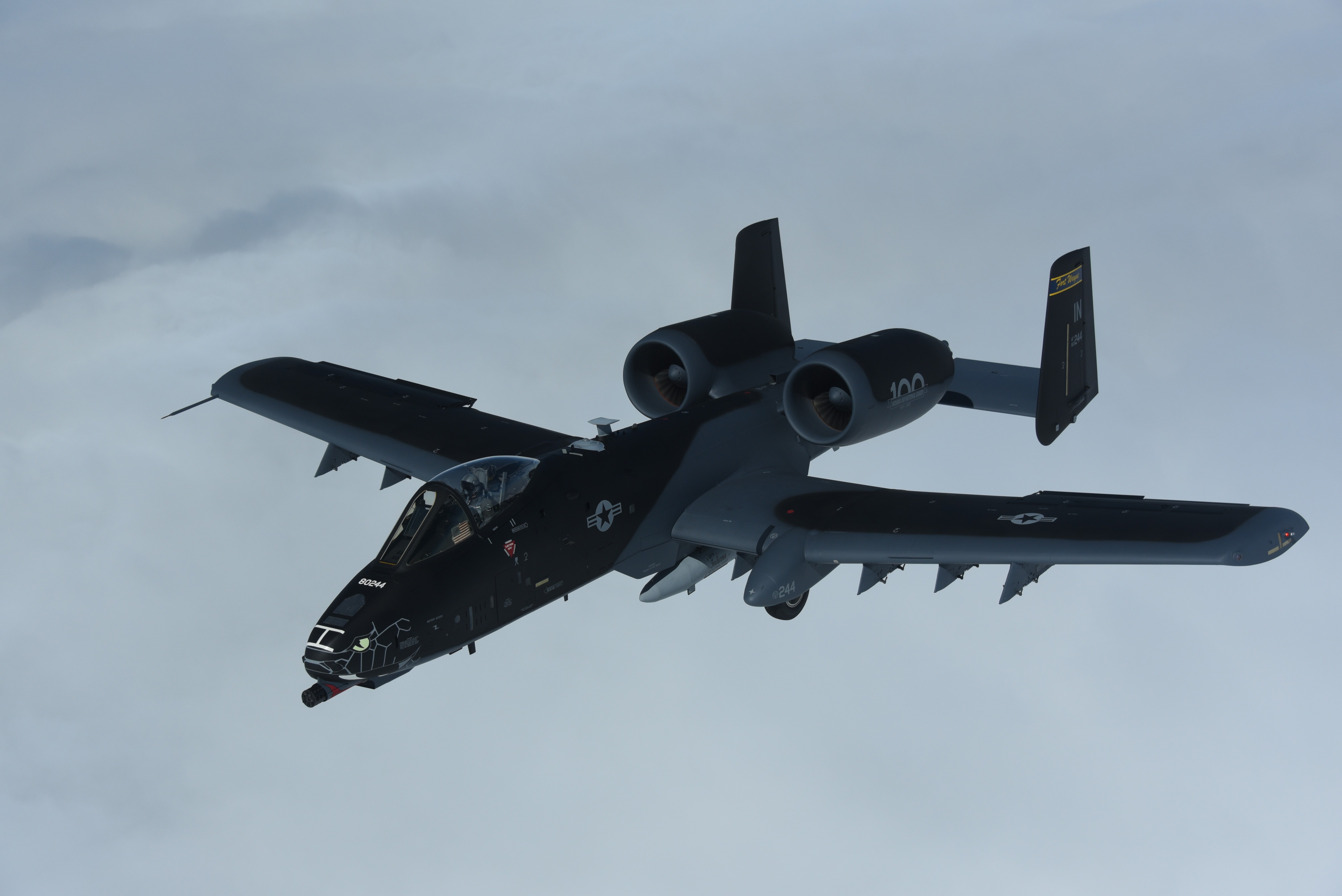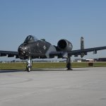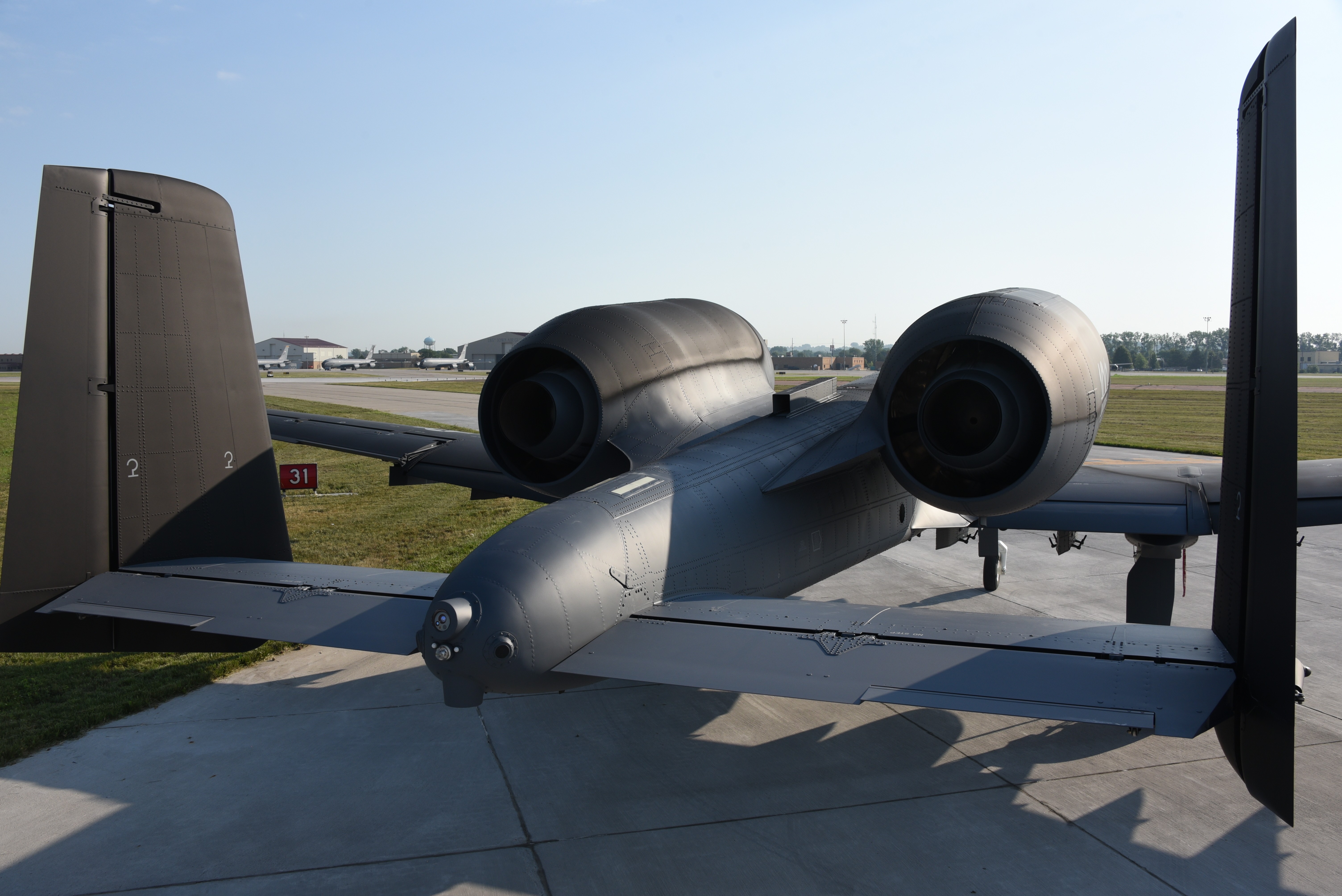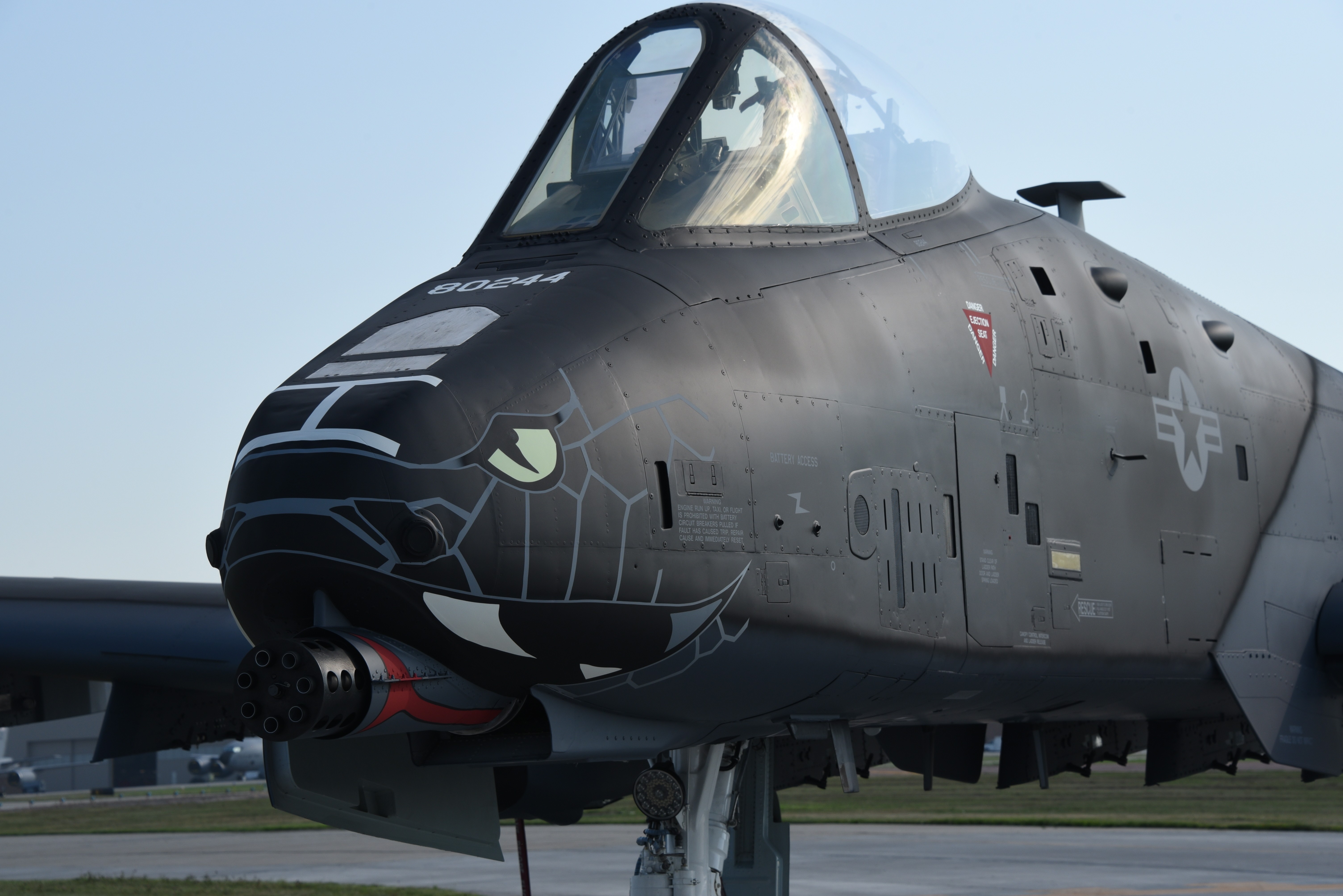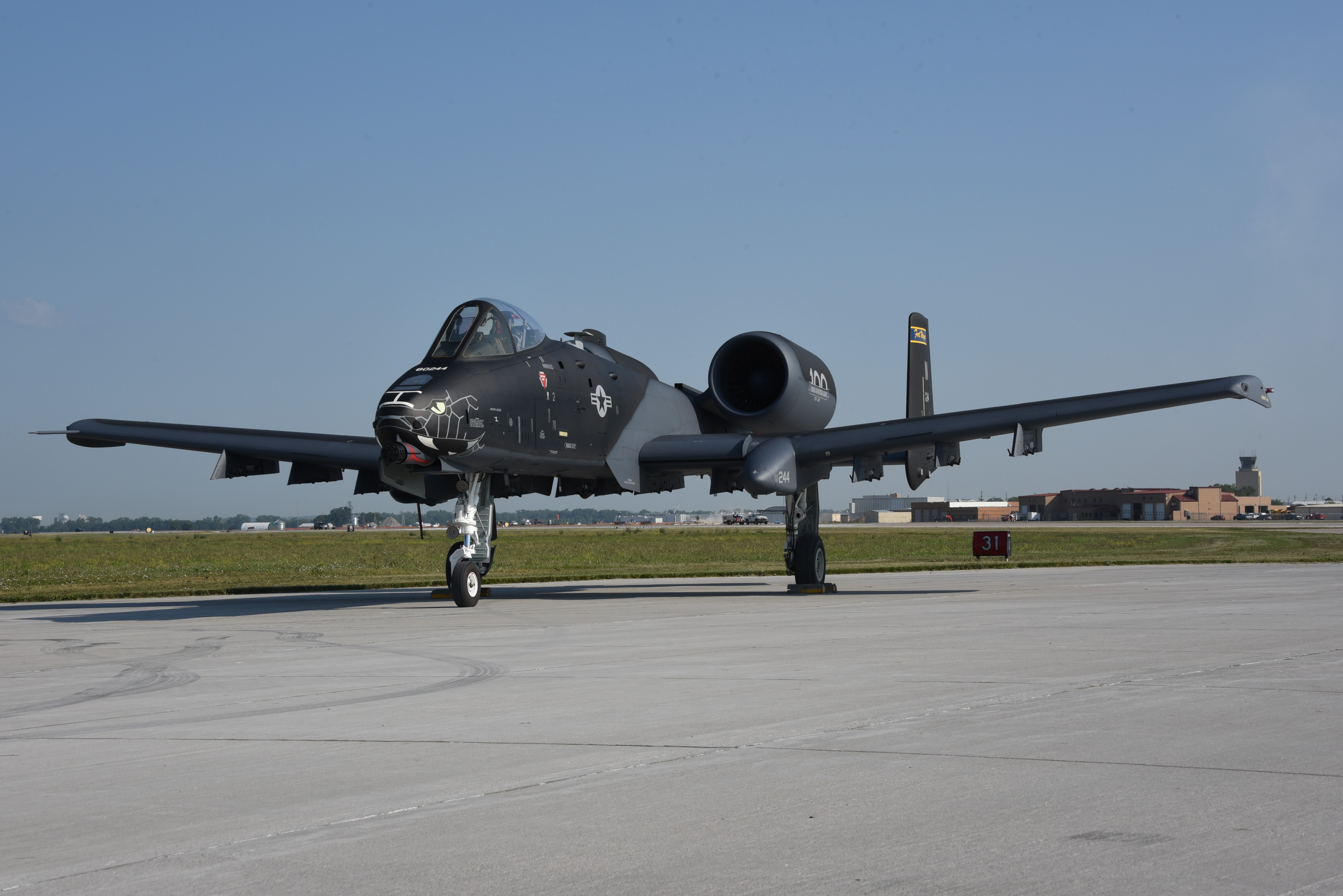 A black and grey U.S. Air Force A-10 Thunderbolt II from the Indiana Air National Guard’s 122nd Fighter Wing “Blacksnakes,” painted at the Air National Guard paint facility in Sioux City, Iowa on July 2, 2021. In a departure from the standard A-10 two-tone grey, the paint scheme was created by request in order to commemorate the 100th anniversary of aviation in the Indiana National Guard.