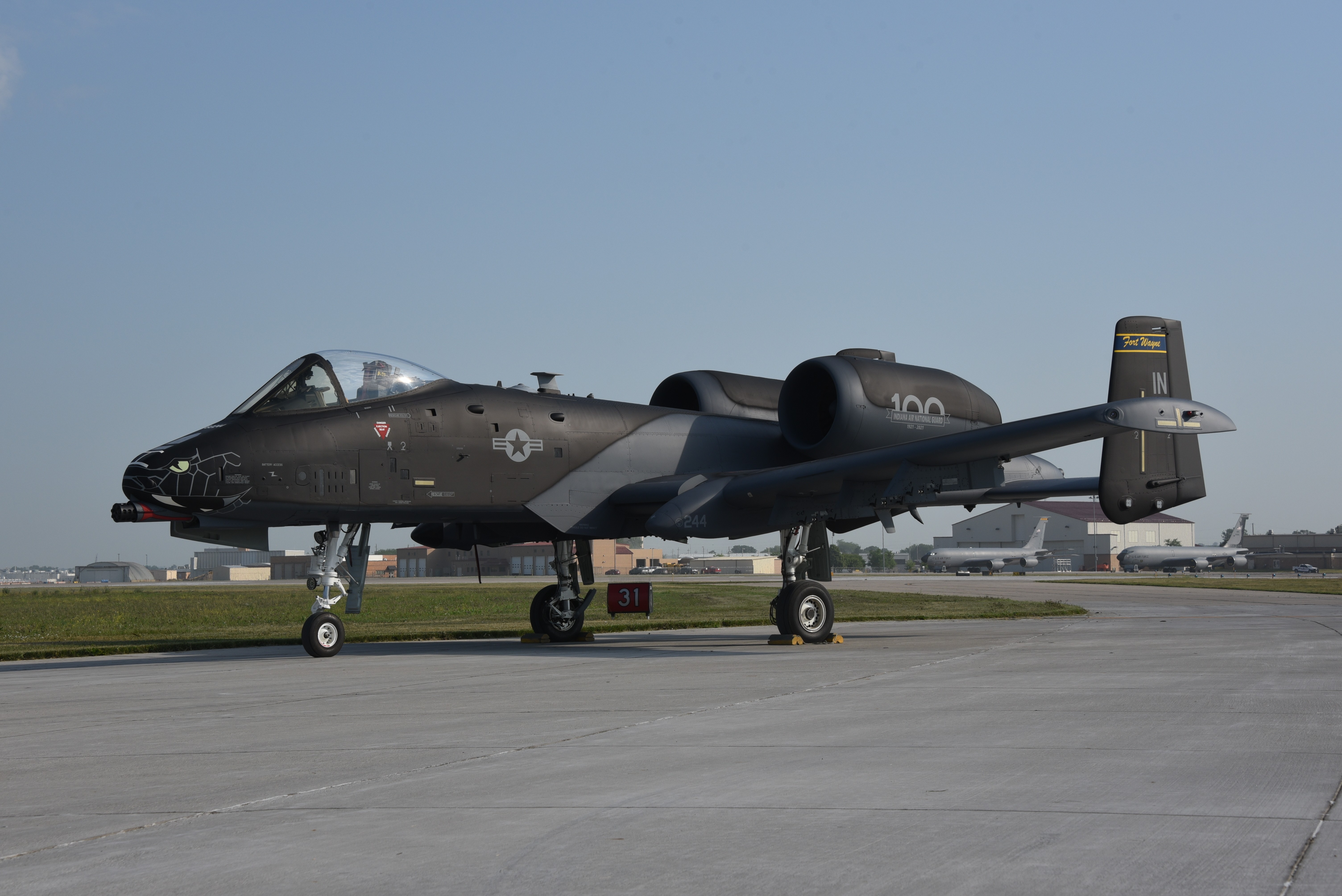 The A-10’s distinctive engine nacelles are embossed with an Indiana ANG centennial logo displaying the text “Indiana Air National Guard” under a large number “100” with the years “1921-2021.”