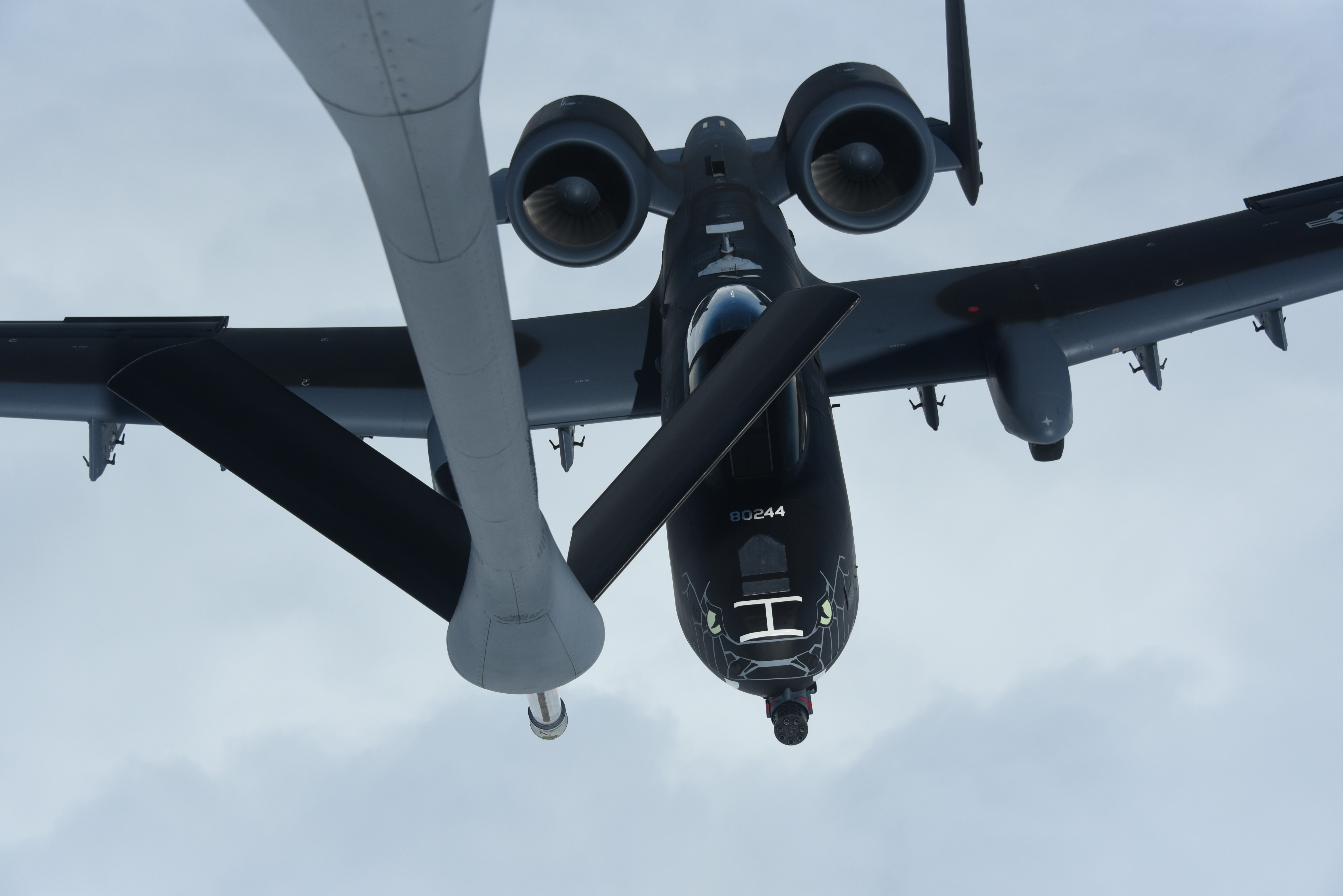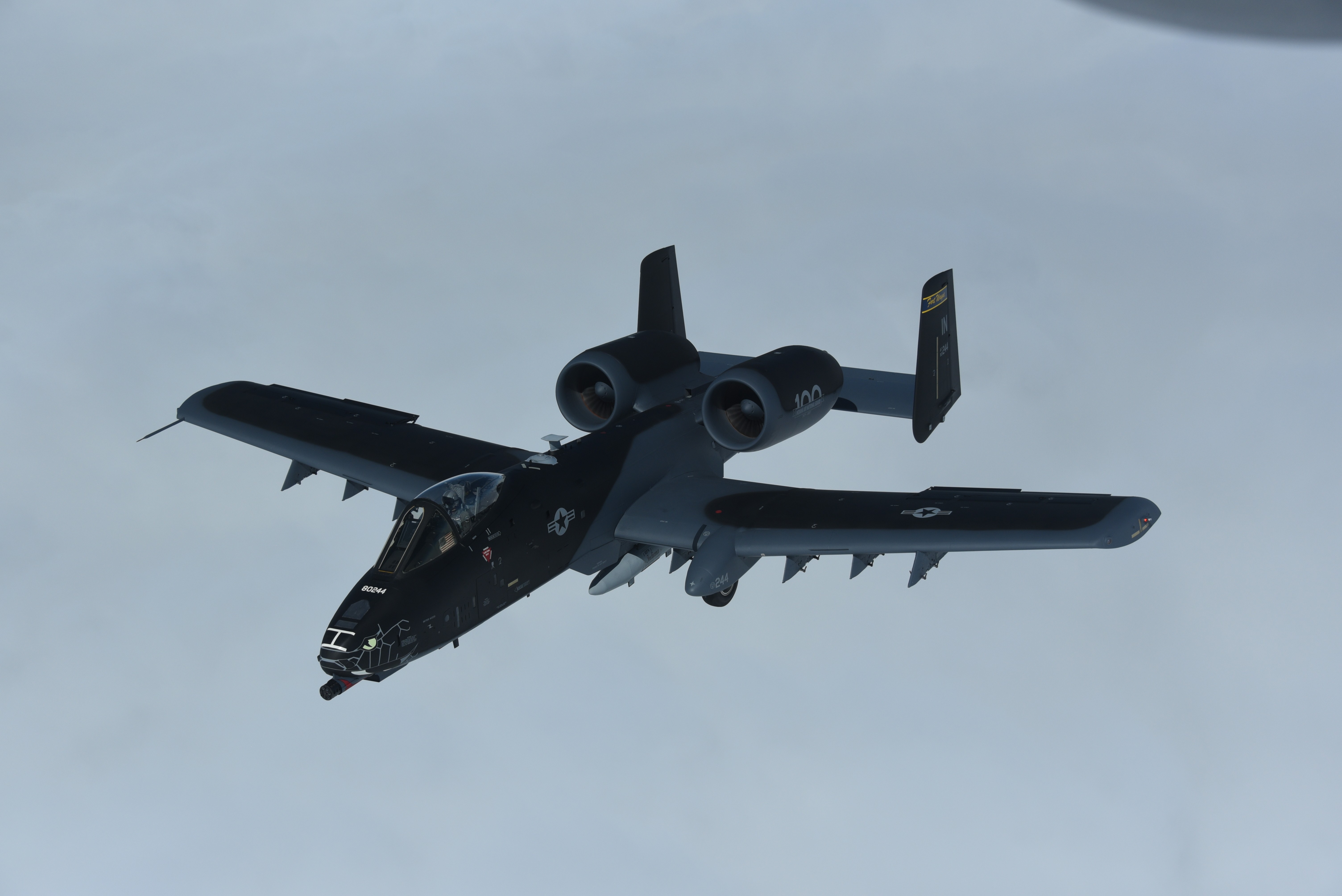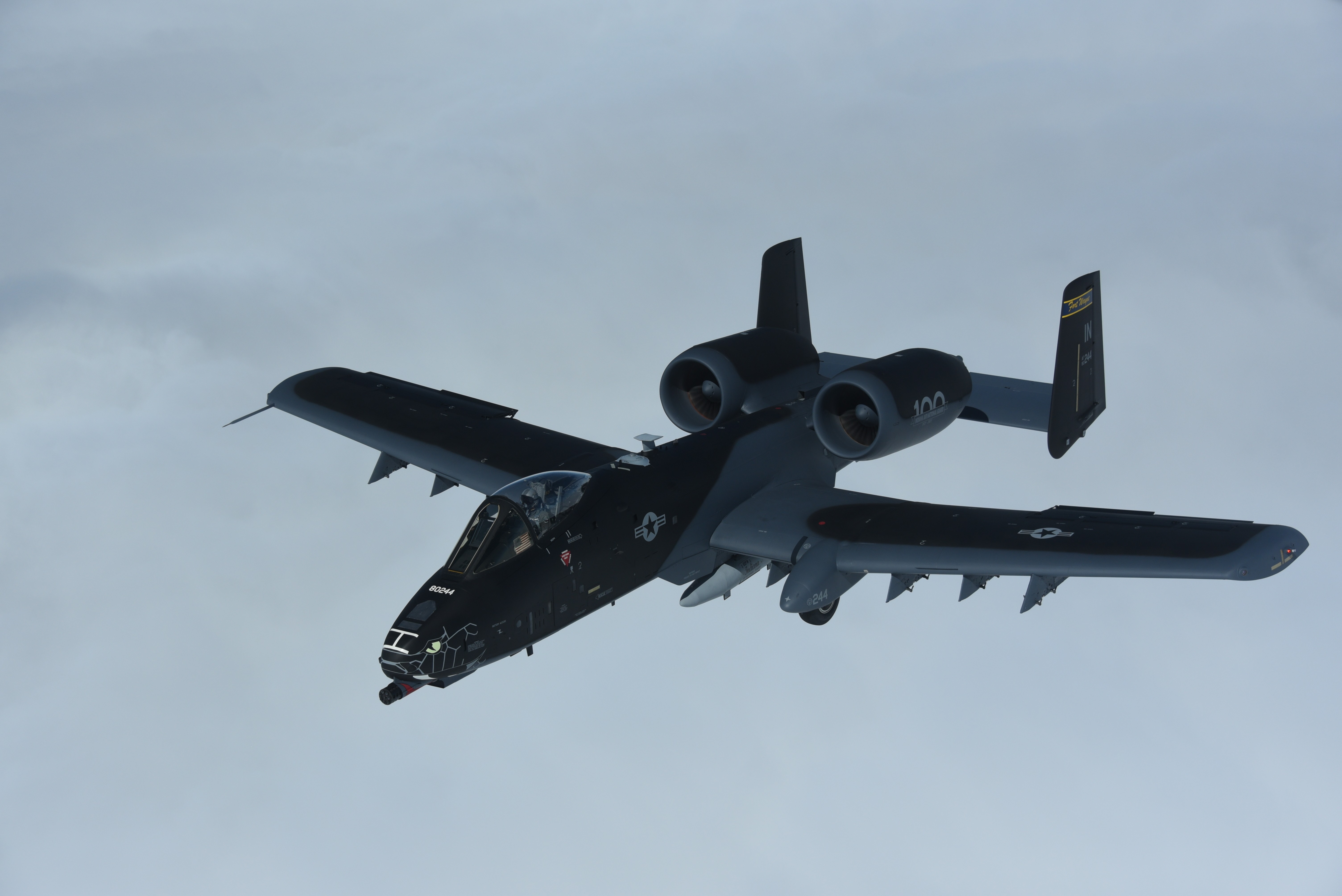 A black and grey U.S. Air Force A-10 Thunderbolt II from the Indiana Air National Guard’s 122nd Fighter Wing “Blacksnakes,” flying home on July 7, 2021. The A-10 is on its way back to Fort Wayne Ind. after being painted at the Air National Guard paint facility in Sioux City, Iowa. The paint scheme, a departure from the standard two-tone grey, was created by request in order to commemorate the 100th anniversary of aviation in the Indiana National Guard.