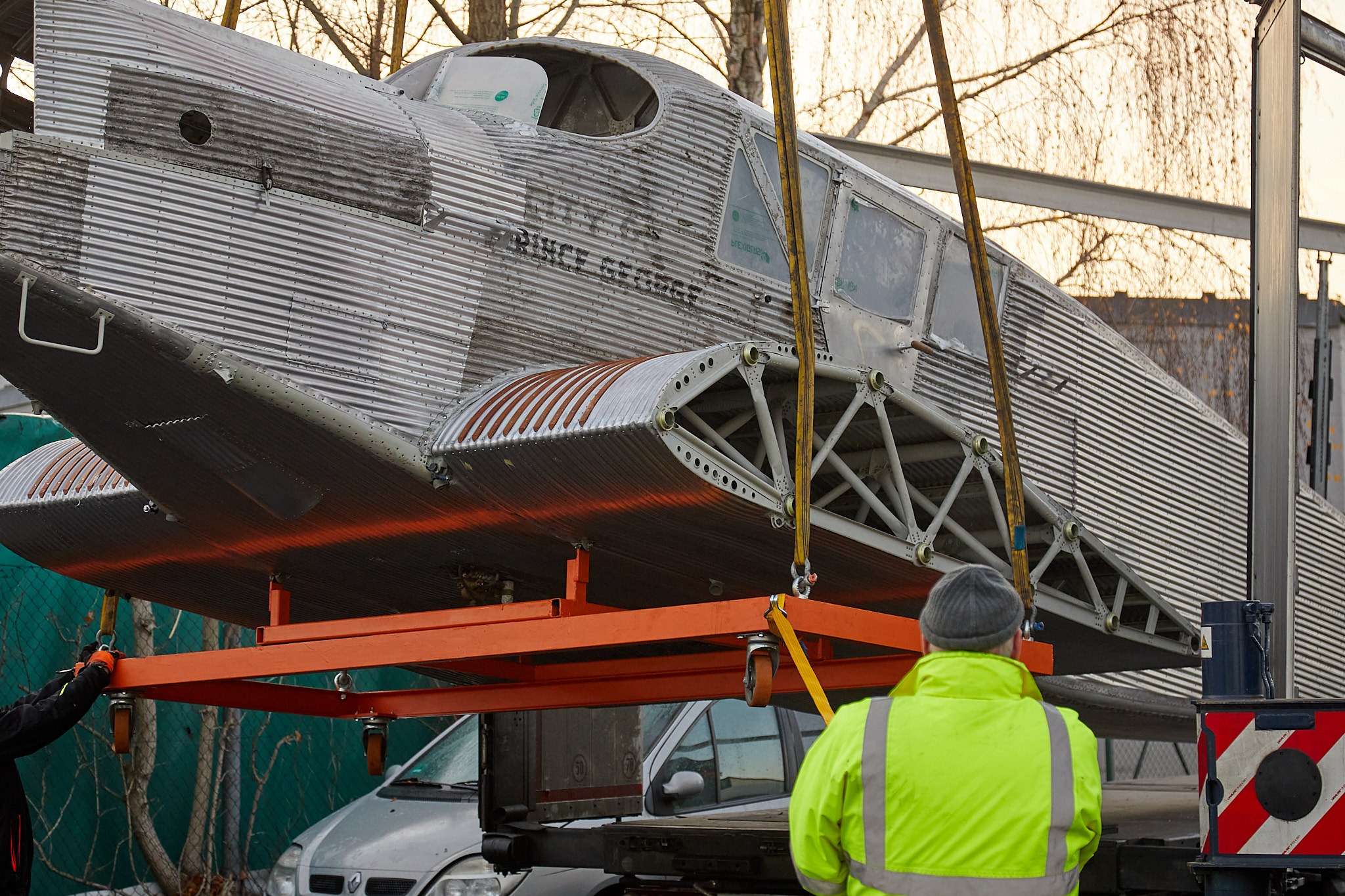 The next day, Staines continued dismantling the engine, in spite of pouring rain. Having completed the task, the parts were loaded into parcels, with the heaviest components being the crankcase and the crankshaft. They had to be carried by hand across creeks and through the bush to a waiting Junkers W 34 transport, registered as CF-ABK, and flown by WWI veteran pilot Norman “Norm” Forester. After taking several trips in and out of the British Columbian bush, the remainder of the City of Prince George was left to the elements where it fell for the next 47 years.