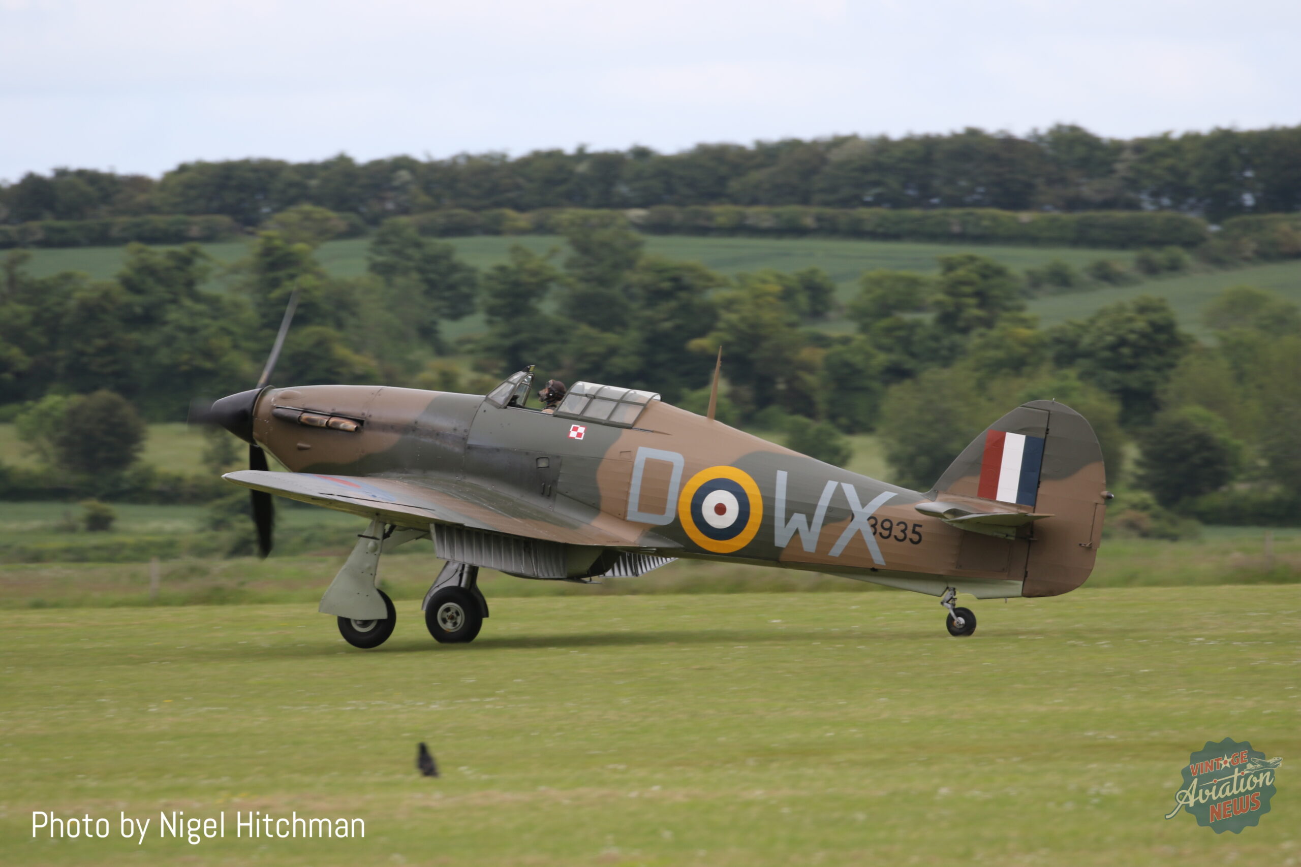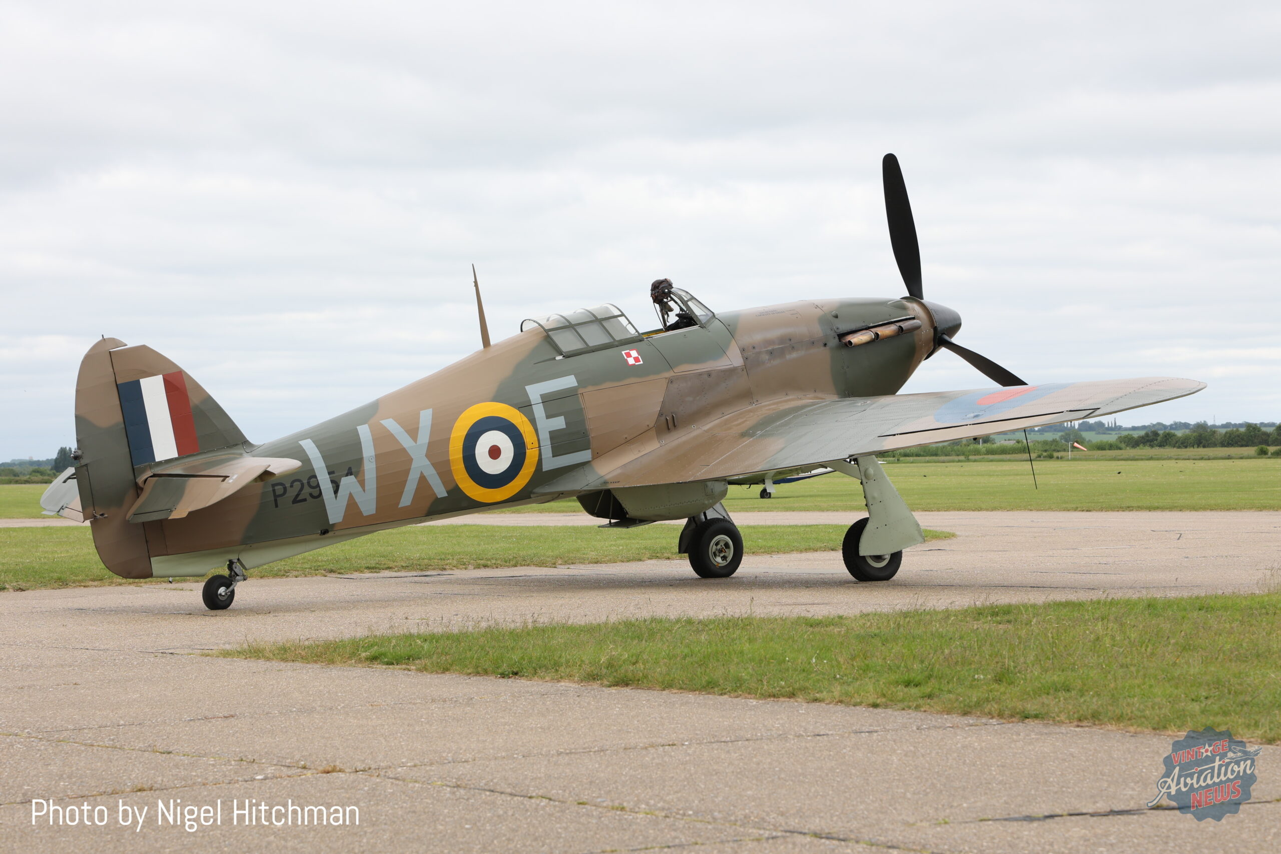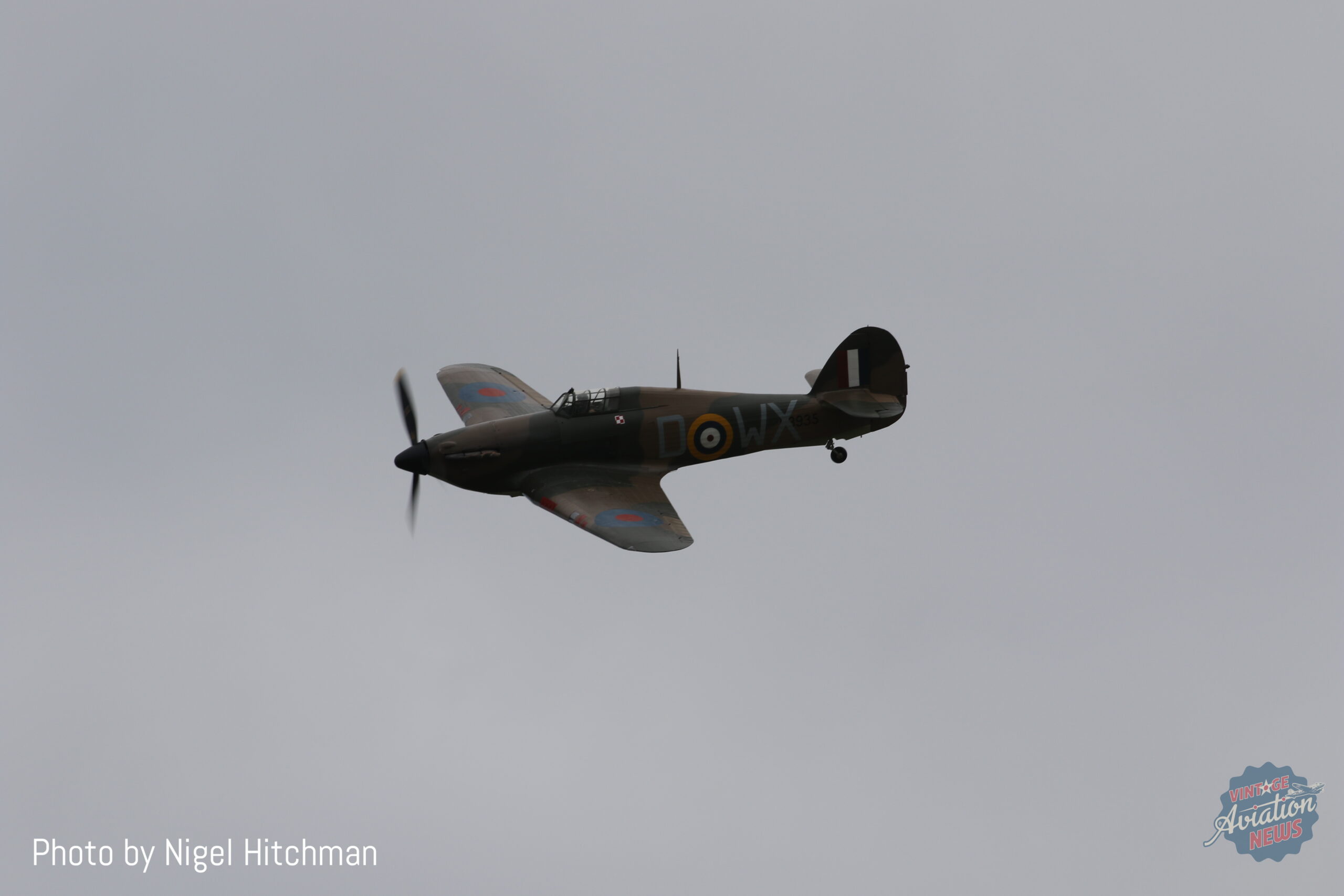 As for other flying at Duxford that day, I had heard talk that the Historic Aircraft Collection’s Hawker Hurricane Mk.XIIA (RCAF5711/G-HURI) would be returning later in the afternoon, following the completion of its re-cover and repaint at Audley End with Vintage Fabrics. Sure enough, it appeared in formation with a Yak-52 photo-ship which had left sometime earlier. After a quick practice display, the Hurricane landed, revealing its new colors. While the Historic Aircraft Collection owns the aircraft, it is the Polish Heritage Flight that actually operates it at present. They have painted the Hurricane to represent two different examples which served with RAF 302 (Polish) squadron, which was briefly based at Duxford during the Battle of Britain: P2954/WX-E flown by Flt Lt Tadeusz Chlopik and P3935/WX-D flown by Flt Lt Julian Kowalski (later Wg Cdr). For more information about these two heroes, please click HERE.