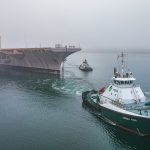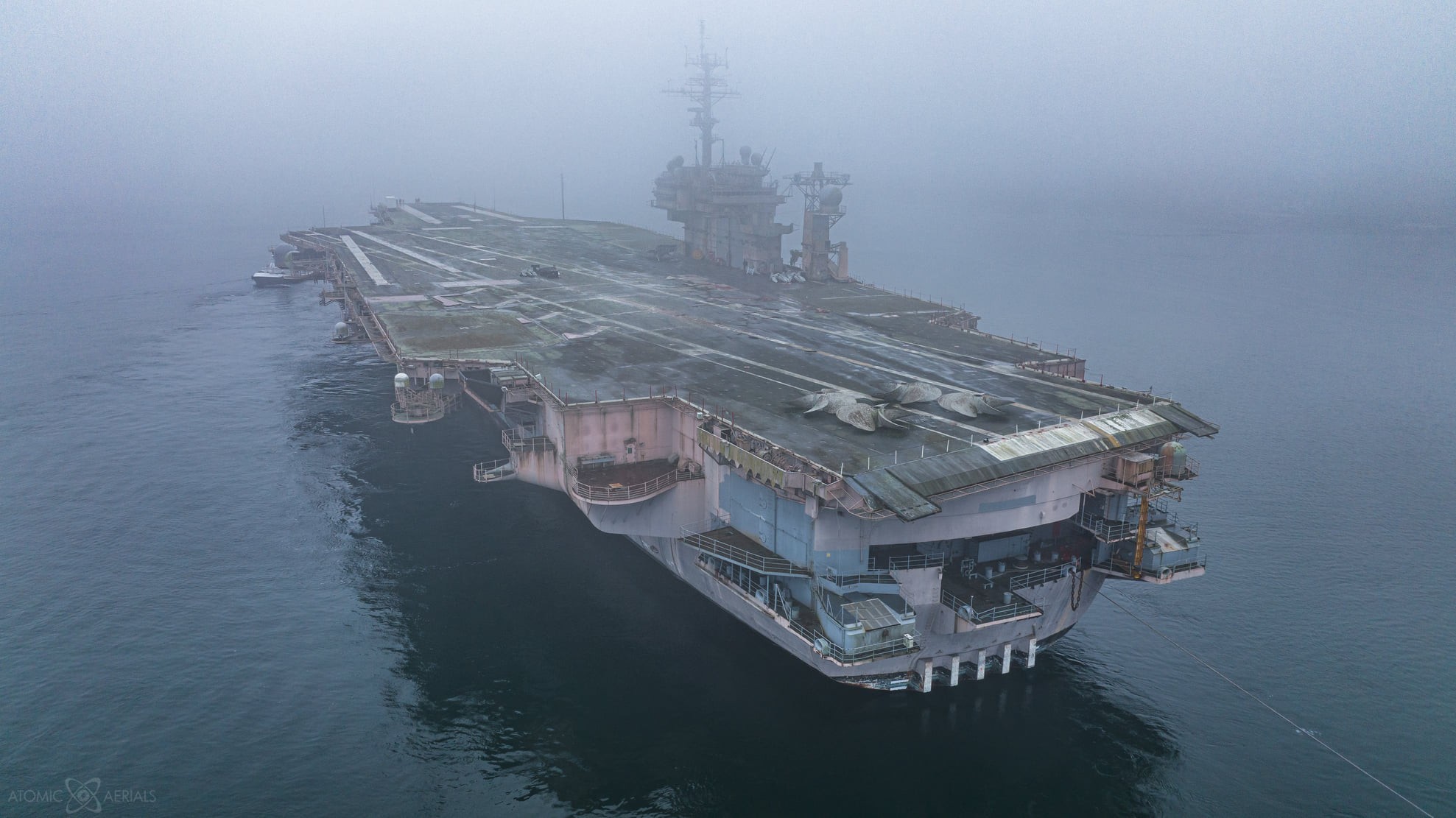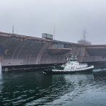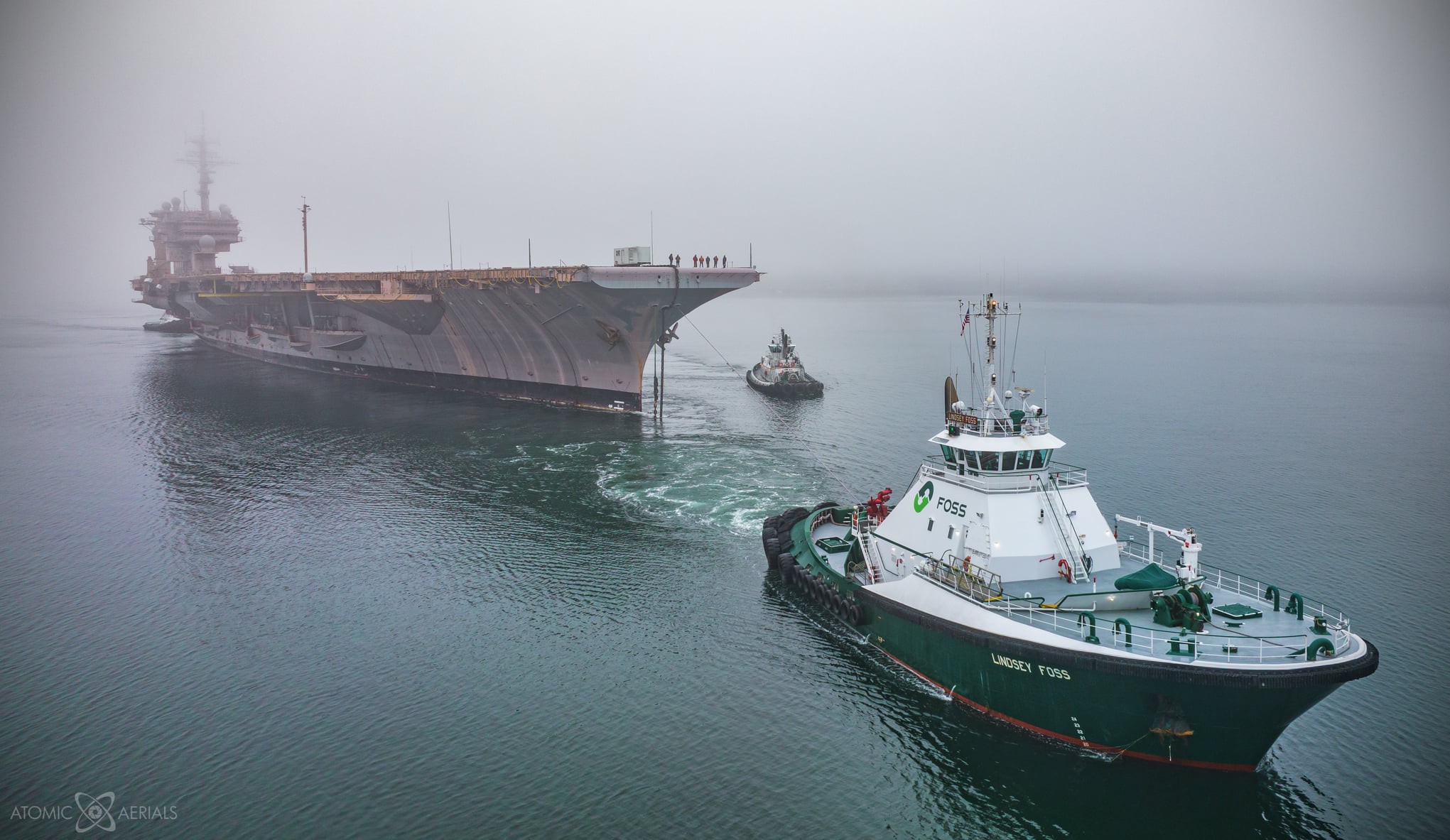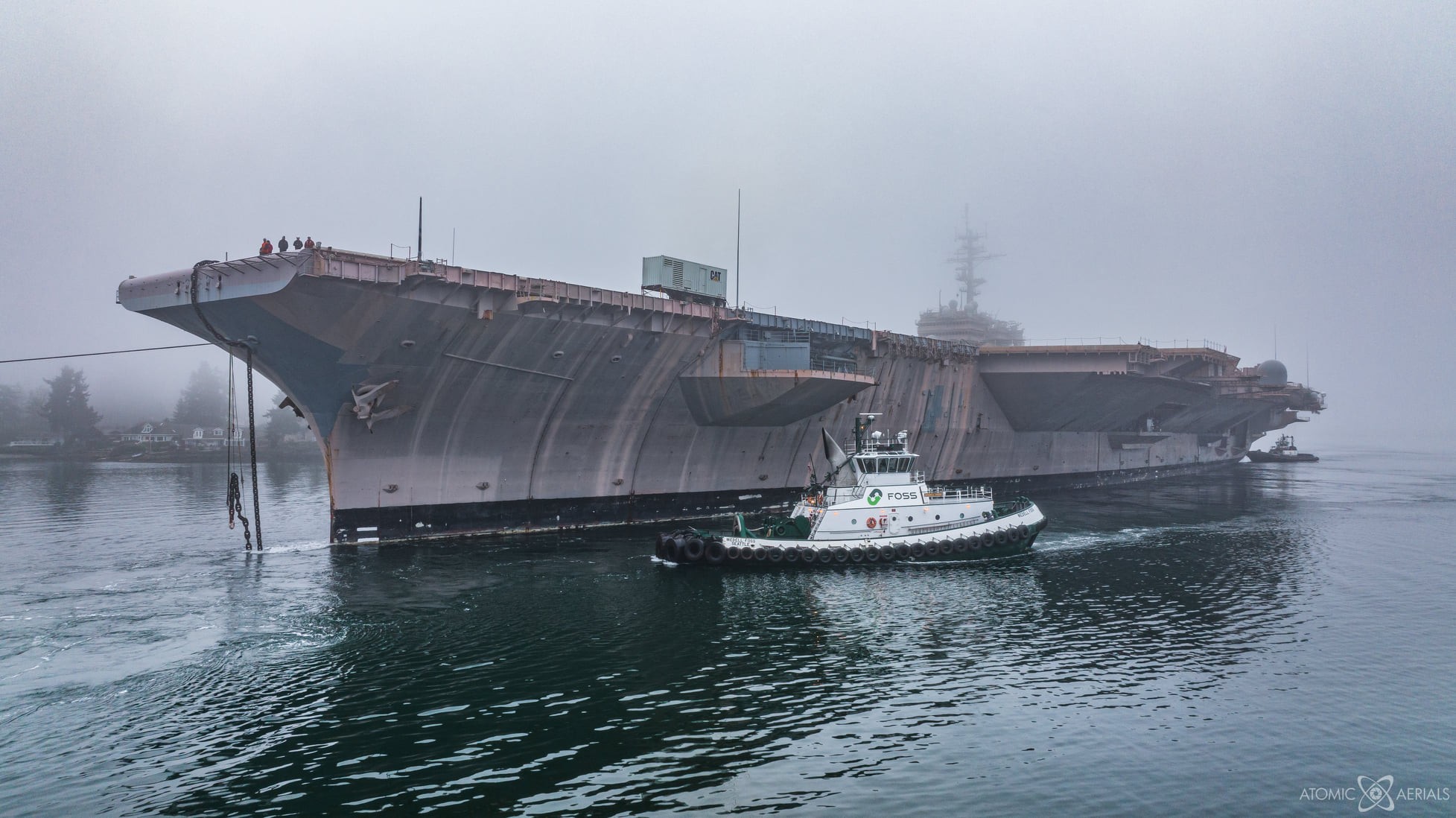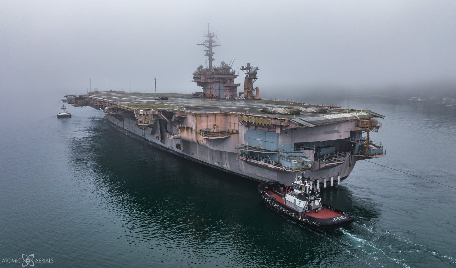 Onlookers, many of them former sailors aboard the “Battle Cat,” watched as tugs pulled the rugged warship into Sinclair Inlet on a foggy Saturday morning. At more than 1,000 feet long, the Kitty Hawk won’t fit in the Panama Canal, so the warship will be tugged through the Strait of Magellan en route to Brownsville, Texas.