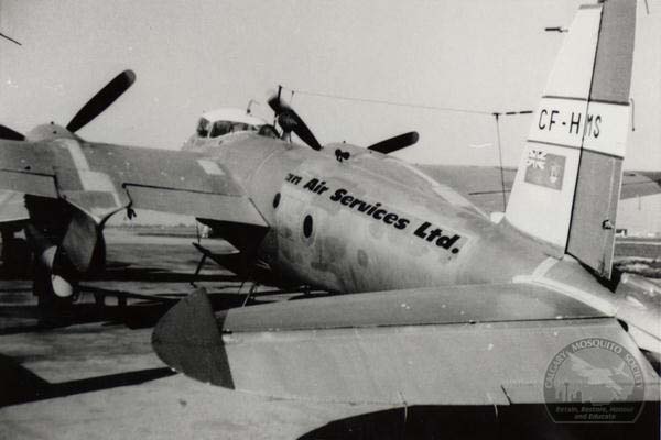 In 1955, RS700 was purchased by Canada’s Spartan Air Services along with 15 other B.35 Mosquitos, reportedly sold by the RAF for $1,500 a piece. Spartan Air Services specialized in civilian aerial photographic surveying, and the B.35 was the perfect plane for such activities. Five of the planes were broken up for spares and 10 were modified for Spartan’s specialized needs. Modifications of the Mosquito fleet for their new civilian role was performed by Derby Aviation Ltd, at Burnaston Airfield in Derbyshire, UK and the planes were then ferried back to Canada using the same routes that so many Canadian-built warplanes had taken heading east across the Atlantic in support of the war Allied war effort in Europe. Modifications to the Mosquitos included the installation of a large additional fuel tank, installed in the bomb bay, an extra-clear perspex nose cone, a DF loop and a modified rear hatch for the cameraman. RS700 was then assigned the Canadian Registration of CF-HMS.