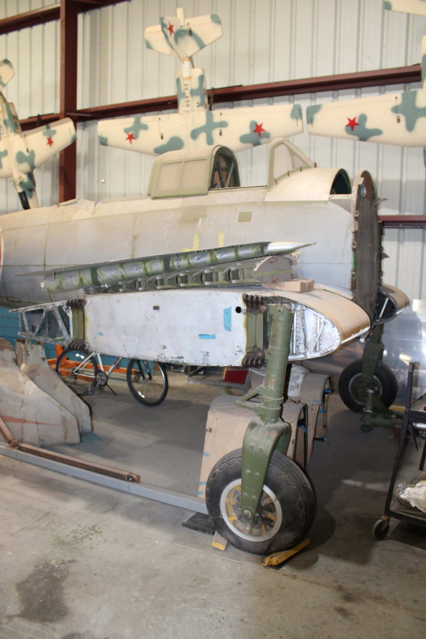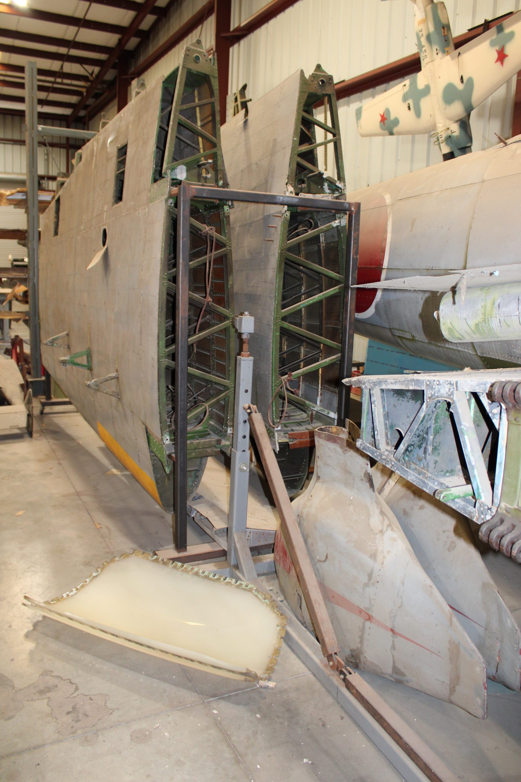 Although the museum wanted to fly the aircraft and registered the aircraft with the FAA as N3131G, the museum realized that the aircraft needed to undergo a new restoration in order to fly again. The museum initially displayed the aircraft intact and even brought it out on the flight apron at Chino Airport for local airshows, but as museum volunteers began restoration work on the D3A2 Val, they removed the Wright R-2600 engine, vertical and horizontal stabilizers, and the outer wing panels, displaying the aircraft in the museum’s Foreign Hangar without these surfaces. With the construction of the museum’s dedicated restoration hangar, named for fellow aircraft collector and benefactor of the museum Tom Friedkin, the Val was moved to a corner of this hangar for more intensive restoration work.