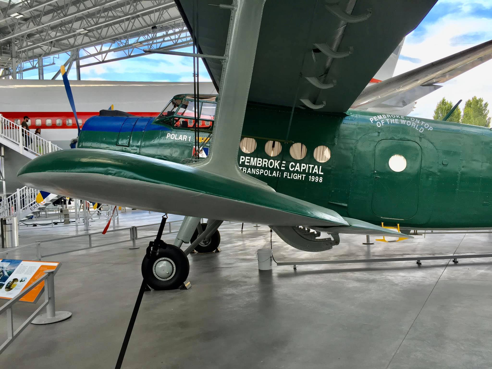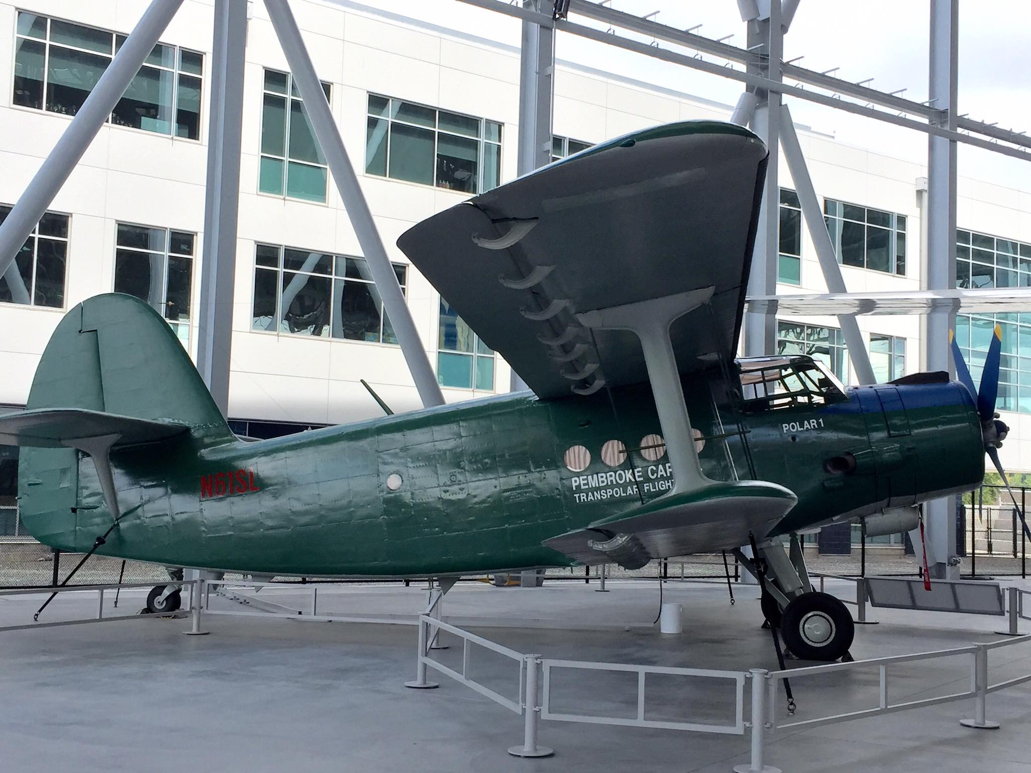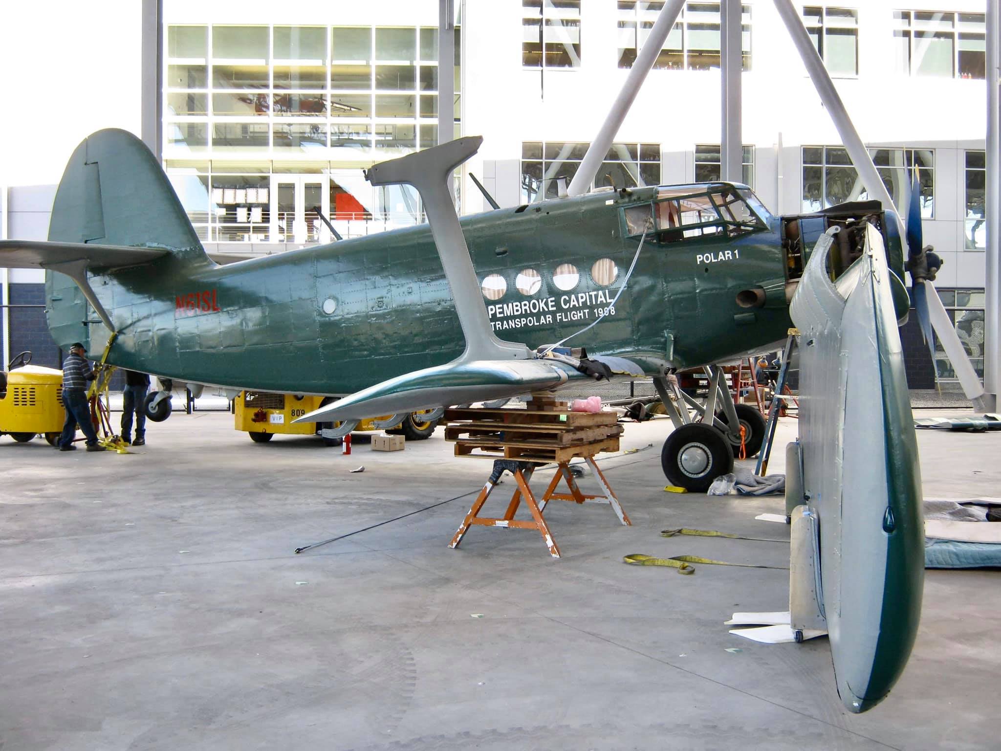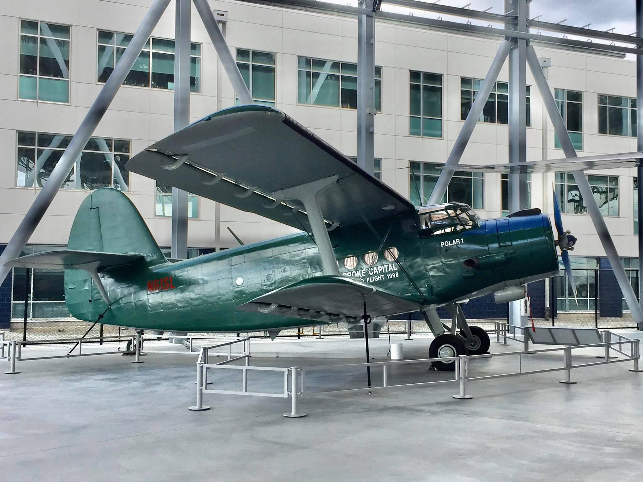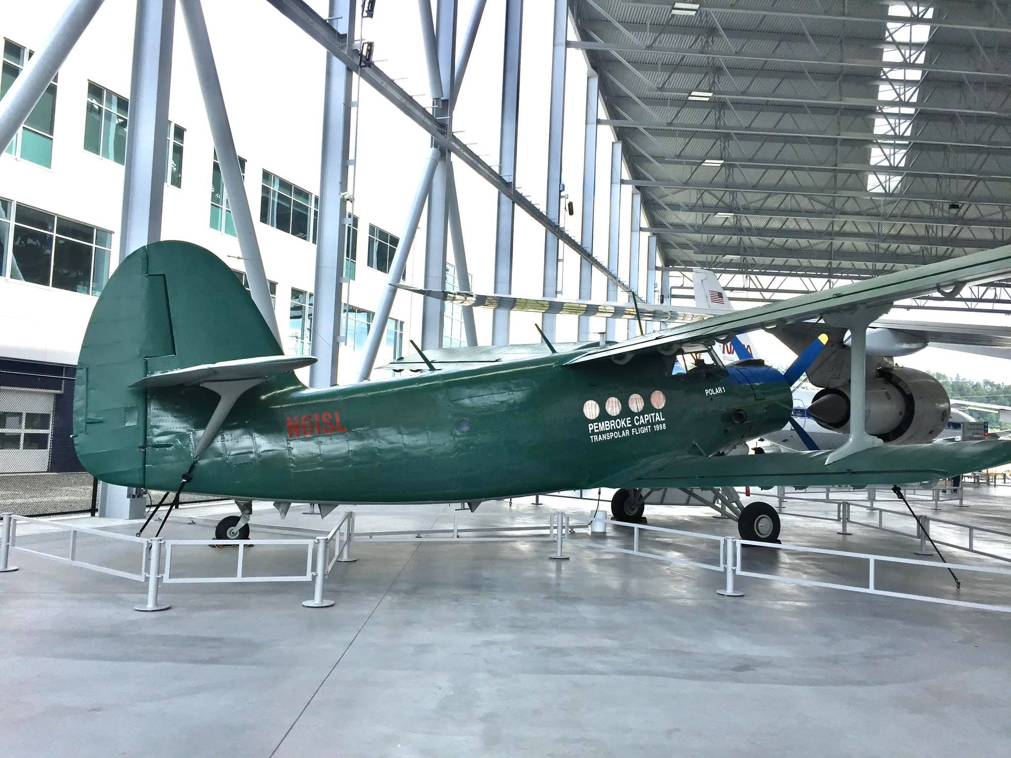 Antonov AN-2R, s/n 1G17527, N61SL, NATO reporting name “Colt” and “Type 22” by the U.S. Department of Defense, “Kukuruznik” (Corn Farmer), and is also known throughout the former Soviet Union block as “Annushka” (Annie) and “Flying Can.” This particular airplane was built in 1977 by PZL Mielec, a Polish aerospace manufacturer that produced more AN-2s than any other at the plant. I find little of the early flight history of this airplane, e.g., 1977 to an unknown owner as CCCP-62504; 1993 to another unknown owner as FLA-01270; until 1996-97, its acquisition and certificate of airworthiness as indicated in the following. As “Polar 1” in a flight ending April 13, 1998, it took part in a flight honoring the ca. 2,200-mile, 20-hour polar flight made in Lockheed Vega, NX3903 in April of 1928 by American aviators Carl Benjamin “Ben” Eielson and George H. Wilkins from Point Barrow, Alaska to Spitsbergen, Svalbard, Norway (see historic photo). Following completion of the honorary flight, this airplane was donated to the Museum of Flight in Seattle (which is the registered owner) by Pembroke Capital of Dublin, one of the sponsors of the transpolar flight, which in turn had hired Shane Lundgren – founder of Air Berlin – as a marketing director for the flight. Note that the polar bear has not yet been added to the tail fin.