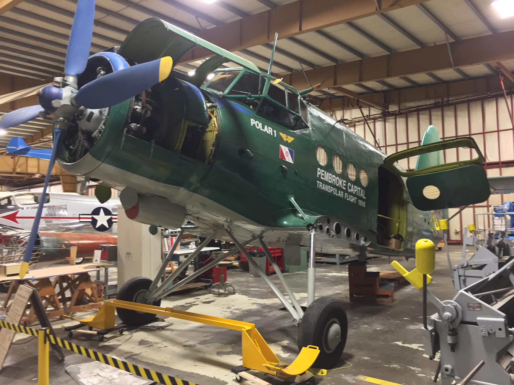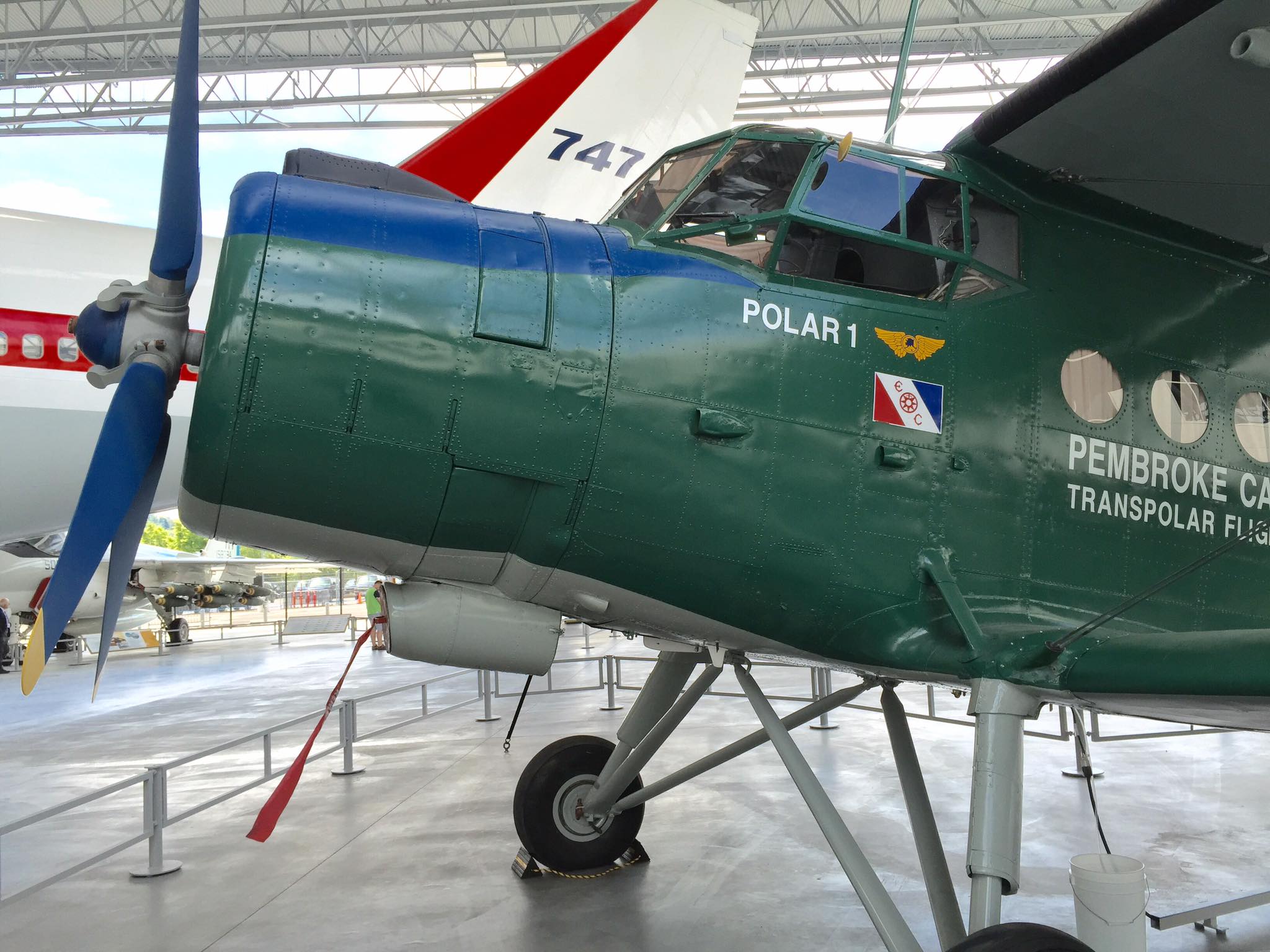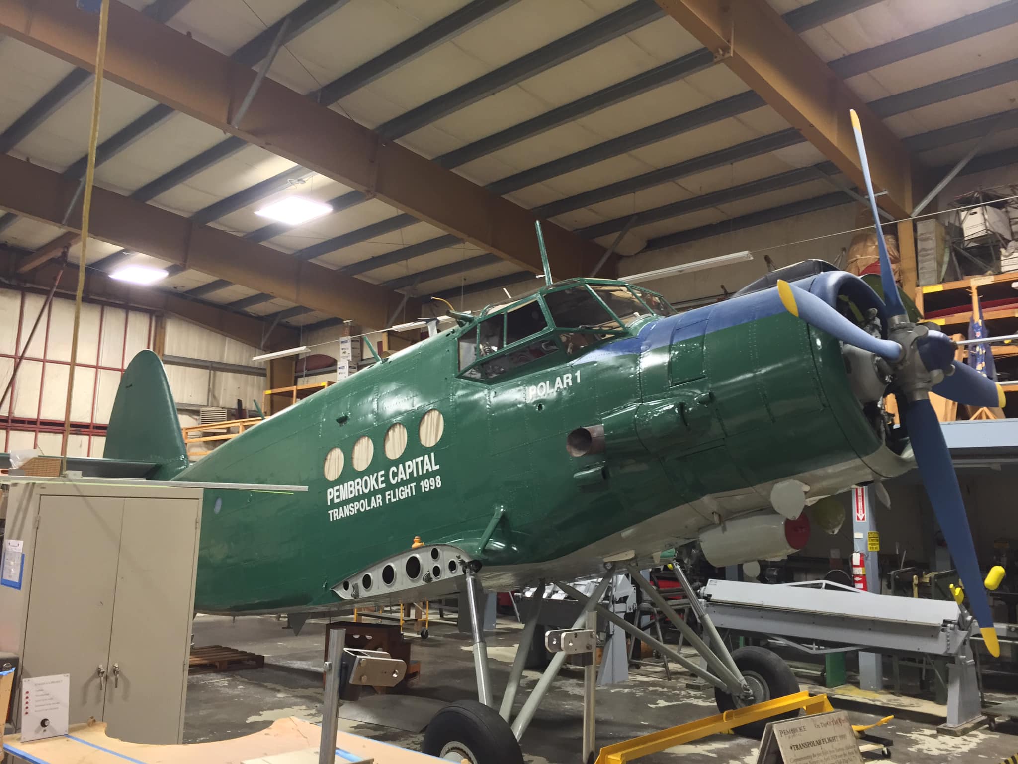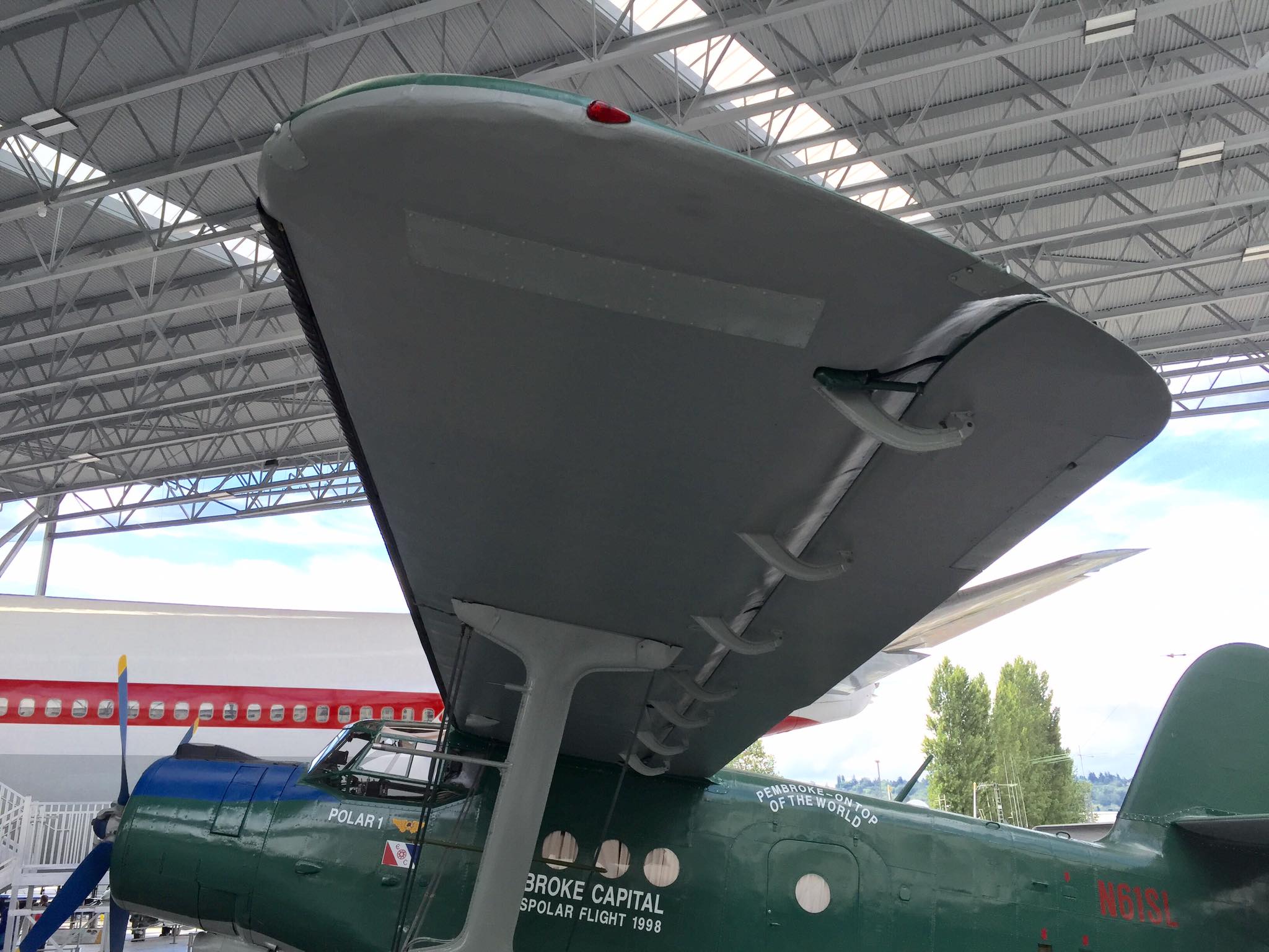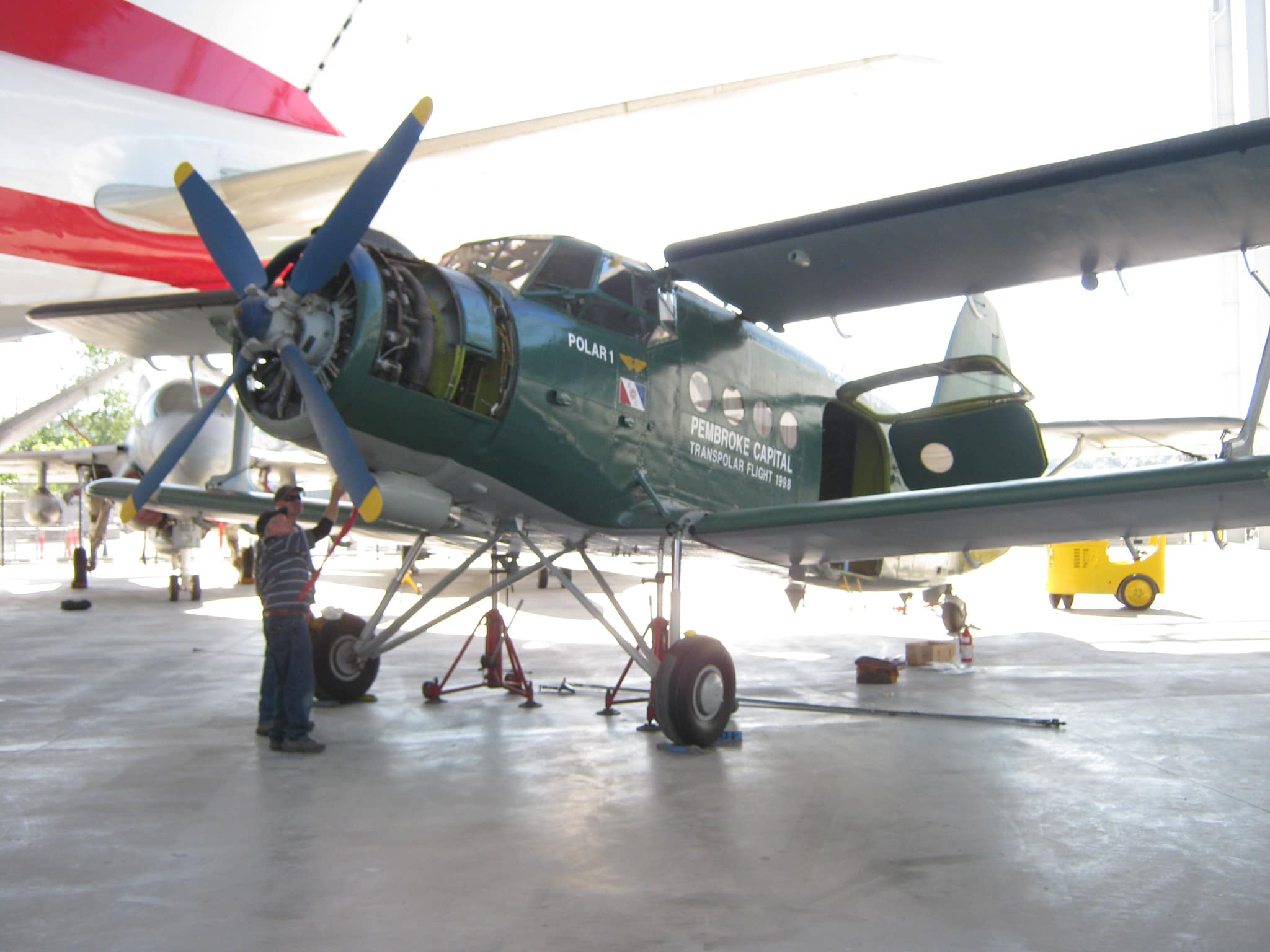 Antonov AN-2R, s/n 1G17527, N61SL, NATO reporting name “Colt” and “Type 22” by the U.S. Department of Defense, “Kukuruznik” (Corn Farmer), and is also known throughout the former Soviet Union block as “Annushka” (Annie) and “Flying Can.” This particular airplane was built in 1977 by PZL Mielec, a Polish aerospace manufacturer that produced more AN-2s than any other at the plant. I find little of the early flight history of this airplane, e.g., 1977 to an unknown owner as CCCP-62504; 1993 to another unknown owner as FLA-01270; until 1996-97, its acquisition and certificate of airworthiness as indicated in the following. As “Polar 1” in a flight ending April 13, 1998, it took part in a flight honoring the ca. 2,200-mile, 20-hour polar flight made in Lockheed Vega, NX3903 in April of 1928 by American aviators Carl Benjamin “Ben” Eielson and George H. Wilkins from Point Barrow, Alaska to Spitsbergen, Svalbard, Norway (see historic photo). Following completion of the honorary flight, this airplane was donated to the Museum of Flight in Seattle (which is the registered owner) by Pembroke Capital of Dublin, one of the sponsors of the transpolar flight, which in turn had hired Shane Lundgren – founder of Air Berlin – as a marketing director for the flight. Note that the polar bear has not yet been added to the tail fin.