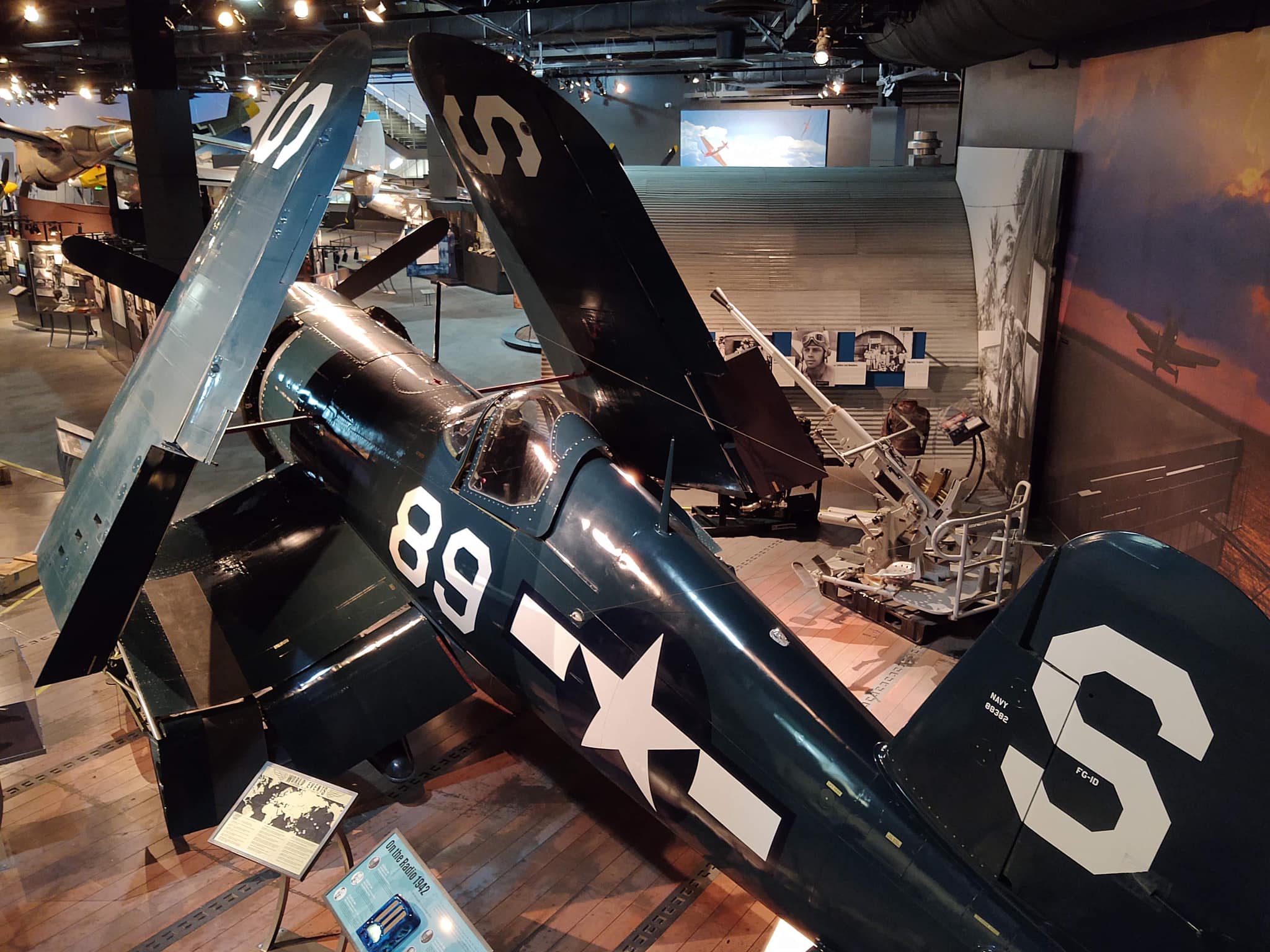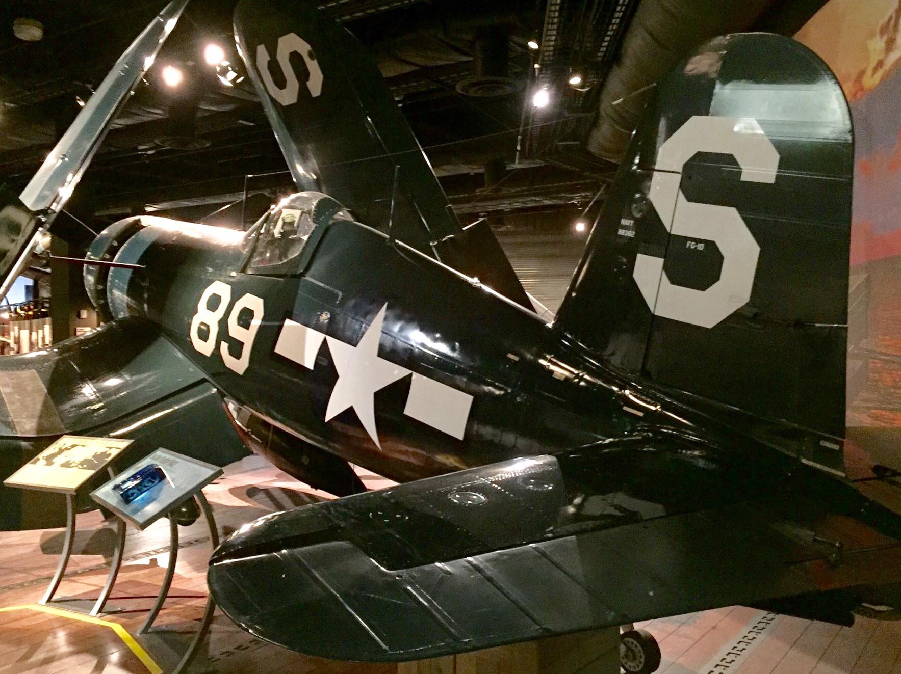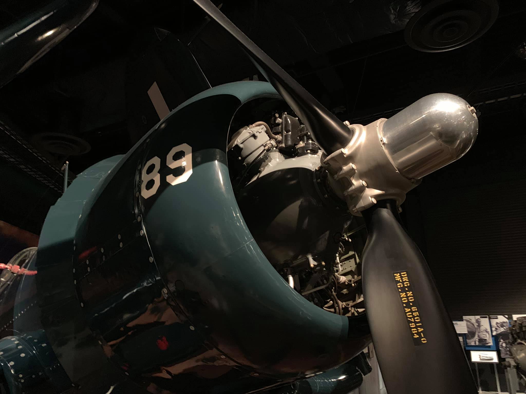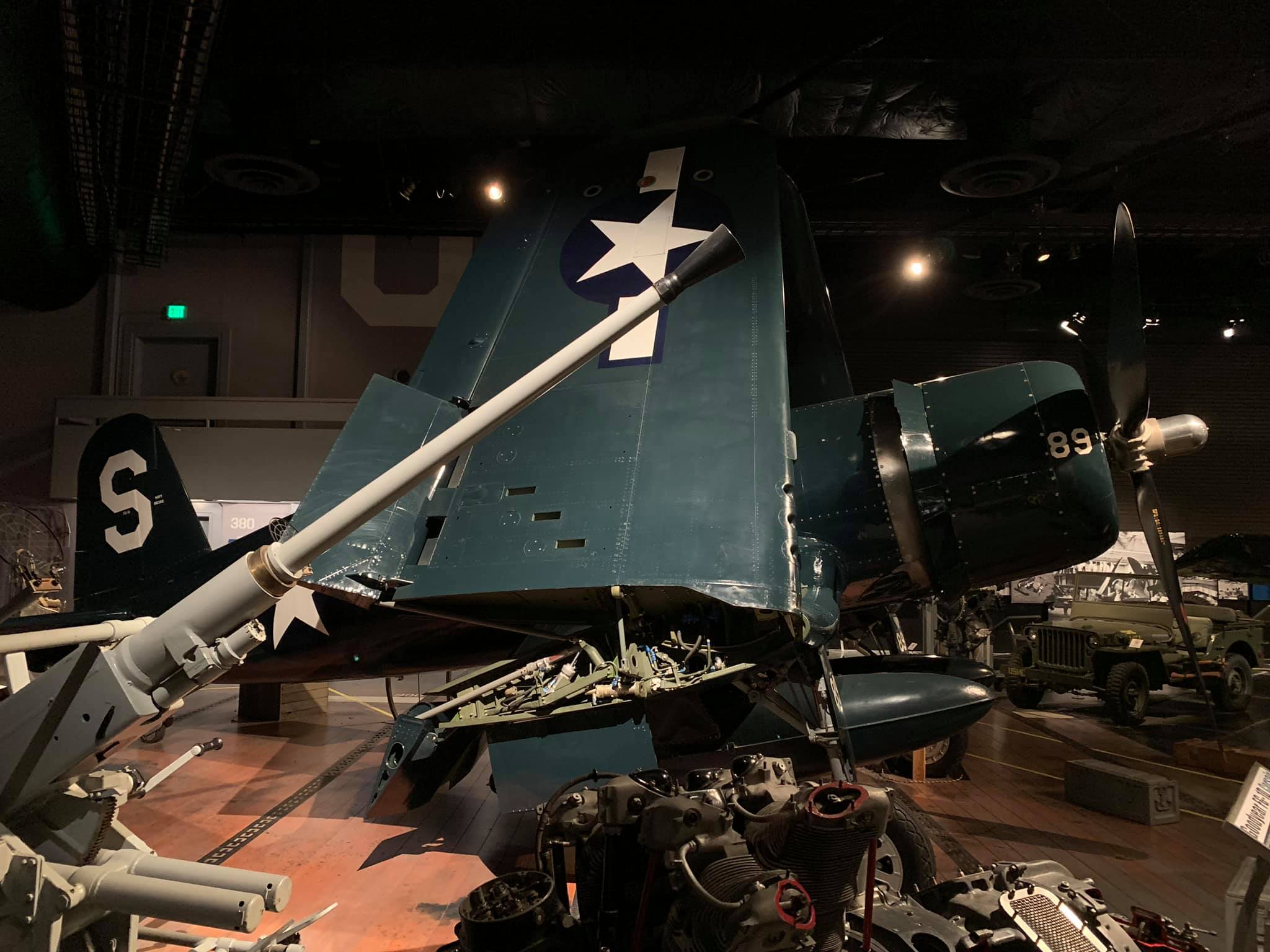 These photos were taken by me, and some are courtesy of Don England, formerly of MOF – thanks very much. Nicknames for the Corsair included: U-Bird, Hog-Nose, Horseshoe, Great Iron Bird, Sweetheart of Okinawa, Super Stuka, The Hog, Bent Wing Bird, Ensign Eliminator, Hosenose, and Whistling Death. The Corsair was designed by Chance Vought Chief Engineer Rex B. Beisel, a graduate of the University of Washington. Fitted with a Pratt & Whitney R-2800-8W Double Wasp engine powering a 13 ft. Hamilton propeller (9 in. clearance between prop tips and ground or carrier deck). Armament varied but could be fitted with six wing-mounted Browning M2 .50 caliber machine guns and 8 HVAR rockets or 2,000 lbs. of bombs from wing hardpoints (the inner undersurfaces of the wings were reinforced). Here is a link to my walkaround: https://www.facebook.com/video.php?v=961619977198993