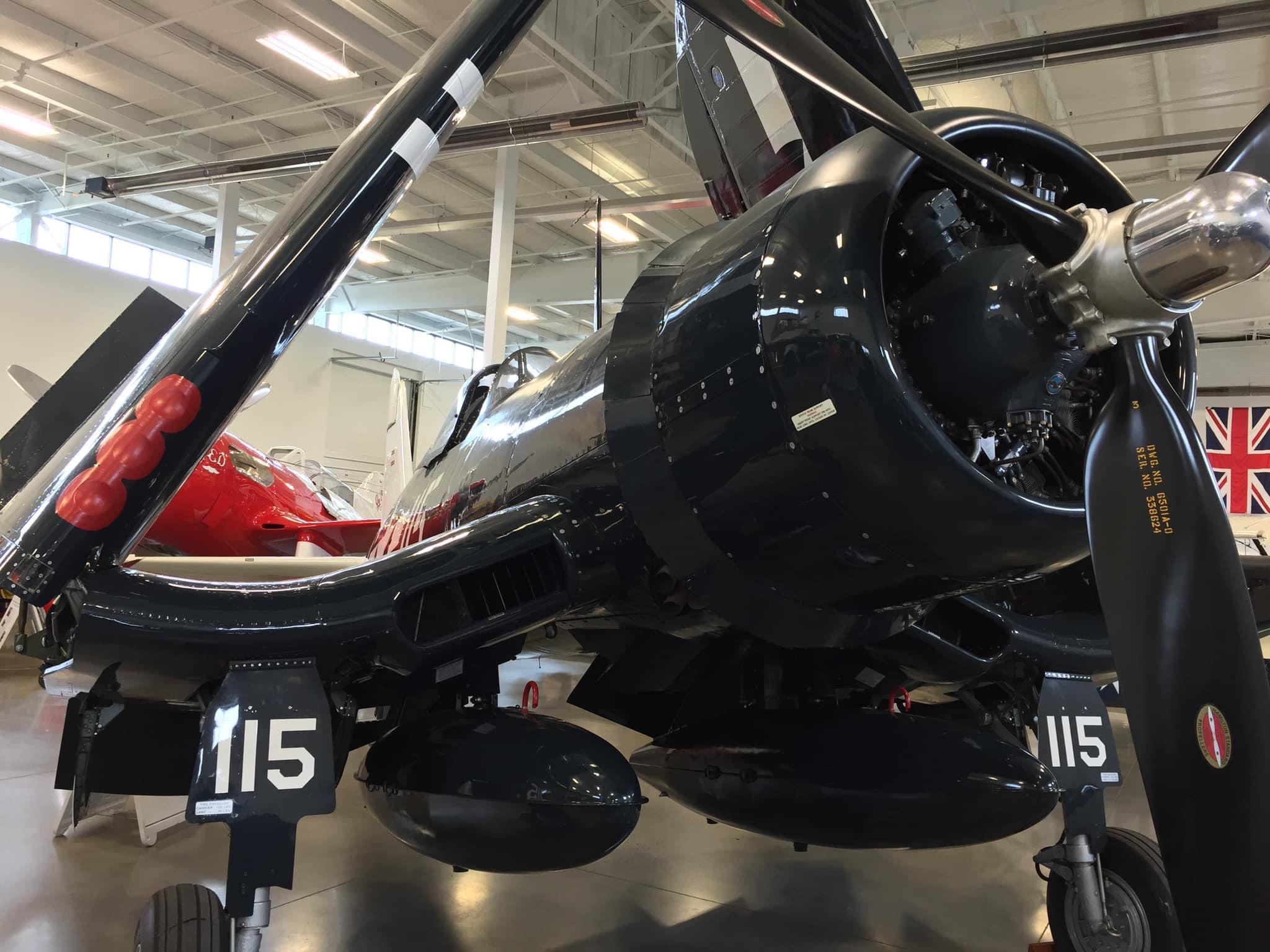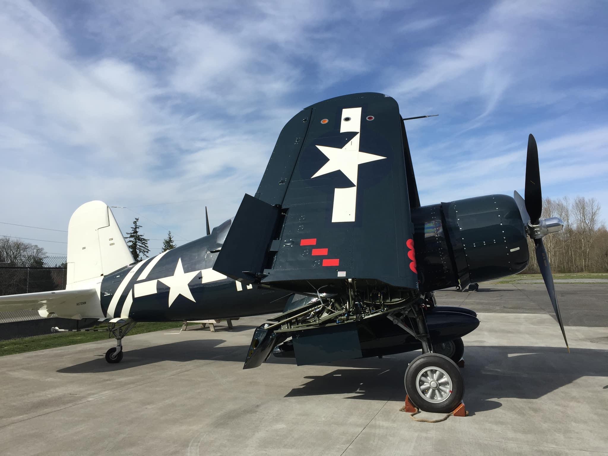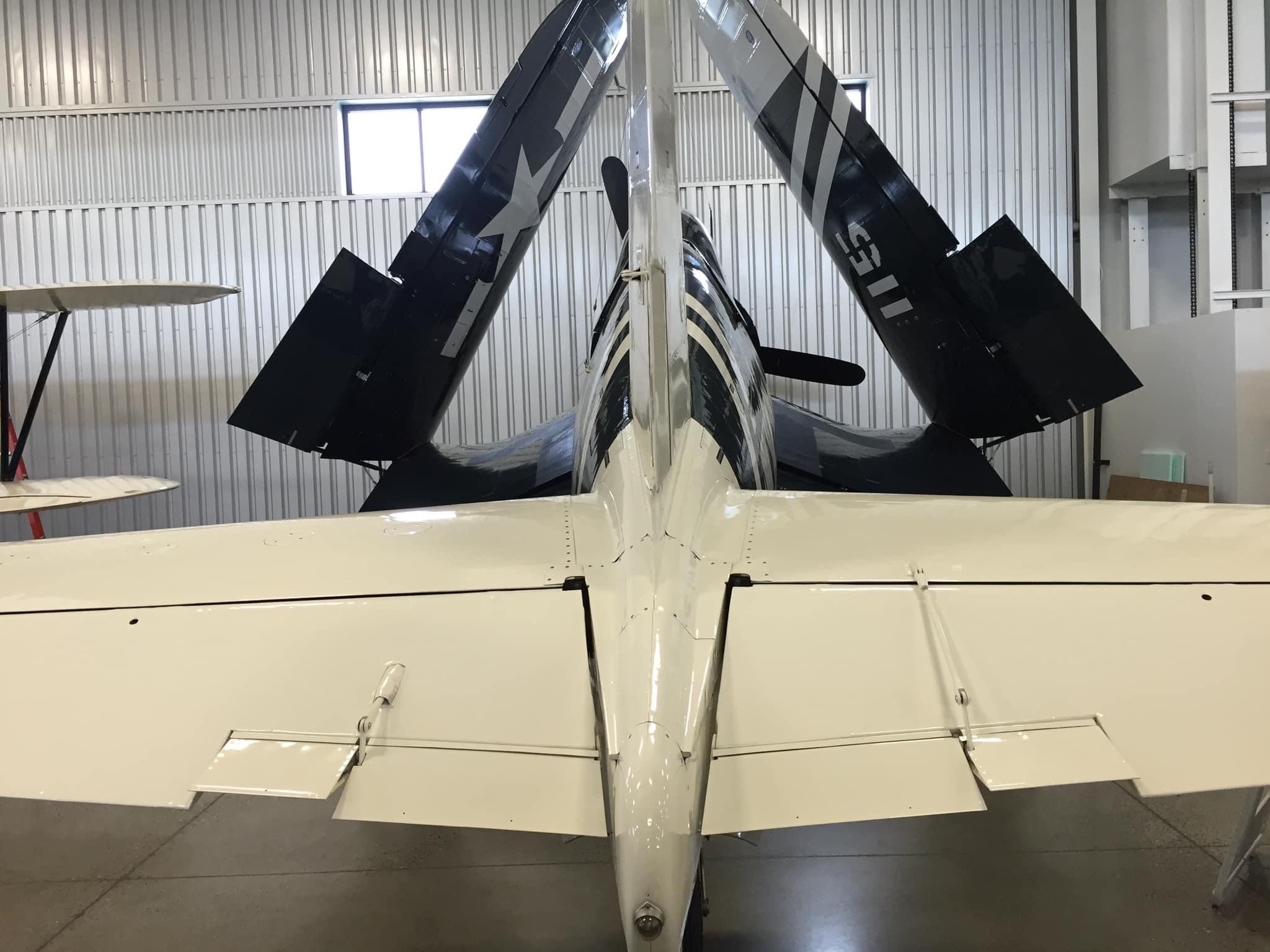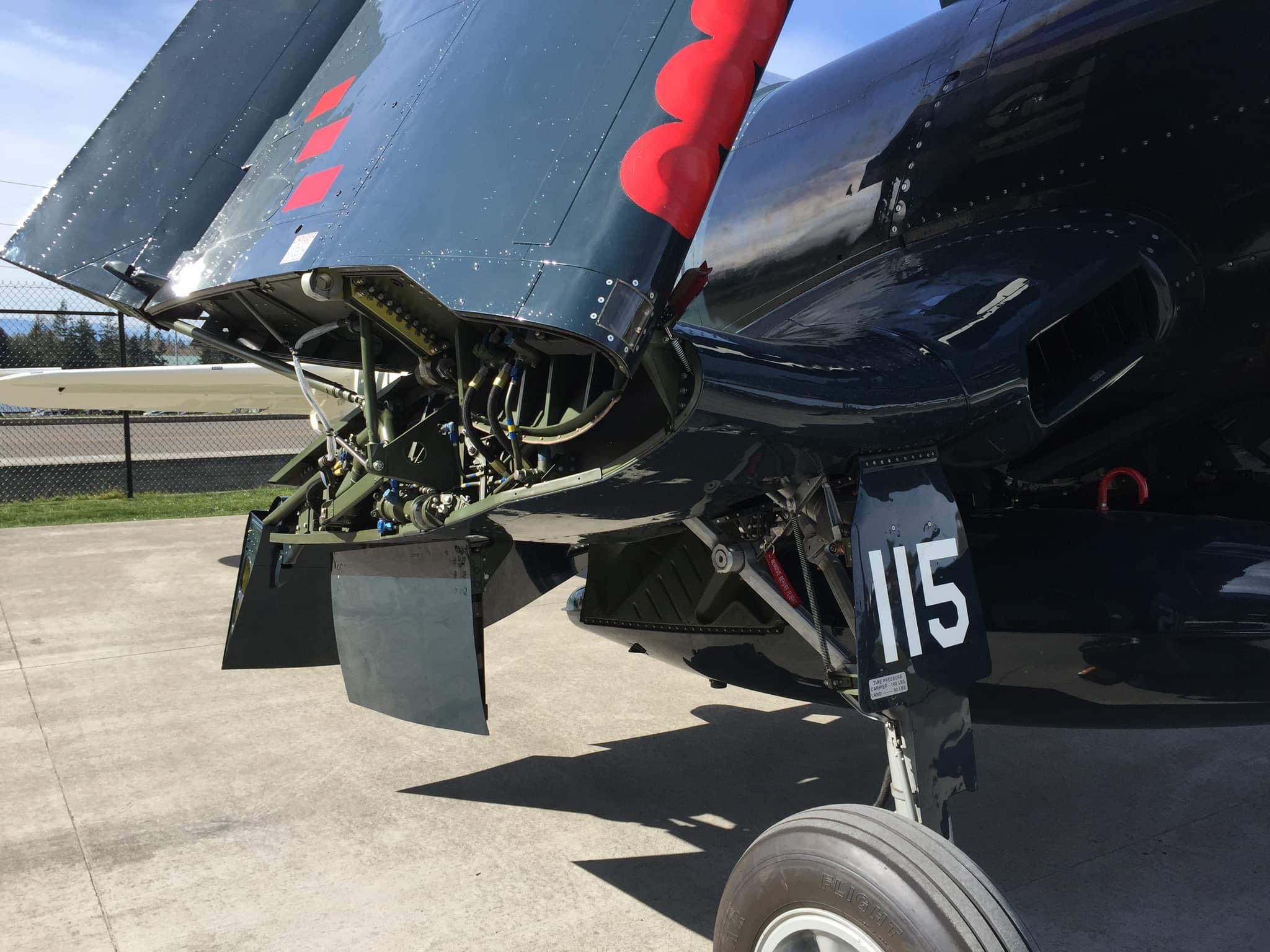 By November of 2019, the FAA issued an airworthiness certificate to owner Charles Somers of Hillsboro, Oregon. It is painted as #115 of VMF-213 (“Hell Hawks”) of the escort carrier USS Saidor, CVE-117, which was based at Pearl Harbor between 1945-46. The restoration includes the pilot relief tube (with black funnel as well as the drain plug under the fuselage), a gun camera in the starboard wing, a landing light in the port wing, catapult hooks and a starboard wing torque spoiler. Of course, the seat cushion is not authentic period gear! My photos and YouTube clips. https://youtu.be/29U6zUwLrxI https://youtu.be/AAK_5wLPG3s https://youtu.be/tQl1G6pTvCs https://youtu.be/sRvbfXvrZpY
