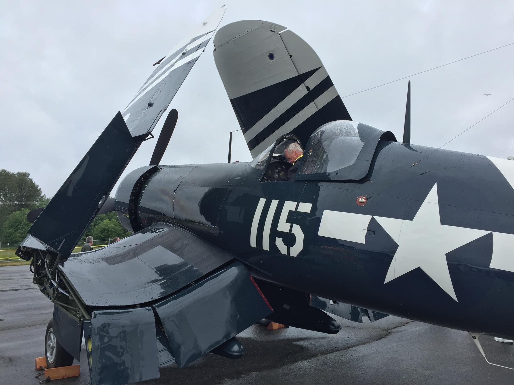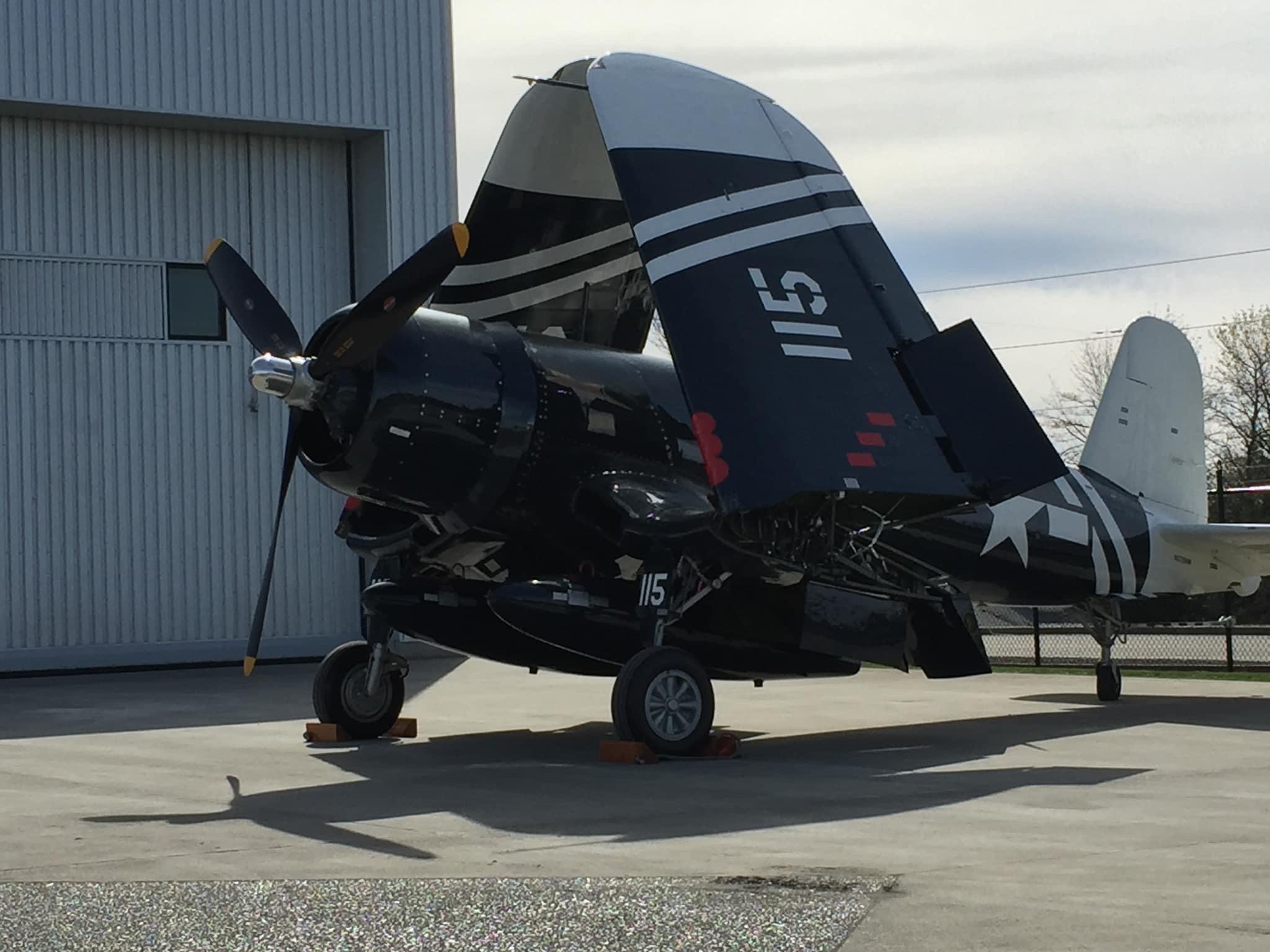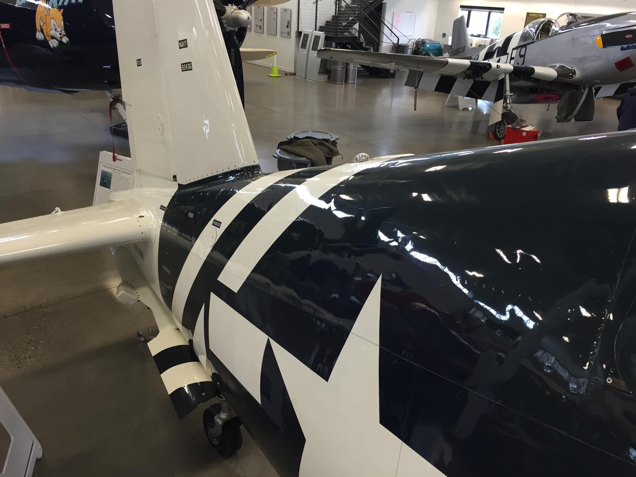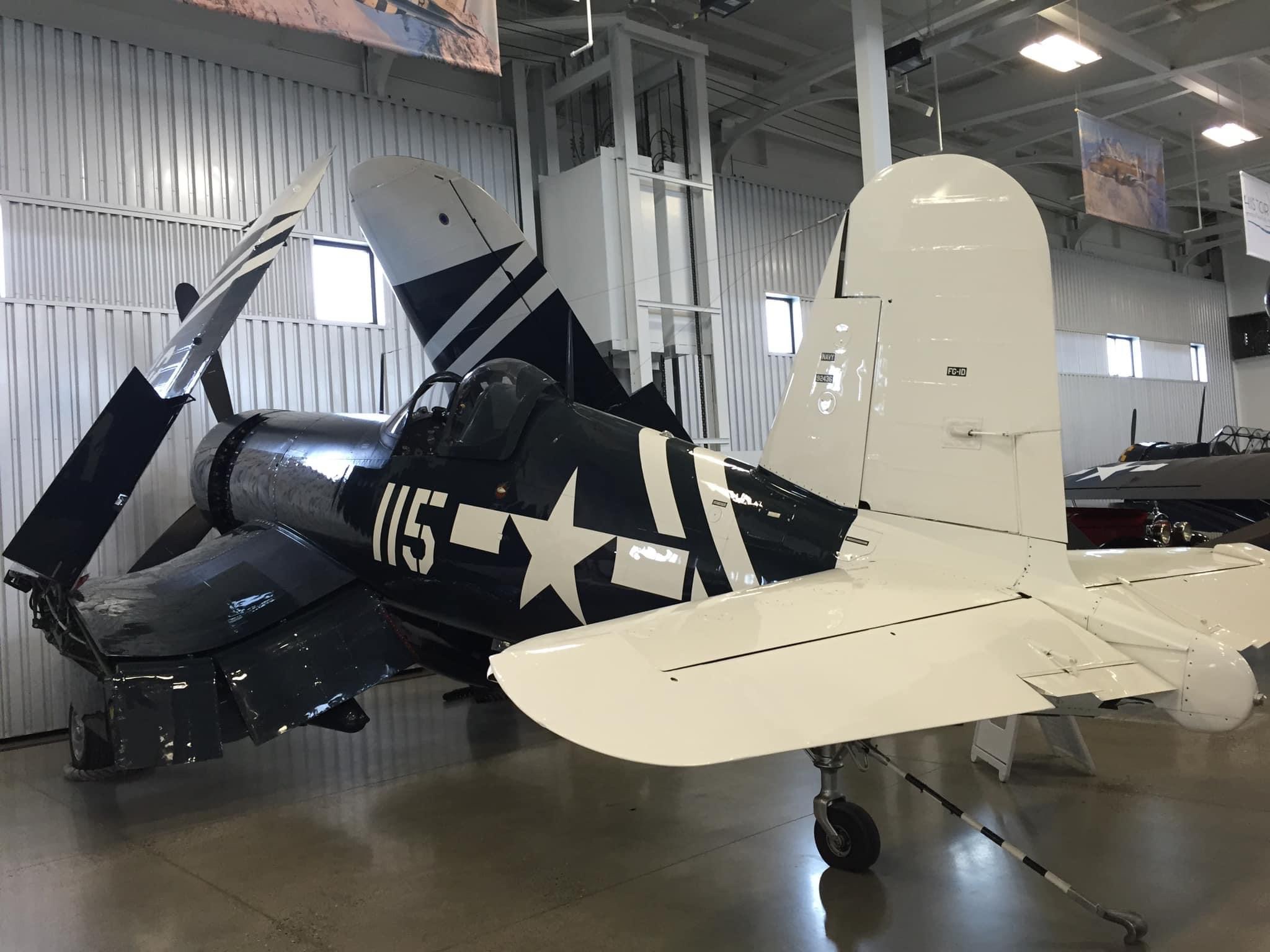 By November of 2019, the FAA issued an airworthiness certificate to owner Charles Somers of Hillsboro, Oregon. It is painted as #115 of VMF-213 (“Hell Hawks”) of the escort carrier USS Saidor, CVE-117, which was based at Pearl Harbor between 1945-46. The restoration includes the pilot relief tube (with black funnel as well as the drain plug under the fuselage), a gun camera in the starboard wing, a landing light in the port wing, catapult hooks and a starboard wing torque spoiler. Of course, the seat cushion is not authentic period gear! My photos and YouTube clips. https://youtu.be/29U6zUwLrxI https://youtu.be/AAK_5wLPG3s https://youtu.be/tQl1G6pTvCs https://youtu.be/sRvbfXvrZpY