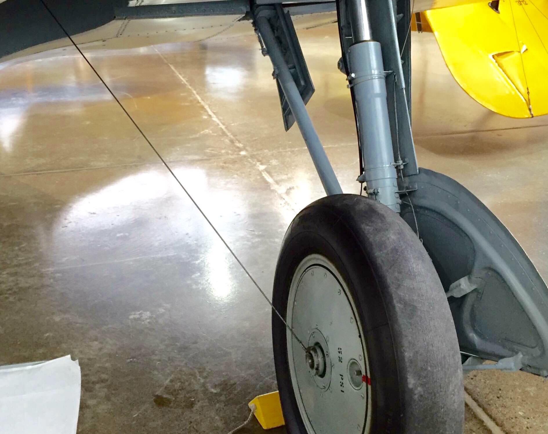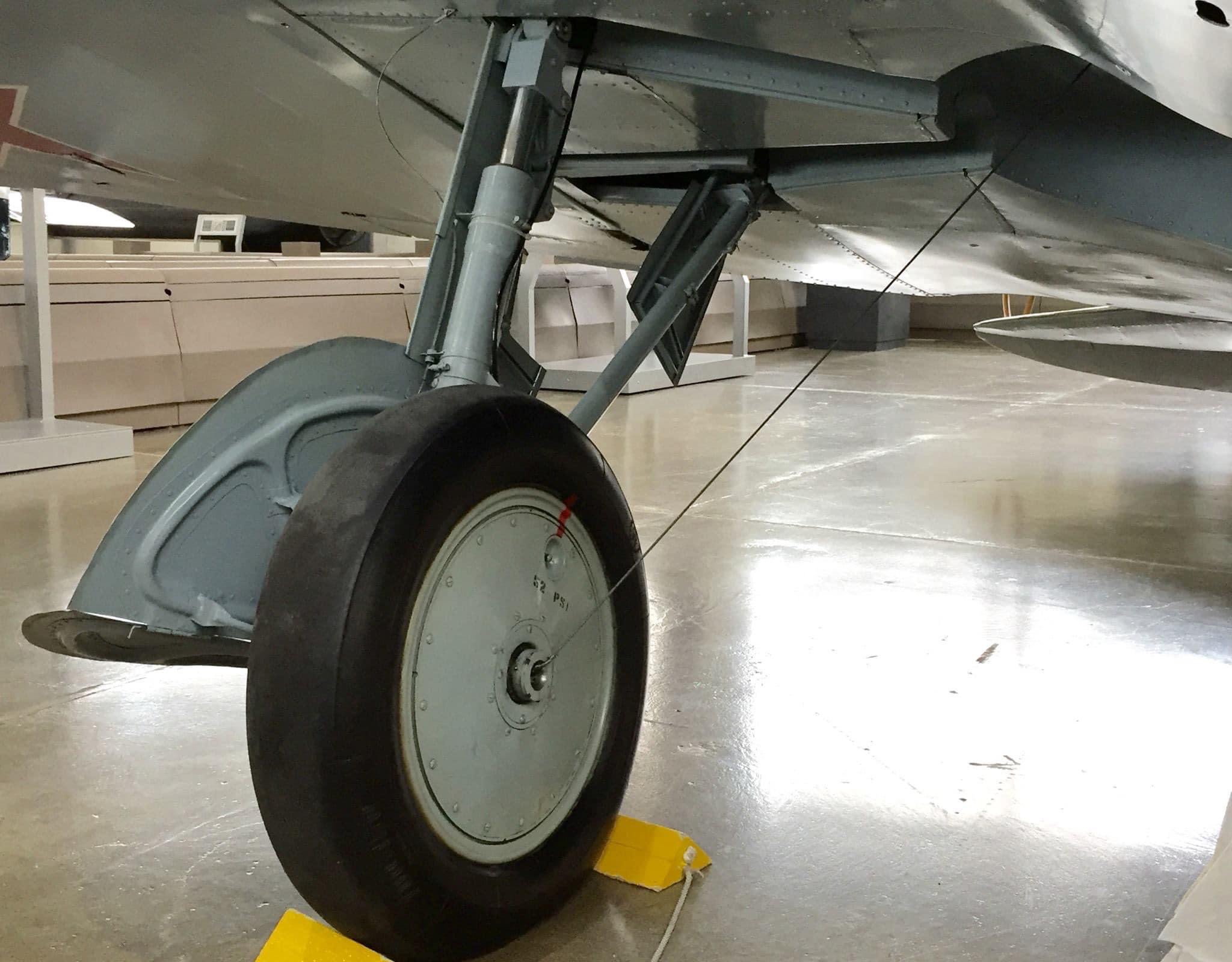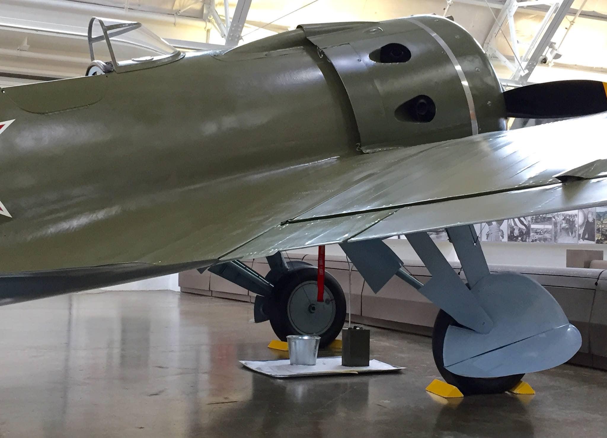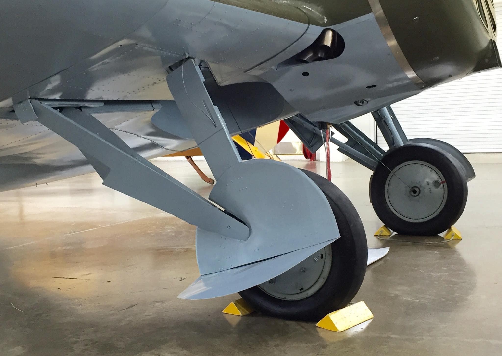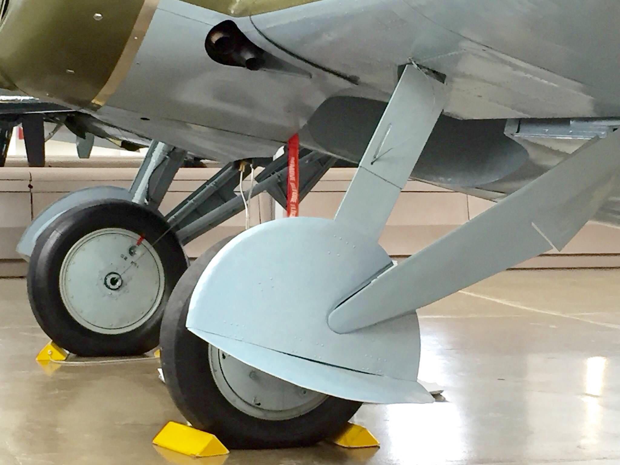 Similar to the Grumman Duck and Grumman F4F Wildcat, the undercarriage was retracted and lowered by a hand crank in the cockpit (located on the starboard side). However, unlike the Wildcat with its “bicycle chain” mechanism, the I-16 undercarriage was controlled directly with a screw-jack with cables attached to the wheel hubs. It takes 44 hand cranks by the pilot to raise and lower the gear (I am told it is easier than that of the Wildcat). Pilots were provided with wire-cutting shears to sever the cables on landing if the mechanism jammed or if the pilot was incapacitated, leaving the gear to deploy by gravity. The landing gear fairings are hinged. Skis were fitted for winter operations, and in some cases were retractable, pulling up under the cowling.