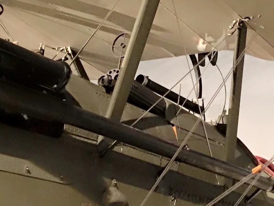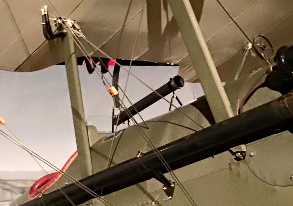 Its designer, George (Gogu) Constantinescu (Anglicized to Constantinesco), was a Romanian-born civil engineer working in Britain at the outbreak of war. His patented process was introduced in 1916 and transmitted sonic pulses through a liquid column. The other gun was a Lewis .303 mounted on the upper wing with a Foster Mount fired by the pilot pulling a ring attached to a Bowden Cable. The ammunition drum was changed by sliding the gun down on the Foster Mount’s rail. The Foster Mount was invented by Sgt. R.G. Foster, No. 11 Squadron, RFC. To aim the guns, the pilot has an Aldis collimator gun sight, which was mounted just ahead of the cockpit windscreen. The aircraft could carry up to four drop bombs. The undercarriage was of the standard V-type with the struts joined by a horizontal tube with steel cables for strength and stability. The shock absorbers were also standard Bungee cords (“bungee” or “bungie” is thought to be British slang for India-produced rubber).