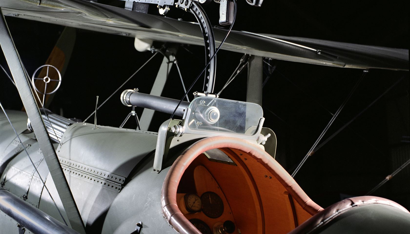 View of the cockpit of the Museum of Flight’s Royal Aircraft Factory S.E.5a reproduction. Note the wing-mounted Lewis machine gun and gunsight. (The Museum of Flight)