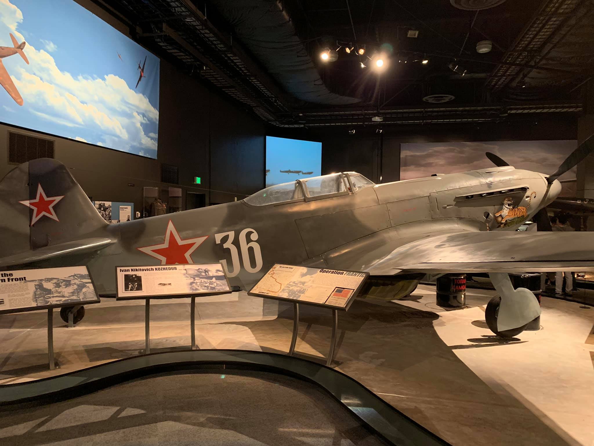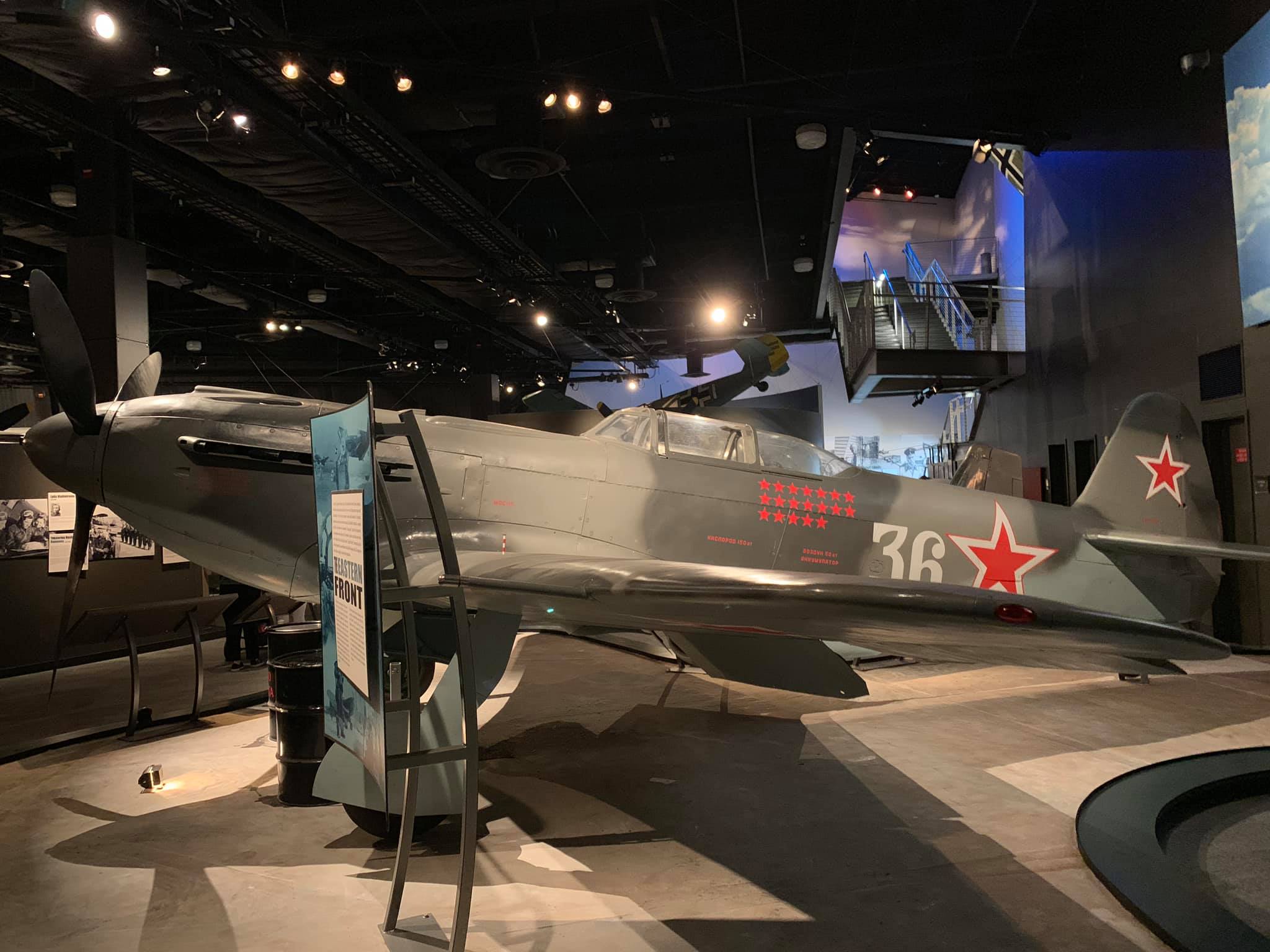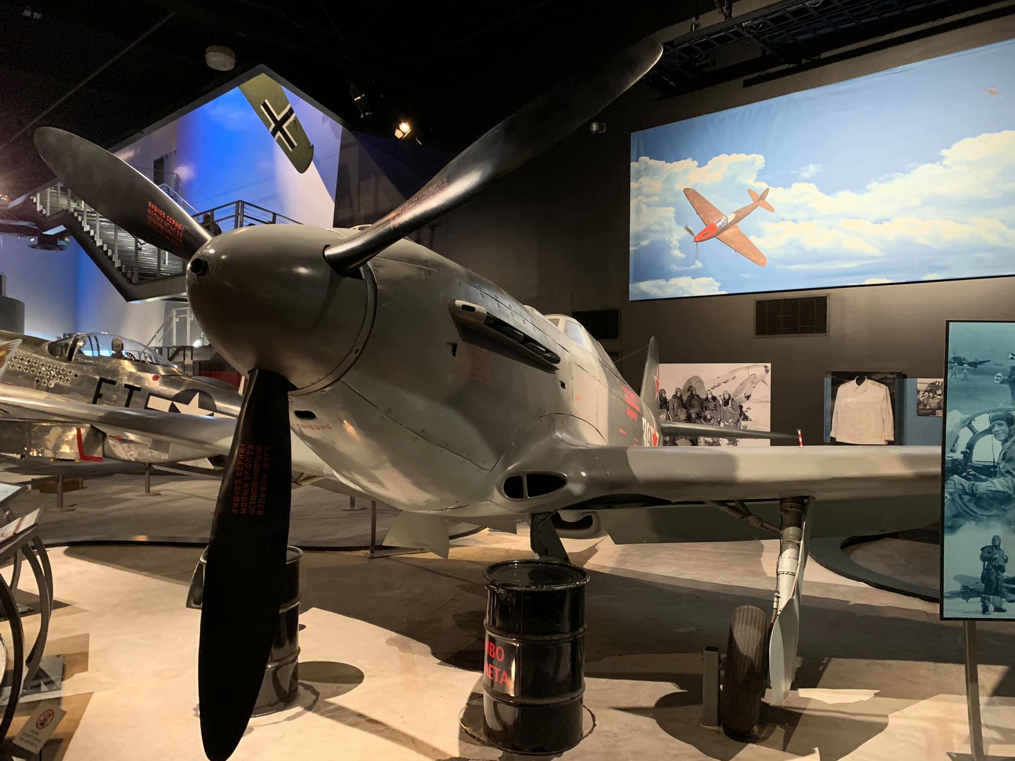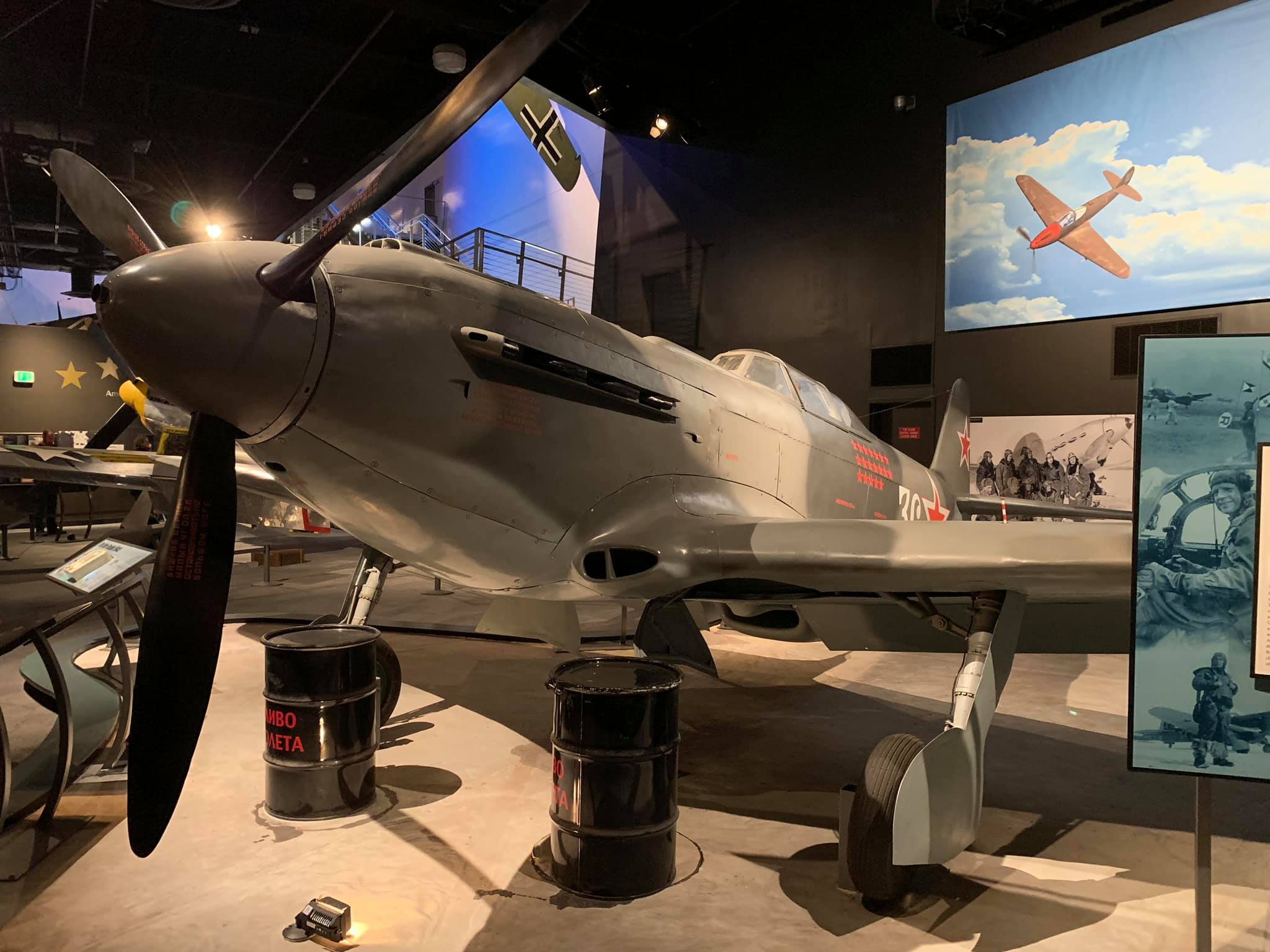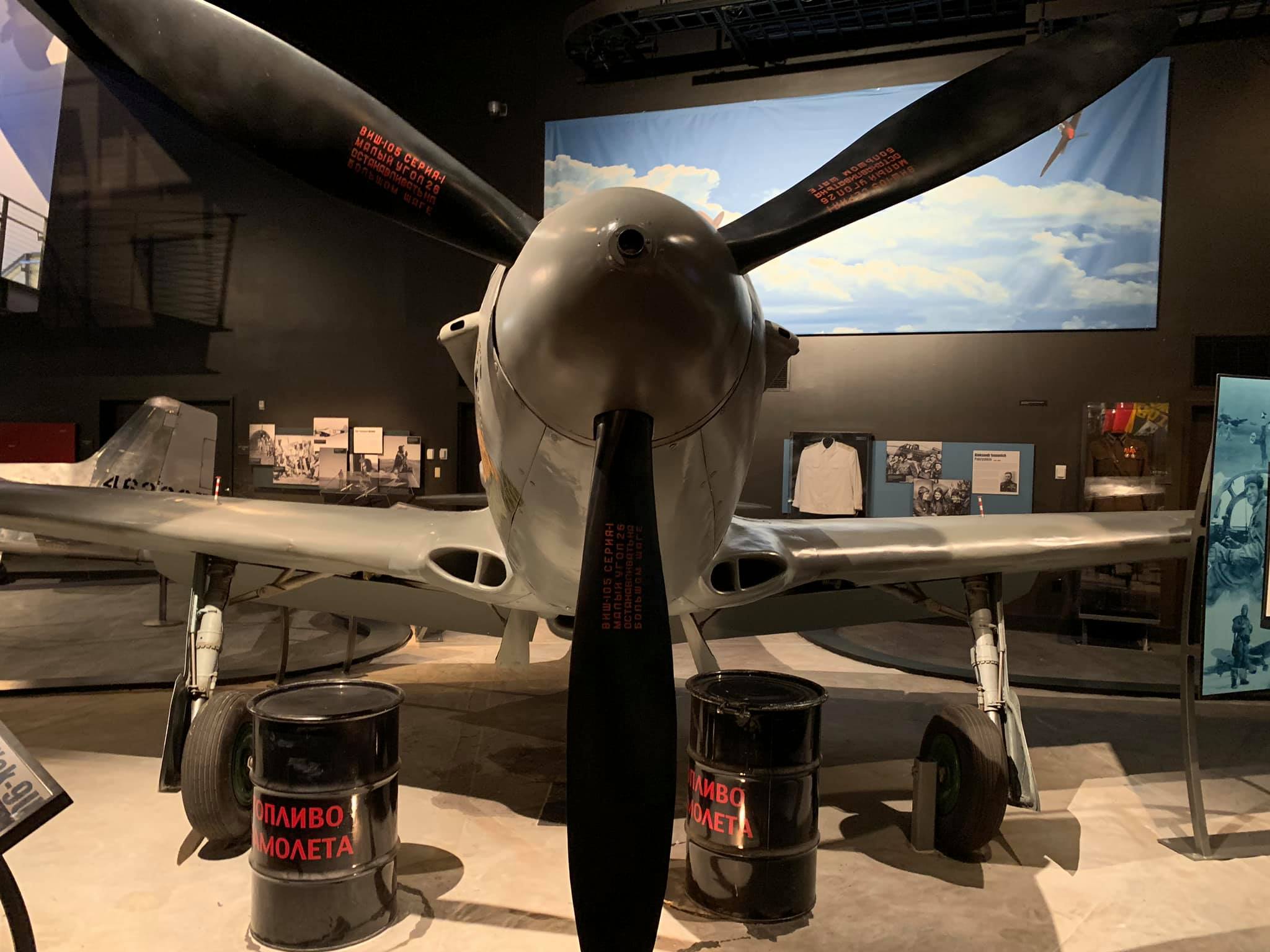 It was rebuilt initially in Moscow by a team arranged by Sergei Kotov and then sent to the Champlin Collection in Mesa, Arizona, in 1996. Russian-made parts on the aircraft include a Klimov engine, the propeller, instrumentation, and other miscellaneous parts. It is painted in the markings of Soviet World War II ace Gen. Georgiy Baevski (19 victories) of the 5th Guards Fighter Aviation Regiment (GIAP, the English equivalent of the Russian Cyrillic acronym) of 1945 and is now on static display at the Museum of Flight, Seattle, Washington. My photos.