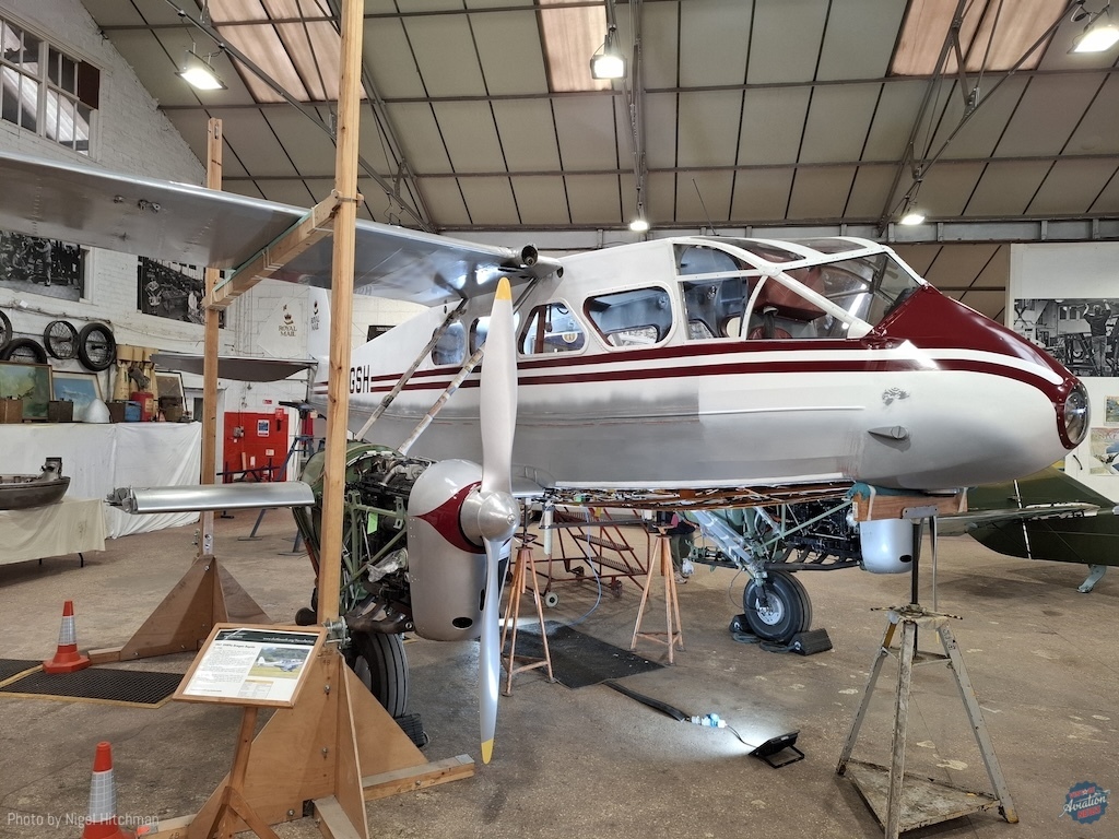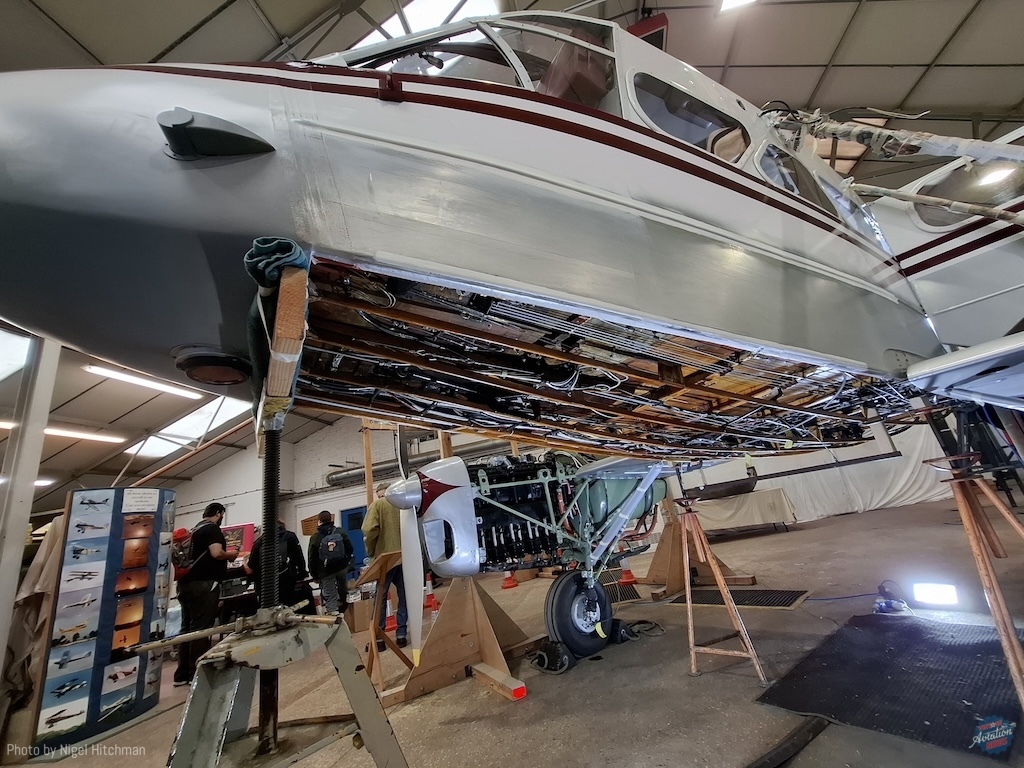 The de Havilland DH89A Dragon Rapide G-AGSH is owned by Philip Meeson, but operated by the Shuttleworth collection. It was completely dismantled to replace some wing center section parts showing signs of corrosion and the opportunity was taken to completely uncover the structure and inspect it and re-cover the aircraft, which will be painted back in the same BEA colors it previously wore. With the underside of the fuselage still uncovered for systems installation, it’s only been painted part way down the side of the fuselage.