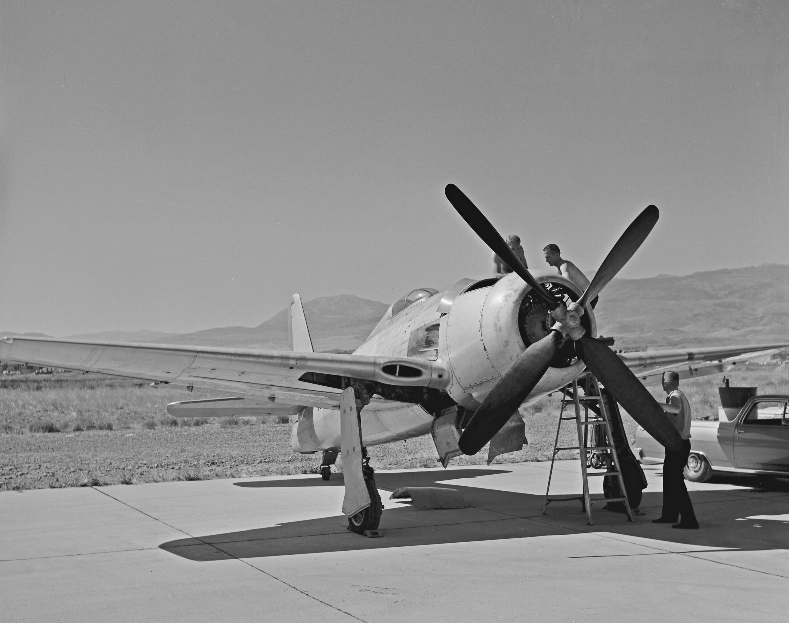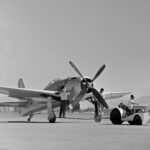 Darryl also continued the weight reduction program on the aircraft. The electrical system was removed and a dry cell battery replaced the heavyweight lead-acid battery. The hydraulic system was also removed except for the retraction cylinders for the landing gear. The gear was retracted by a nitrogen bottle and extended by gravity. These modifications reduced the Bearcat’s weight by approximately 700 lbs. Darryl also gave the Bearcat what every racing plane needs- more power! The stock R-2800-34W was replaced by an R-2800-83W with a nose case from a -44 with a 0.35:1 gear ratio. Darryl said of the new series of mods, “The nose case allowed the propeller to turn slower. The prop was from a Douglas Skyraider and was 13’ 6” in diameter, much larger than a standard Bearcat prop. Because of this my take-offs and landings had to be in a three-point attitude, if I brought tail up too much the prop would strike the ground. Visibility and directional control was never a problem though.”