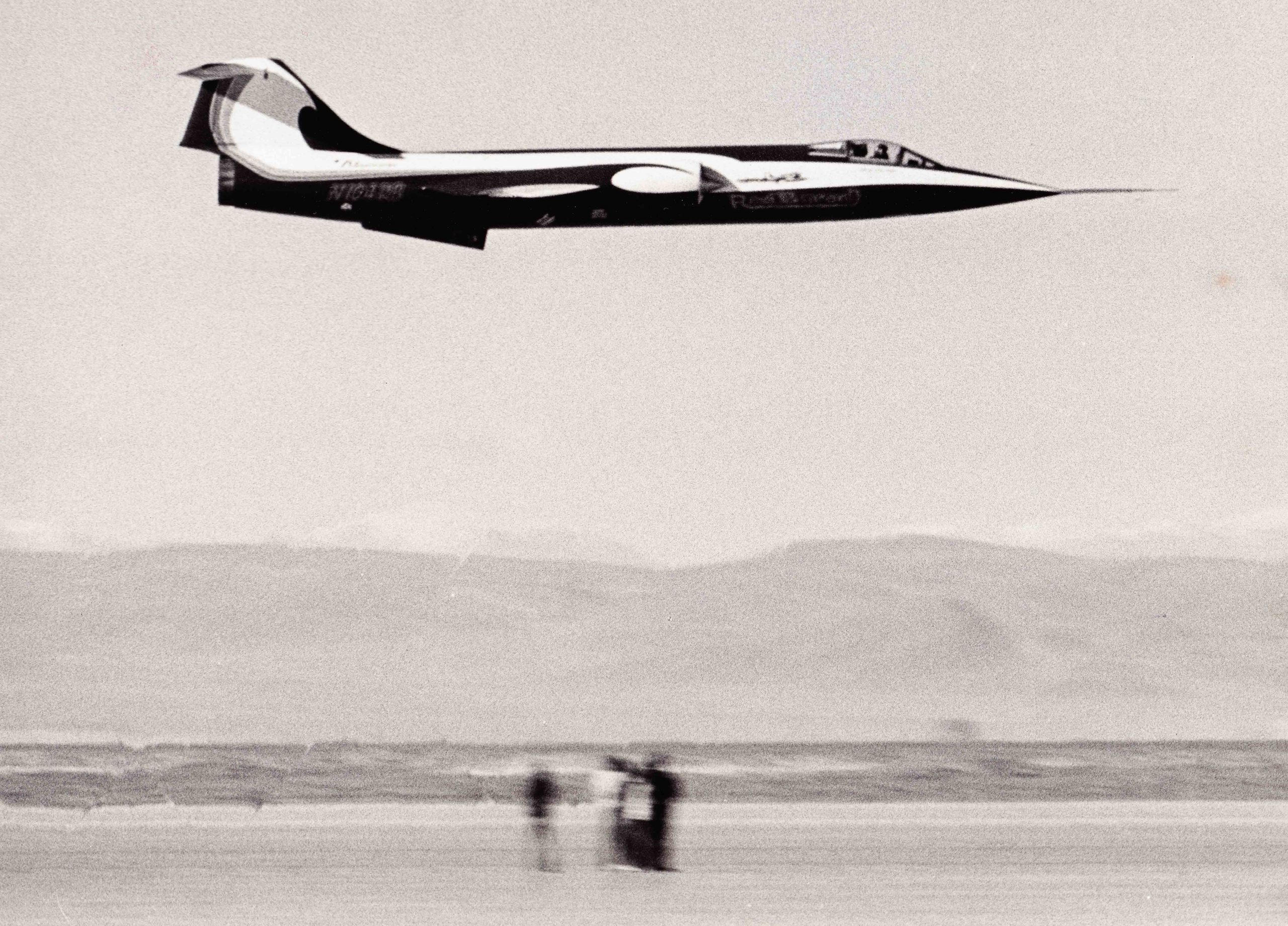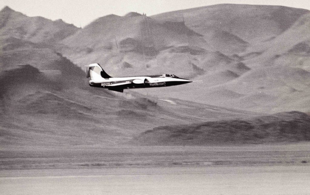 On October 24, 1977, shortly after 1100 hrs, timing and photographic personnel, crewmembers, and spectators were all in place out in the middle of the lake bed. It was completely and utterly silent. At 1120 hrs, the silence was broken when voices of spotters up in the hills crackled on the radio, “Here he comes!” Cameras and timers were switched on as everyone squinted towards the eastern horizon. In the 2012 interview,w former Air Classics writer Bruce Treadway told the author, “I have never seen anybody fly an airplane like Darryl flew that F-104. To this day, I don’t know how he did it. He was so precise and smooth run after run. My camper was parked in the middle of the course to help give Darryl a depth perception. I watched the runs from the roof. I would pick him up in the distance as he approached the lakebed, seconds later he zipped over my head. By the time I turned around he was out of sight! The ground really shook when the sonic boom hit. The whole run took just seconds. The speed was absolutely stunning. It was hard to comprehend. After he’d passed, I noticed the shockwave had sucked dust into the air. I could not see it as he approached, and it cannot be seen in photographs, but I could see and smell it as it hung in the air for a few minutes.”