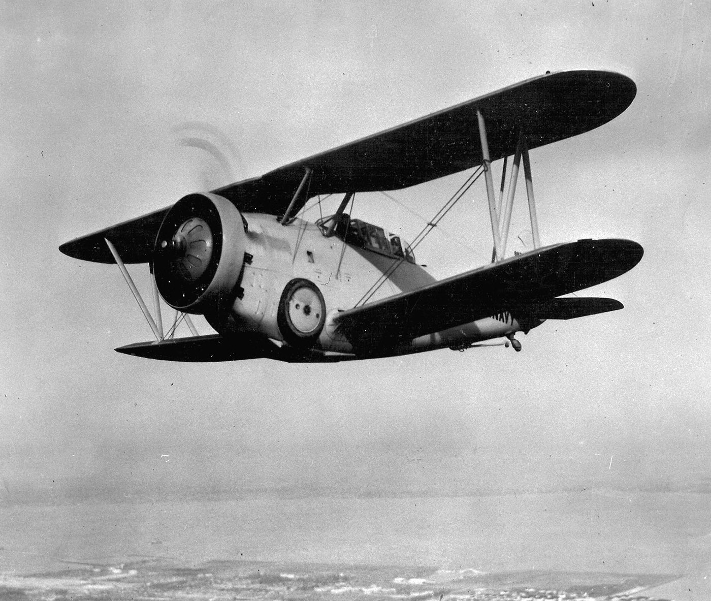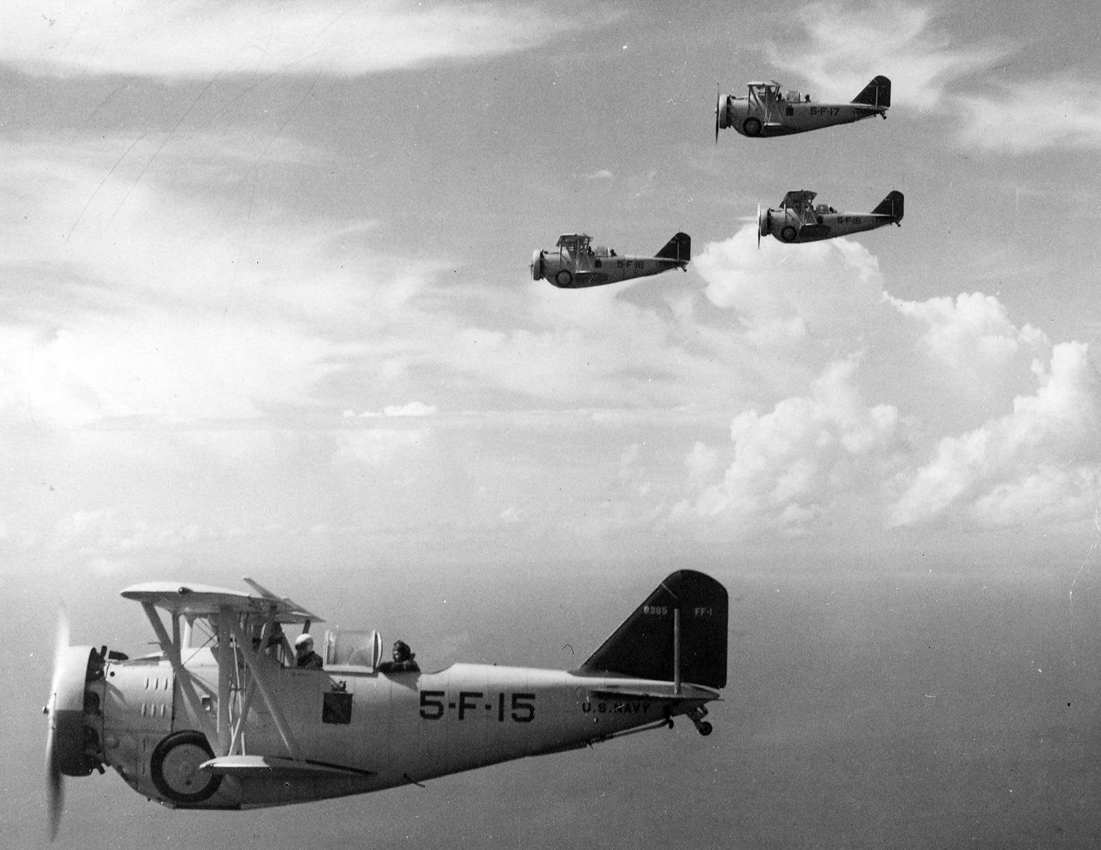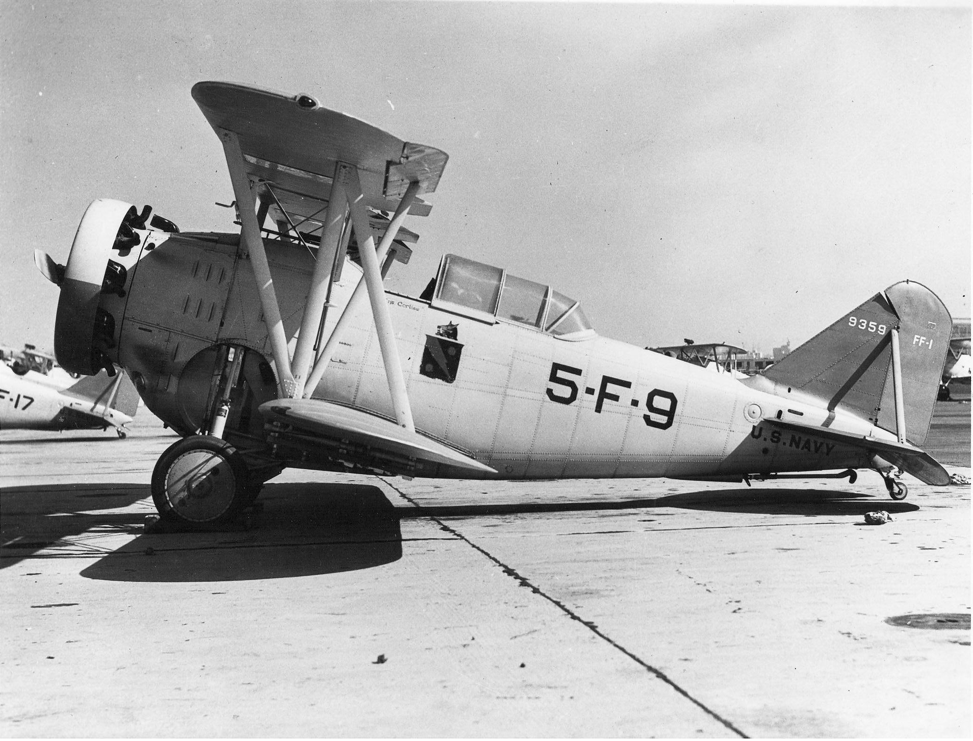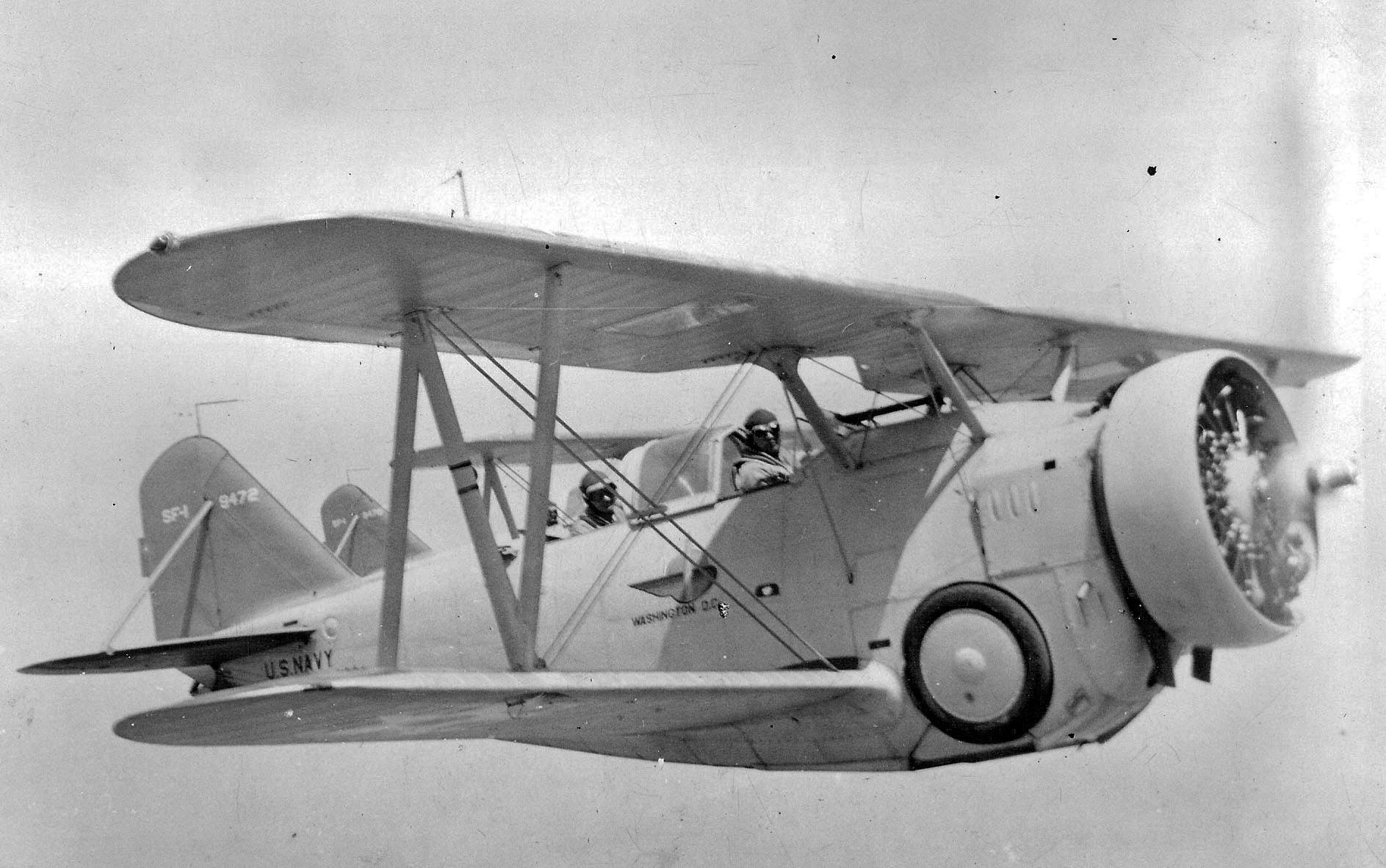 In USN service, the Grumman FF-1 earned the nickname “Fifi” from its flight crews as a play on the aircraft’s designation. The FF-1s primarily saw service both with Naval Air Stations across the United States, and at sea aboard the carrier USS Lexington (CV-2). Armament for the two-seat fighters consisted of two .30 caliber M1919 Browning machine guns mounted in the nose, synchronized to fire through the propeller arc, and either a single .30 caliber machine gun or a single .50 caliber Browning M2 machine gun installed on a flexible mount for the rear gunner/observer. Secondary armament would consist of either two 100 lb. M30 bombs or two 116 lb. Mk4 bombs carried on external racks mounted to the underside of the bottom set of wings.