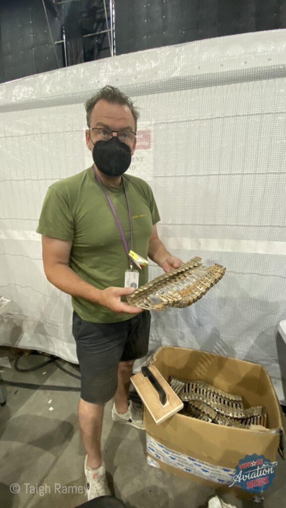 As you can imagine, the feed chutes that have been buried for 75 years, are pretty beat up. Their saving grace is that they were made from stainless steel so they didn’t corrode away like most other metals did but they were seriously bent and twisted. Dave and others made wood former’s to straighten them out and get them looking good once again. Dave had one chute that had heavy visible wear inside of it from all of the ammo that had passed through it during the war. For all we know, it could have actually been on the Regensburg raid! I thought it was really cool that original 8th AF ammo chutes were used in the series.