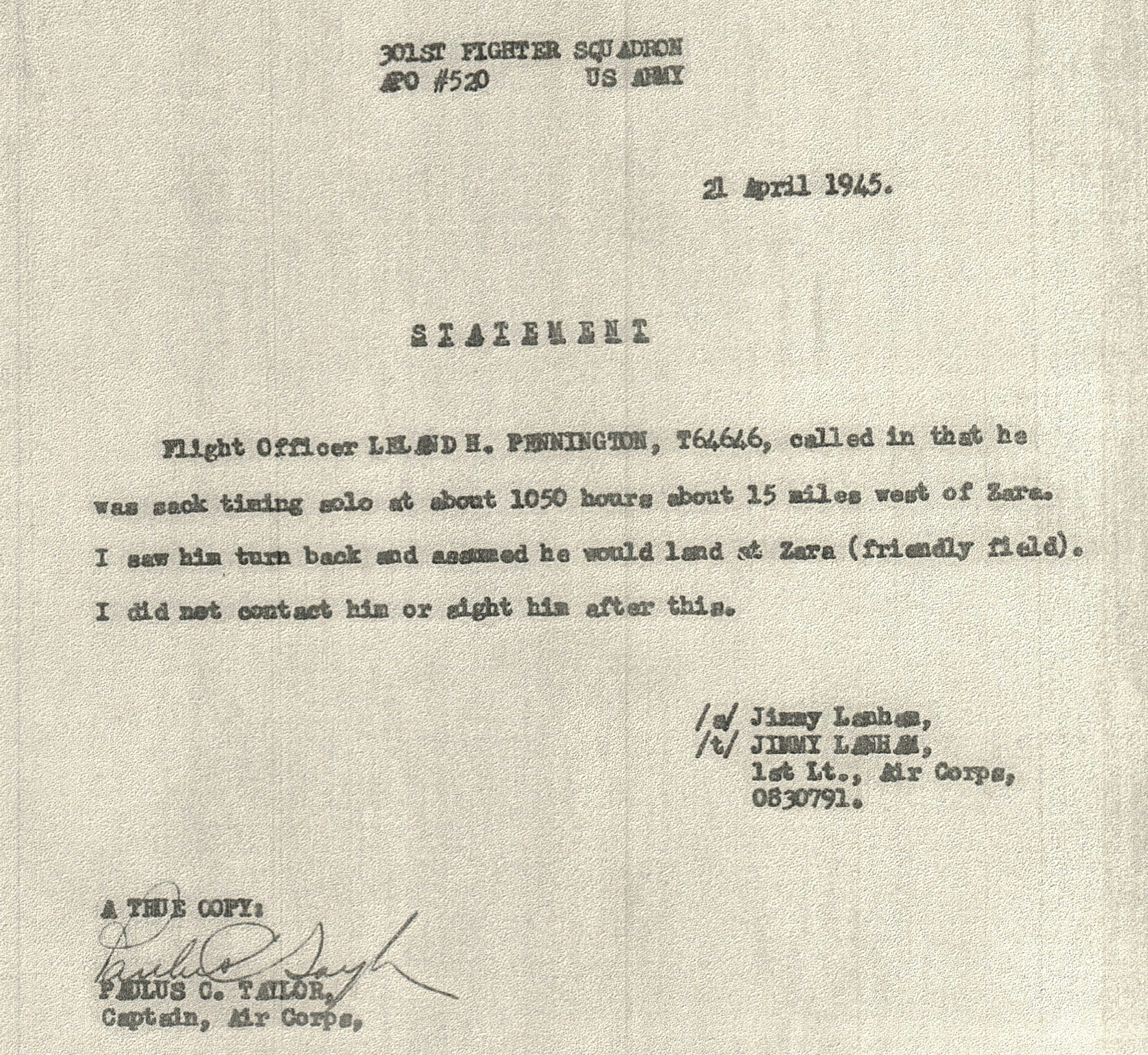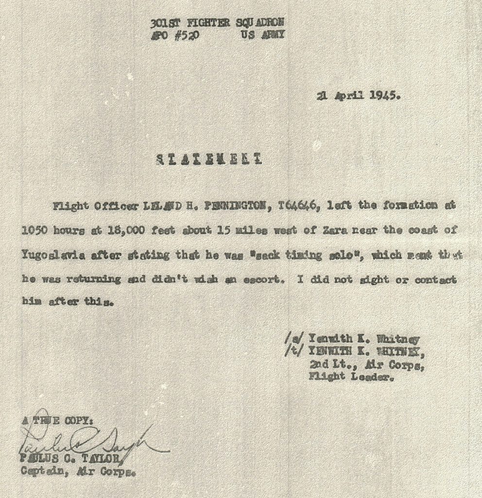 I delayed opening the envelope until later that evening, so I could have motivation to get through the rest of the day. Once I unwound from a chaotic, but productive day of courses and work, I sat down and opened up the letter. I was simply in awe. What sat before me was a complete narrative of Leland’s last mission, or so I thought at the time (more on that later.) At the top of the papers, a summary of the mission on the day Leland went missing. It was an escort mission, protecting B-24 Liberators of the 49th Bomb Wing over the Attnang-Pucheim Marshalling Yards, in Austria. I turned the page, and was next met with a map of where Leland was last seen. He was spotted about 15 miles west of Zara, Yugoslavia (now Croatia.) Leland radioed to his wingmen, 2nd Lt. Yenwith Whitney and 1st Lt. Jimmy Lanham, that he was “Sack timing solo” and did not require assistance. The later information came from the next two pages in the MACR, witness statements from those who flew with him that day. As I turned to the last page of the MACR package, sent to me by the AFHRA, my heart skipped a beat. The final page, a summary of Leland’s MIA mission, included complete information on his airplane: