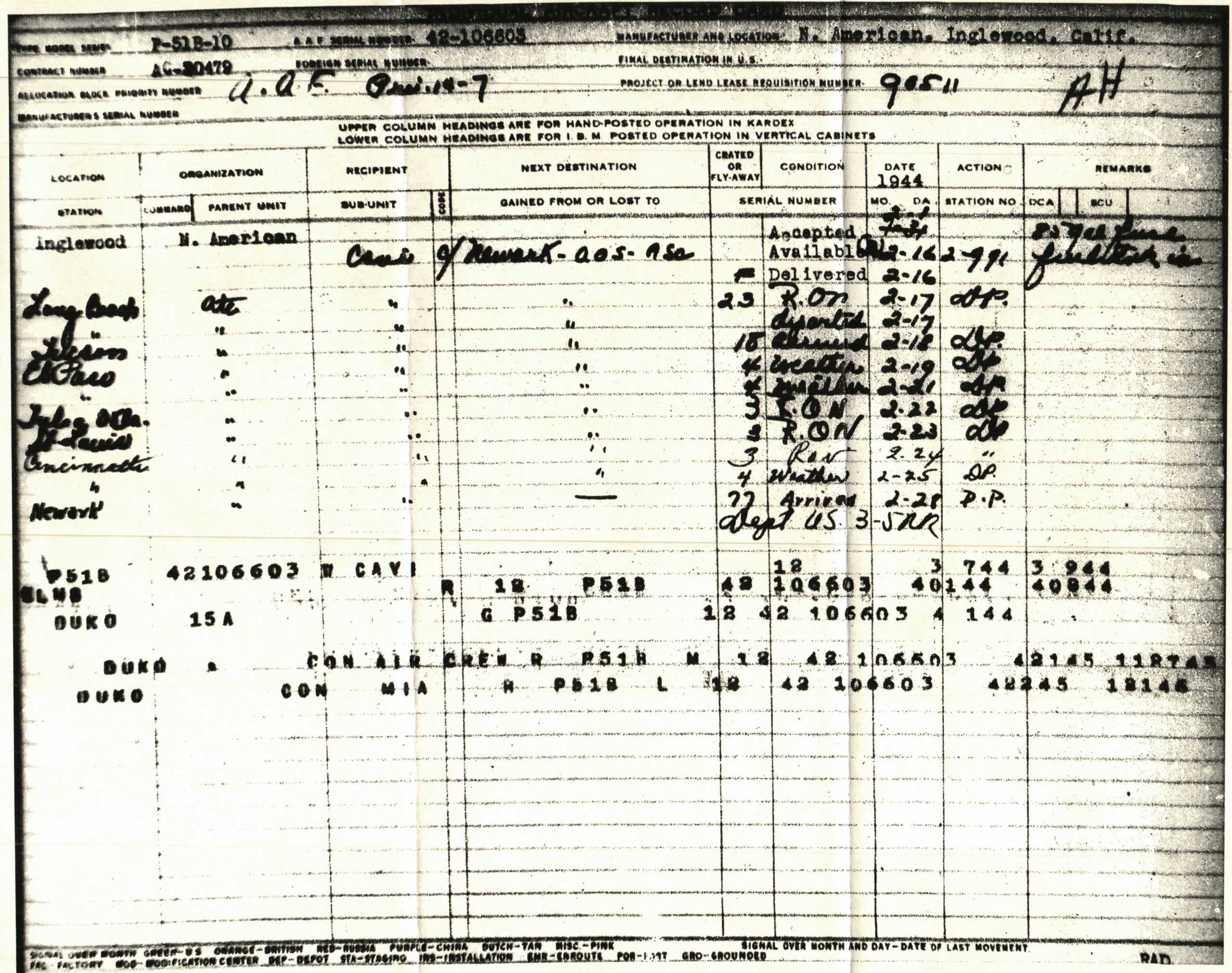 Within a week of receiving Leland’s MACR, a letter from the Smithsonian showed up in my mailbox. This was perfect timing, as the envelope contained more information about the airplane I had just learned the name of, Lucy Gal. The National Air & Space Museum had managed to locate the Aircraft Record Card for P-51B-10NA #42-106603. I now had more background on the airframe that Flight Officer Pennington had flown, just a mere week after learning the Mustang’s name. Assigned the Contract #AC-03479, the P-51 that would eventually become ‘Lucy Gal’ was kept stateside until March of 1944. She was sent overseas to serve with the 301st Fighter Squadron of the 332nd Fighter Group, the Tuskegee Airmen.