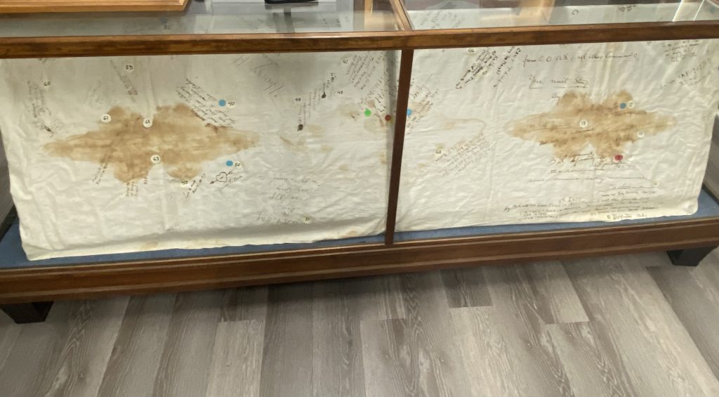 The tablecloth and artifacts can be seen at the CAF Houston Wing’s museum, open to the public every first and third Saturday of every month, from 10 a.m. – 3 p.m. free of charge. Groups can be accommodated at other times by appointment. The museum is primarily dedicated to WWII aviation but which also covers American, German, and Japanese military and home front life during the war. The museum exhibits are labeled and there are knowledgeable docents available to expand on the displays.