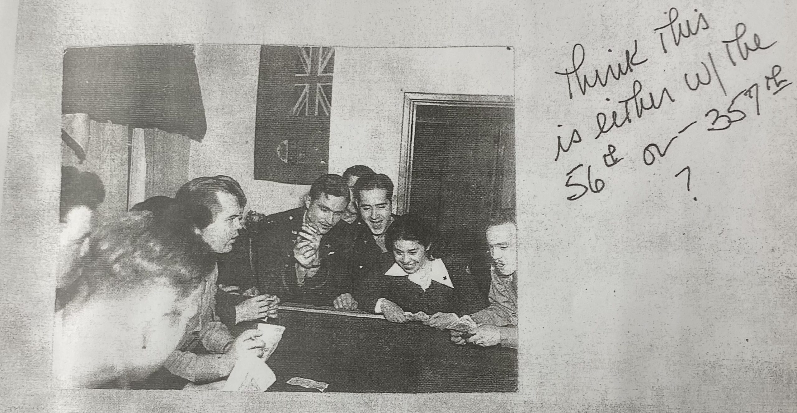 During her travels and time as a Red Cross Nurse, Virginia traveled with a William Ewart & Sons Tablecloth she had with her for hosting dinner parties and club-related events. This tablecloth was signed by over 60 personnel from various people in different units she served with. These signatures are from the 56th and 357th fighter groups, including nine ace pilots. Virginia gave the tablecloth to the 357th fighter group at their 35th reunion, which then ended up on display in an unidentified World War II museum. A short time after that, one of the ace pilots, Capt. William R. “Obie” O’Brien from the 357th Fighter Group, reclaimed the tablecloth as the museum was not properly taking care of it. O’Brien then donated it to The Houston Wing of the Commemorative Air Force, where it’s properly displayed and each signature is identified and labeled along with a binder of each photo of the signatures, information about the pilots who signed it, and also a copy of Virginia’s scrapbook kept during her time overseas.