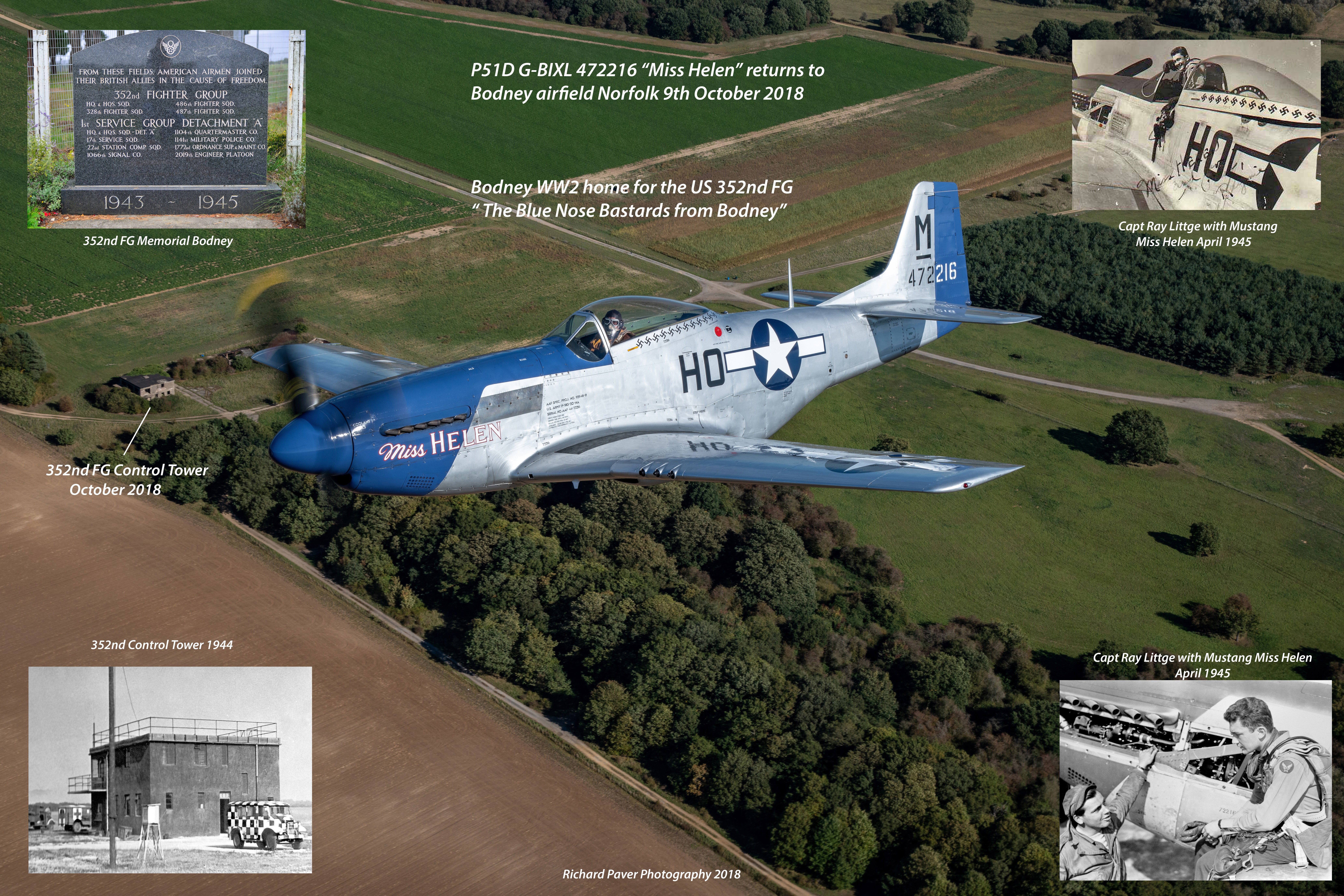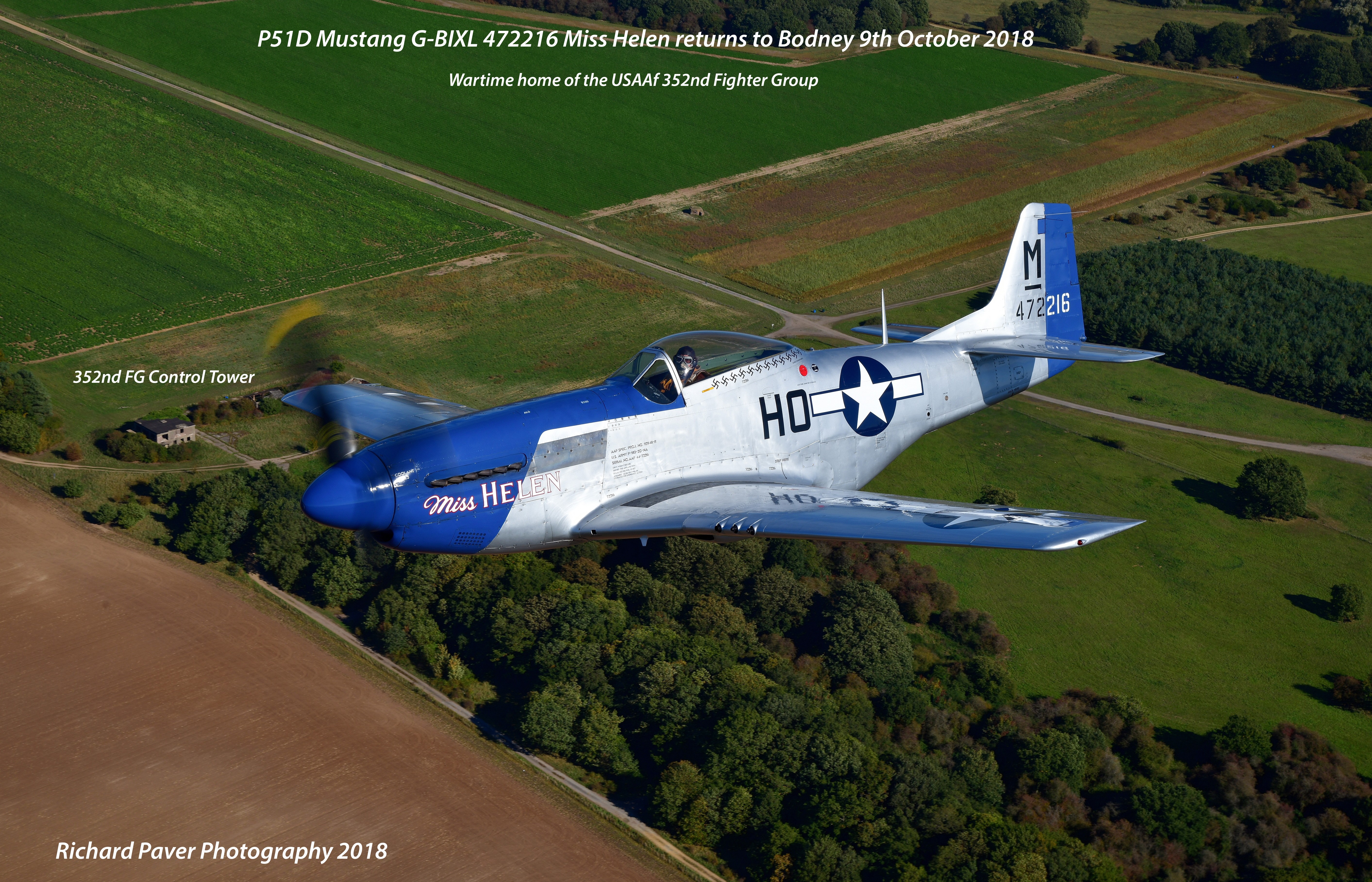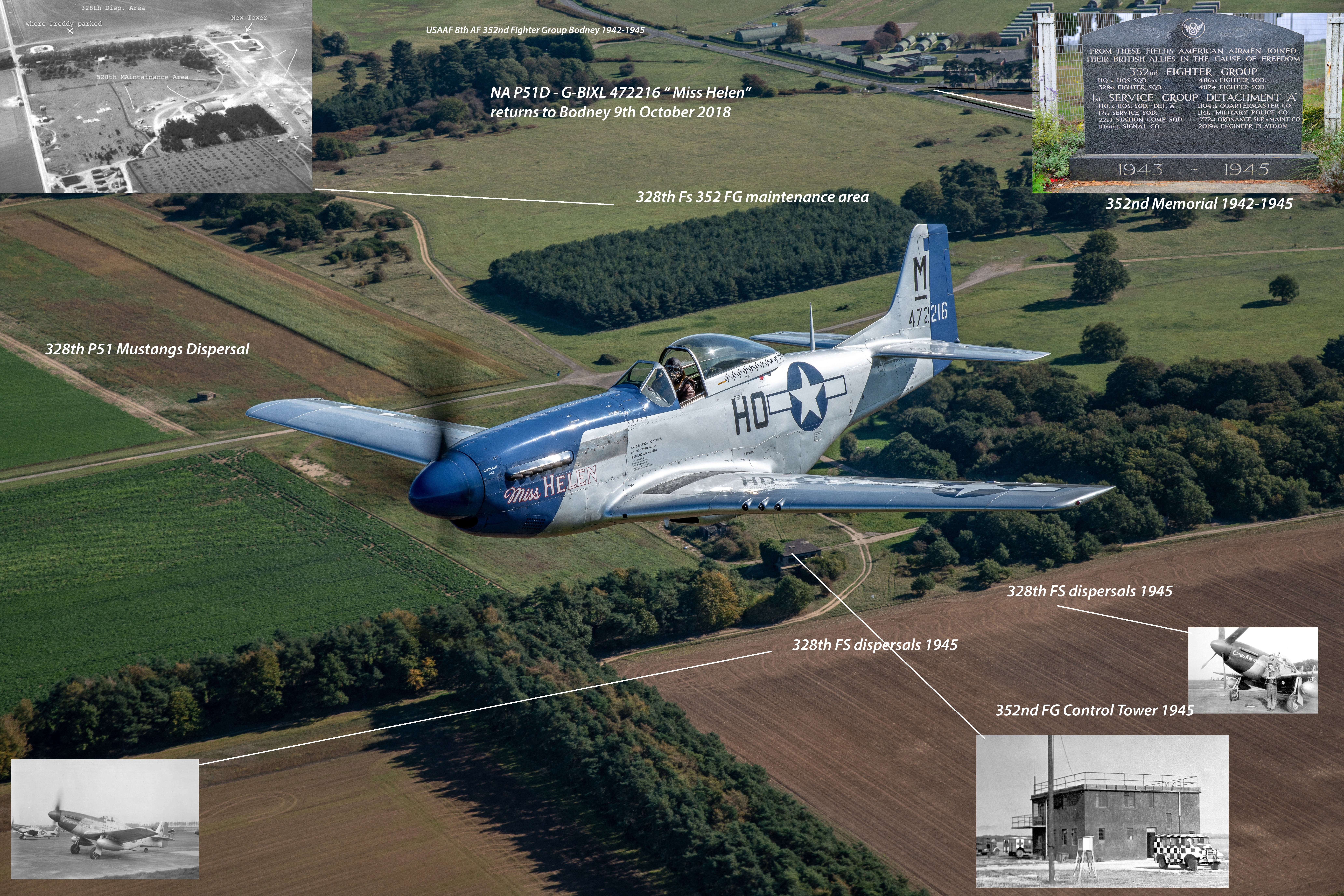 In 2016, I discussed the aircraft’s history with Miss Helen’s present owner, Robert Tyrell, and put forward the idea of an air-to-air photo shoot over Bodney. Having previously visited Bodney on the ground with the 352nd FG historian, Bill Espie, I was able to describe what can be seen on site at Bodney today to Robert Tyrell. Sadly, there is very little left which reveals this all-grass airfield’s historic past, but the control tower and fire engine shed are still in existence, together with long stretches of concrete perimeter track and some concrete hardstandings. However, nothing remains to show the original runway alignment, as a large part of the site returned to agricultural use immediately after the war. A line of mature trees now cuts directly across the line of the main runway, making it even more difficult to see where the wartime runway was originally positioned. Many of the 352nd FG Mustang dispersals were situated on the grass with PSP (pierced steel planking) matting, and revetments constructed from stacked timber wing tank crates – so none of this remains today