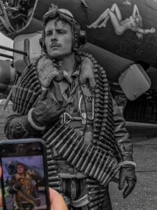 This leads to an interesting point from a photographic perspective. Modern-day DSLR, mirrorless cameras and even mobile phones deliver quality not possible during the ’40s. To replicate imagery taken in the 1940s surely you need to use a fixed 35 or 50mm lens similar to focal lengths available at that time, not modern zoom lenses which give a different perspective and ‘imagery feel’ to that of a color wet film camera regularly used by the U.S. military photographers of the day. Some photographers deliberately chose to shoot with older format cameras to replicate images more accurately. Directing the weekend shoot at North Weald only allowed practical use of my iPhone, however with modern-day post-processing techniques you would never know from the results!