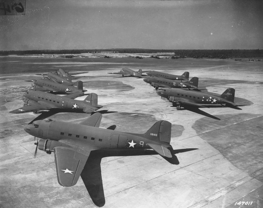 Thousands of other C-47s would serve all over the world, from the jungles of New Guinea to the sands of Egypt, Normandy’s fields, and Alaska’s tundra. They were critical to the Allies’ airborne operations for paratroopers and glider forces on D-Day, Operation Market Garden, and the crossing of the Rhine in 1945. They served in the British Commonwealth as the Douglas Dakota, and with the US Navy and Marines as the R4D. For many civilians in the occupied countries of Europe, the C-47’s presence brought up hopes of liberation, and for wounded Allied soldiers, the C-47s and Dakotas often flew them to military hospitals far behind the front lines, where these soldiers could receive proper medical treatment. C-47s also flew vital supplies from India through the Himalayas into China to fight the Japanese there.