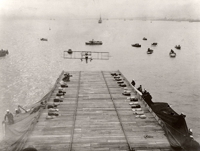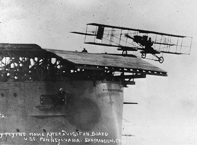 January 18, 1911: Eugene Ely has returned to San Francisco, where he was at the controls of a Curtiss Model D pusher to become the first aviator to land an airplane on a ship. At approximately 10:45 a.m., he took off from Selfridge Field (named for Thomas Selfridge, the first military aviator to be killed in a flying accident), adjacent to the Tanforan Racetrack in San Bruno, California. At anchor in San Francisco Bay rests the armored cruiser USS Pennsylvania (ACR-4), with a temporary wooden deck built over its stern, similar to the wooden deck built on USS Birmingham‘s bow for Ely’s takeoff in November 1910. What is different upon this deck, however, is that twenty-two ropes were stretched across the deck at 3-foot intervals, each with a 50-pound sandbag at each end. Ely’s plane had hooks mounted by fellow aviator Hugh Robinson in order to snag the ropes to prevent the biplane from running into the Pennsylvania‘s superstructure looming above the deck, while guideways were laid out across the deck, and there were 2-foot-high barriers on each edge of the flight deck. In case he went overboard into the water, Ely wore two bicycle innertubes as makeshift life preservers.