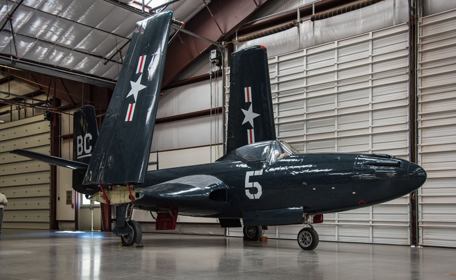 While jet engines were still revolutionary, especially for carrier aviation, other aspects of McDonnell’s design were more conventional, from the riveted aluminum skin to the folding wings for storage in the hangar deck, and the aircraft was armed with four nose mounted M2 Browning .50 caliber machine guns and racks for eight wing-mounted 5 in High Velocity Aircraft Rockets (HVARs). For better handling on takeoffs and landings, the design was fitted with split flaps for landing and provisions for Rocket Assisted Take Off (RATO) bottles for shorter takeoffs.
