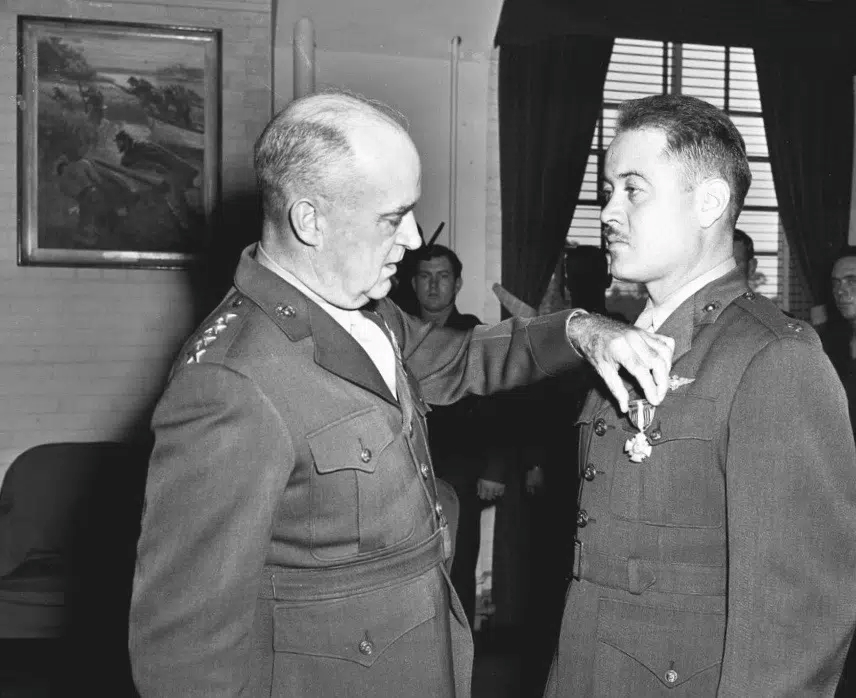When Japan finally surrendered on August 15, 1945, the US Army Air Force and US Navy organized aerial supply drops to POW camps in Japan to help feed the starved POWs until they could be released from captivity. During one of these flights, a photograph taken at low altitude revealed a sign on one of the barracks roofs that read “PAPPY BOYINGTON HERE!” To the men of the Black Sheep Squadron, it seemed as though Pappy had come back from the grave and was given a hero’s welcome by the surviving members of VMF-214 when he arrived in Hawaii on September 12, 1945. Back in the States, Boyington’s citation for the Medal of Honor had been signed in March 1944 by the late President Franklin Roosevelt. After being flown into Washington, D.C., Boyington was presented the Navy Cross by the Commandant of the Marine Corps, General Alexander Vandegrift, on October 4, 1945. The following day, he was presented with the Medal of Honor by President Harry Truman at a White House ceremony.
