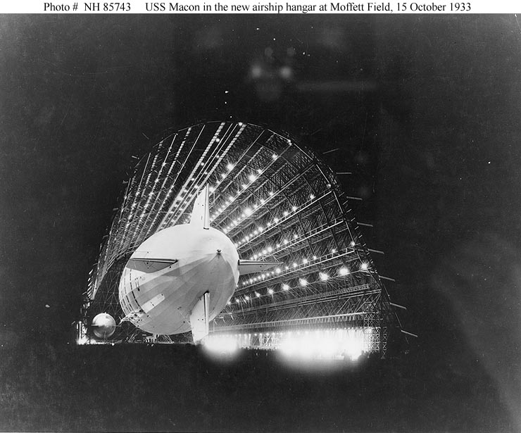 Several lessons learned in prior incidents with USS Akron were incorporated into the operating parameters of the USS Macon. During the summer of 1933, Macon participated in fleet exercises off the East Coast of the United States while operating out of NAS Lakehurst. Many of these tests, however, were organized by staff officers that did not take the airship’s strengths and weaknesses into account and often stipulated that the Macon had to visually spot the “enemy” fleet itself, exposing it to mock anti-aircraft fire, which frequently shot it down in the simulated tests. By October 1933, the USS Macon was flown across the North American continent and reassigned to what was until September 1933 NAS Sunnyvale but was now named Moffett Field, which also featured the massive new Hangar One, which was built for the Macon and still stands to this day.