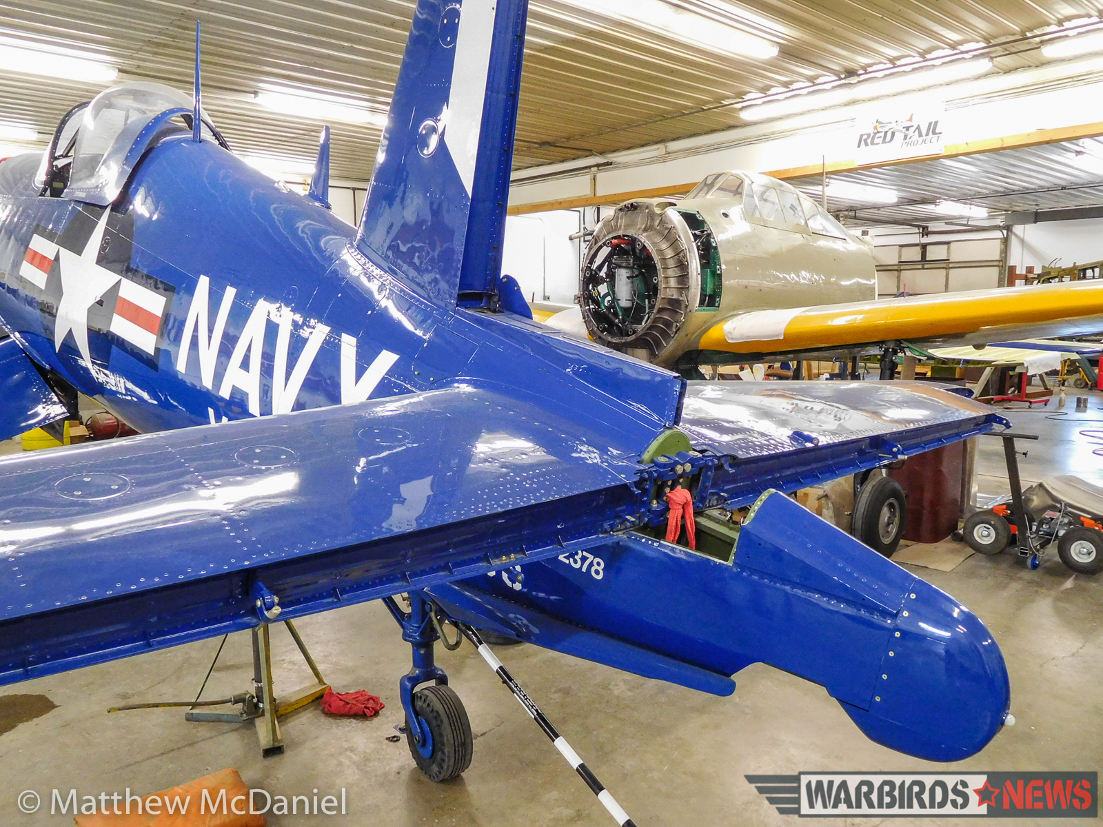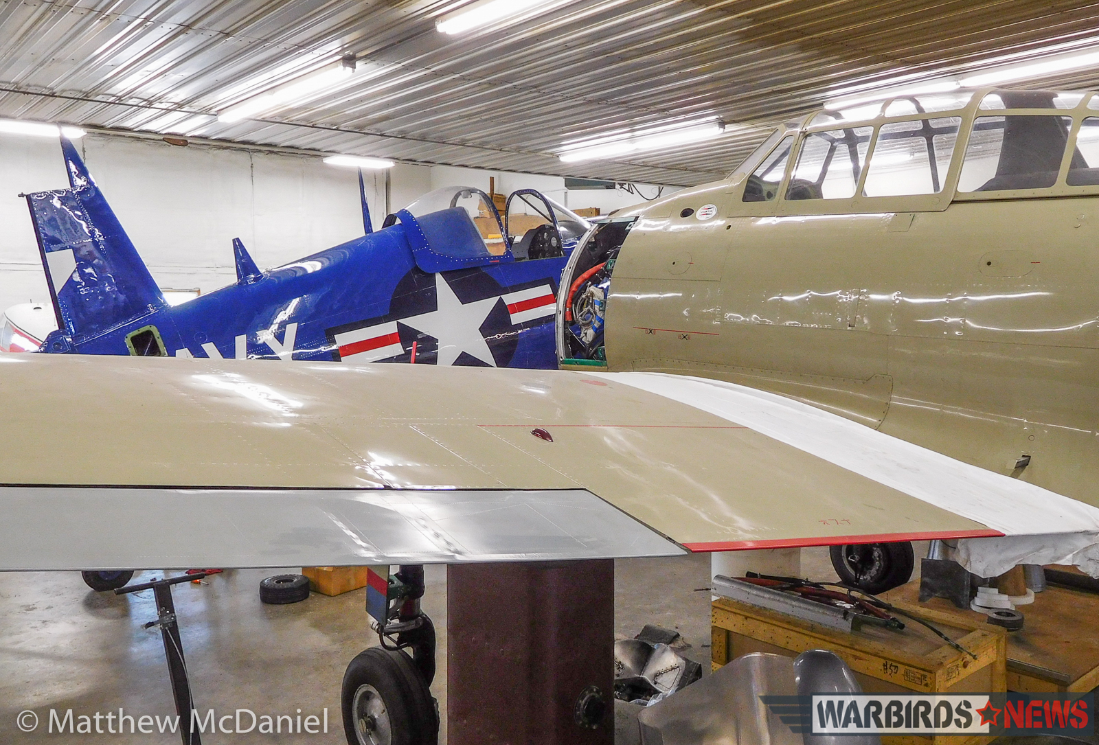During WarbirdsNews’ visit to Tri-State Aviation in early June, 2016, the bent-wing fighter was still being refurbished with particular emphasis on replacing its fabric coverings (all primary flight control surfaces and the underside of each outboard wind section). Engine work was also underway. When completed, 97388 will emerge with a fresh annual, new fabric, and be as pristine as she was when Beck completed her 18 years ago. It will be great to have yet another fine Corsair not only airworthy, but being actively flown and giving air show audiences an opportunity to hear “Whistling Death” in person.