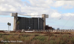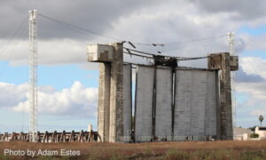 With the exception of a small portion of the wooden wall on the southwest corner of the hangar, the only remnants still standing are the massive hangar doors and their concrete support pillars.
