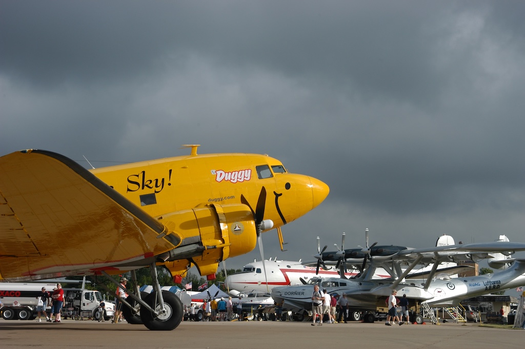 All the while, Carley shared with Kaplan his grand vision, dating back to his earliest creation of Duggy, of one day having a real, flying Duggy the DC-3, the bright yellow guy traveling the air show circuit as “The Smile in the Sky.” Such a spectacular flying classroom concept could take SkyReach and the NAHF’s “Learn from the past, dream for the future” message almost anywhere and connect with far more than a few thousand schoolchildren. The more the two men thought about it, the more they thought, why not? Thus, in late 2004, Kaplan and Carley, along with commercial big jet pilot, Rob Challans, a partner of Carley’s, commenced their search for a DC-3 that the NAHF could lease and Carley could transform into a real-life, flying “Duggy,” complete with interior seating and SkyReach displays. Despite the all-hands-on-deck effort, after a month of calls and visits, they were coming up empty. A former chicken hauling C-47 in Iowa was unworkable. Several former auto parts haulers parked in Ohio could not be purchased and were stuck in receivership. Restored DC-3s were too expensive, too sacred to convert, or simply not available. While in California for a toy manufacturer visit, the trio sat down to consider giving up the prospect of ever having a real Duggy, their options of finding a suitable DC-3 seemingly exhausted. Kaplan, who prided himself on being able to “connect the dots,” realized he just might have a couple of more left to connect. The upcoming National Aviation Heritage Invitational, which he co-founded at the Reno Air Races, was coming up in a few weeks.