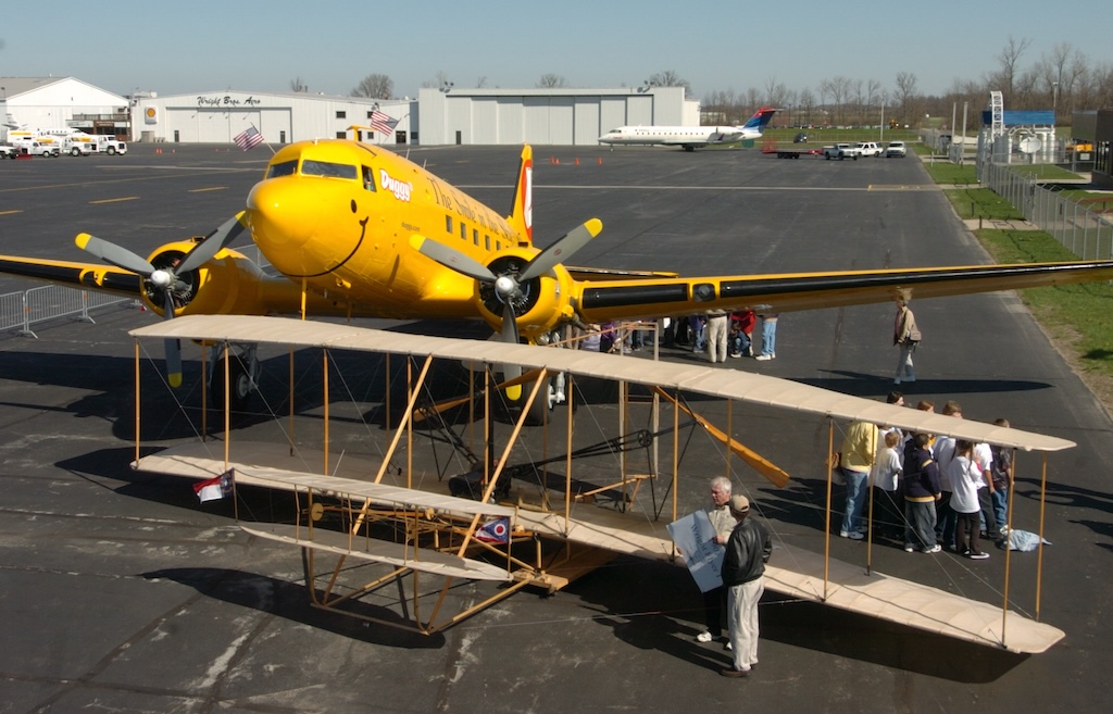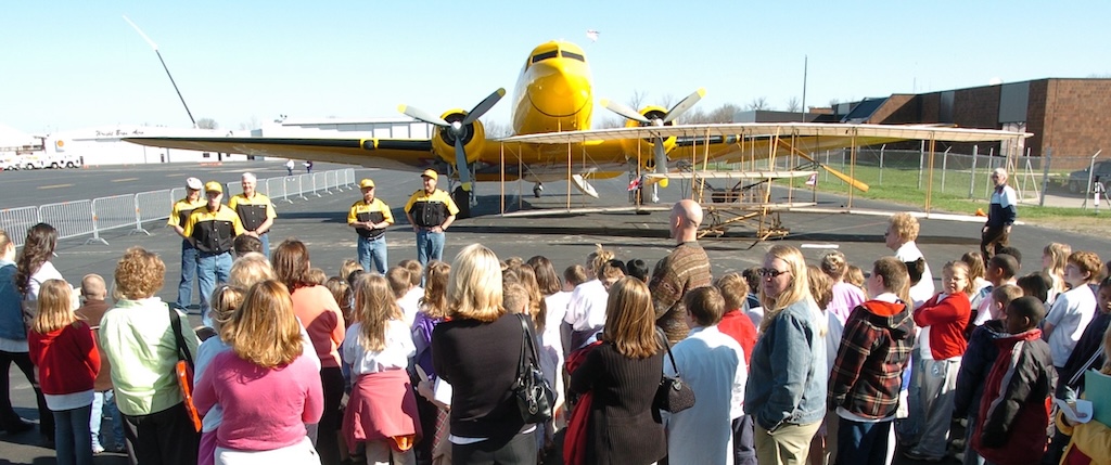 Conrad suggested that Kaplan and Carley plan a “pre-debut debut” at Dayton International (DAY), making it a stop on the way from Fargo to Lakeland. On the ramp with Duggy would be “Flyer” one of his “Friends,” in the form of a full-scale replica Wright ’03 Flyer, to receive the press along with several busloads of local schoolkids and teachers who would become the first in America to board Duggy as part of the NAHF’s SkyReach program. For the “Birthplace of Aviation,” what more historically significant aircraft could one pair up than a Wright Flyer and a Douglas DC-3? The resourceful Conrad made sure that the airport FBO, not surprisingly called Wright Brothers Aero, provided fuel and oil support for Duggy’s visit. Engler and his team of craftsmen prepared to host the students in their hangar workshops for a hands-on, STEM experience tied to the two iconic aircraft and the NAHF enshrinees who designed them.