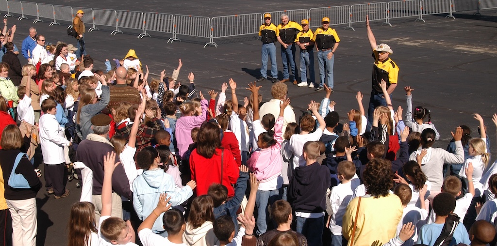 As Duggy’s crew graciously dealt with the attention, they also had an eye on the clock and the weather. The tight schedule called for Duggy to depart DAY for Lakeland, with an overnight stop in Sevierville, Tennessee, for fuel and a photo opportunity. Kaplan, recently promoted to Executive Director, would fly to Lakeland commercially the next day to join them at Sun ‘N Fun after taking care of NAHF Learning Center business. When “The Smile in the Sky” lifted off from Dayton International, hundreds of new fans were left behind. The number of fans increased exponentially at Sun ‘N Fun, where the big yellow guy was received like a rock star. The crew was nearly overwhelmed by the attention. The minute Duggy taxied into place and shut engines down, mobs of spectators surrounded the plane. Almost immediately, educators wanted to know more about SkyReach and bring their classes for a presentation. Sun-N-Fun officials quickly moved Duggy closer to the main entrance, making access to Duggy easier for the steady stream of school groups coming off their buses in the parking lot.