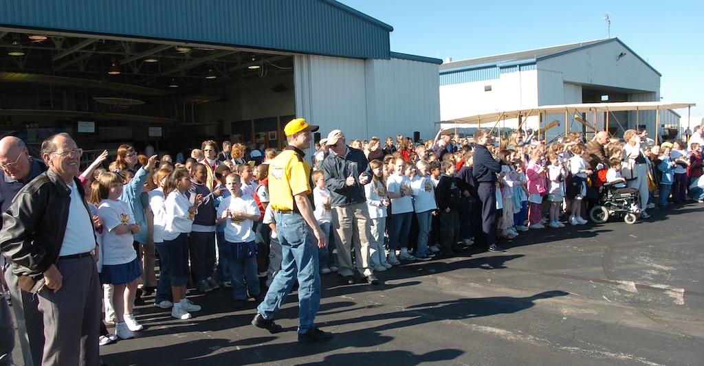 For Carley, Kaplan, Odie, and his crew, things were now getting real, real fast. Odie and Thompson, with Challans joining them in Fargo, packed up Duggy for the extended journey south, which would begin with a 0-dark-30 departure so as to arrive late morning at DAY for the welcoming festivities. Carley returned to Ohio to accelerate the design and printing of the cabin displays (that unfortunately would not be installed until after Sun ‘N Fun). Engler’s shop prepared their ’03 Flyer for display, and hands-on activities were prepared for several local junior and senior high school groups that were being invited. At long last, the big day – April 8, 2005 – arrived. Early spring in Ohio can be beautiful but chilly, as it was that brilliantly sunlit morning when hundreds of schoolkids, their teachers and chaperones, NAHF staff and trustees, airport staff, and local media representatives stood shivering on the ramp outside the open Wright Brothers Aeroplane Company hangar door. Duggy and crew were inbound, and a fixable mechanical issue had delayed their take-off from North Dakota. STEM activities in the hangar commenced early to placate the mob of youngsters, hyped with anticipation of meeting the real Duggy. Basking in the sun before them was the Wright ’03 Flyer replica, a small corps of volunteers standing by for crowd control and prepared to conduct the first tours on the ramp. Soon, the chugging sound of the big round radials was heard from across the airport. Triggering everyone’s excitement level, the chill was forgotten as they crowded up to the safety rope to watch Duggy, his propellers, big sunlit discs, taxi toward them, and the awaiting Flyer.