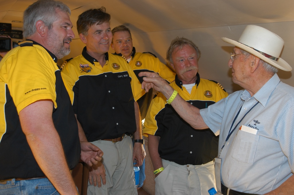 And being Oshkosh, a who’s who of air and space luminaries were there including NAHF enshrinees Burt and Dick Rutan, Bob Hoover, Chuck Yeager, Robin Olds, Patty Wagstaff, Paul Poberezny and SkyReach advocate, Scott Crossfield. Kaplan and Carley chatted up Sir Richard Branson on the ramp, and were delighted when the niece of NAHF nominee, Steve Fossett, brought her young son for a tour of Duggy. When EAA Young Eagles director Steve Buss invited Duggy’s crew to serve as spotters for the annual Gala’s live auction, they jumped. The Duggy team and SkyReach had already donated a sightseeing flight around AirVenture for 10, accompanied by Crossfield, who was happy to lend his “celebrity” support. David Lau of Watertown, Wisconsin, was the winning bidder. To the delight of Lau and his Duggy entourage flying with Crossfield the next morning, they were greeted upon landing by Bob Hoover.