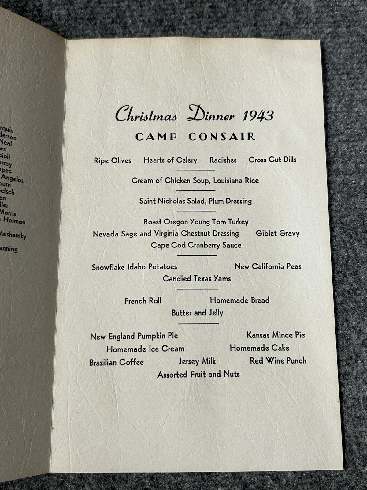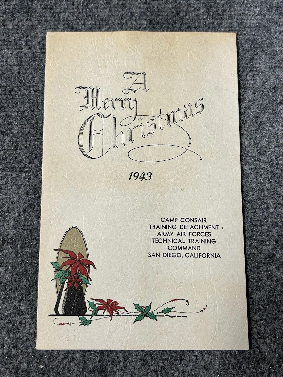What could—or would—be done to celebrate the holiday in some comforting fashion? Each base and unit typically marked Christmas with a special dinner, modeled after a traditional American family holiday meal. Some locations also offered church services, musical performances, or opportunities to participate in local holiday events such as dances. Was this the first time servicemembers experienced the absence of family during the holidays? Not at all. Authentic reflections of this experience from various periods in American history can be found today in family scrapbooks, collectible memorabilia, and historical society or museum archives. A few genuine examples of these items, which take us back to Christmases past, are shown here. The items illustrated—and many others—are examples that can now be found for purchase online.