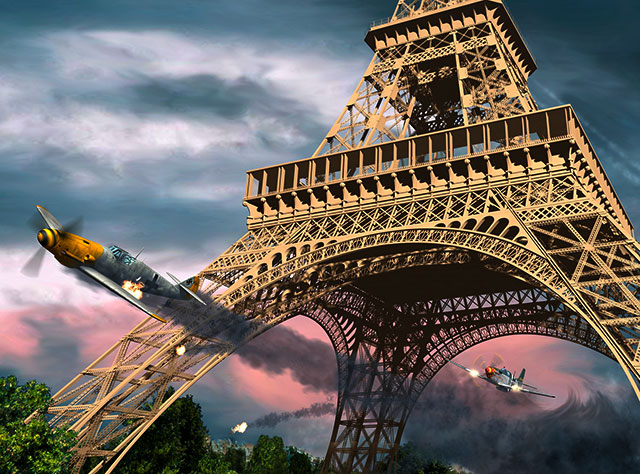 In the spring of 1944 Bill and his P-51C “Berlin Express” were near Paris when the scene that is immortalized in the artwork by Len Krenzler of Action Art that leads this article took place. Bill had followed this Bf 109 from the bombers he was escorting when most of the German fighters left. The two planes had been in a running dogfight. The German pilot flew over Paris hoping that the heavy German anti-aircraft artillery would solve his problem and eliminate Overstreet and the “Berlin Express,” though Bill managed to get some hits in at about 1500 feet. The German’s engine was hit, and Bill stayed on his tail braving the intense enemy flak. His desperation undoubtedly growing, the German pilot aimed his plane at the Eiffel Tower and in a surprising maneuver, flew beneath it. Undeterred, Bill followed right behind him, scoring several more hits in the process. The German plane crashed and Bill escaped the heavy flak around Paris by flying low and full throttle over the river until he had cleared the city’s heavy anti-aircraft batteries.