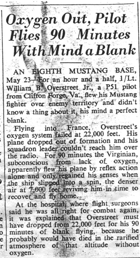 Bill relates, “Not long after (the March 6th Mission), I had a freak accident. I think it was a mission to southern France. While over enemy territory, a burst of flak cut my oxygen line. Since I was at about 25,000 feet, I soon passed out. The next thing I knew, I was in a spin, engine dead since the fuel tank it was set on was dry. Somehow, I recovered from the spin, changed fuel setting, got the engine started, and dodged the trees that were in front of me. Then, I looked at my watch. Ninety minutes were not in my memory. I had no idea where I was, but remembered where I had been headed so I reversed it. I was able to find the coast of France and headed for Leiston. By this time, I was low on fuel, so I landed at the Fourth Group base. The officer I talked with was Captain Mead, who had lived a couple of blocks from my home in Clifton Forge, Virginia. To top it off, the mechanic who repaired my plane was “Hot Cha” Tucker, a former schoolmate, also from Clifton Forge. I still have a picture of Tucker and me with a P-47. Many weeks later, this story got a lot of publicity – Lowell Thomas on radio, newspapers and TIME magazine.“