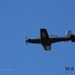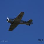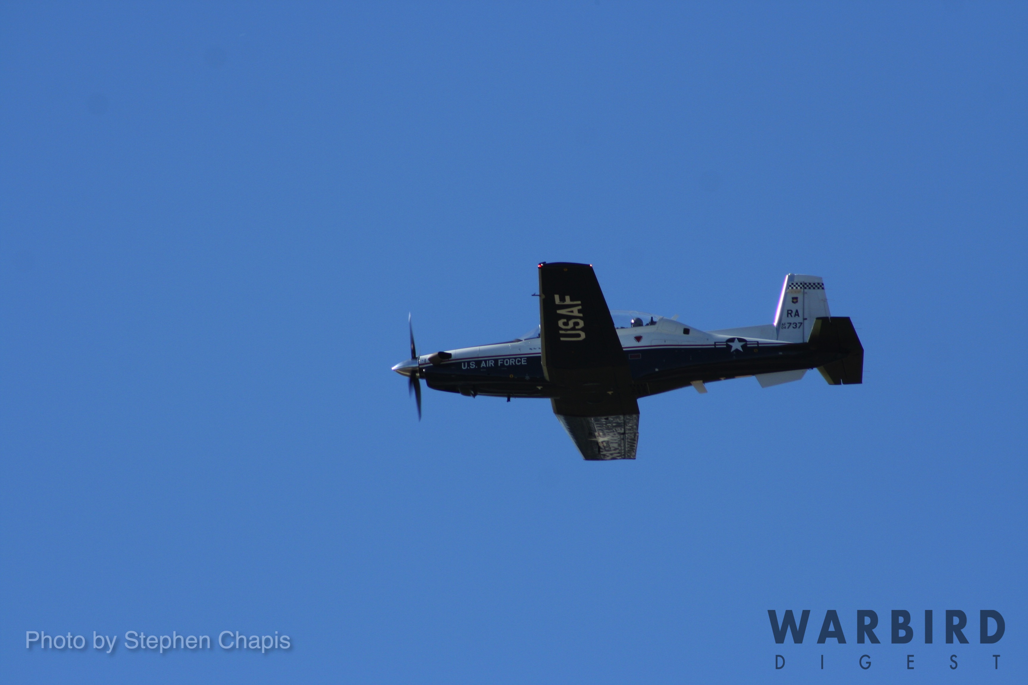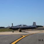 It now close to 1430hrs and our jets were due back in the next 10 minutes. Once again, my crew and I jump in the truck and head down to the departure end of 19R to recover our jets. As we leave the shop, I see the shadowy silhouette of a B-2 Spirit pass south of the base. Once again, the ground frequency is very busy because the flyover aircraft are beginning to return. I call Andrews Ground three or four times for permission to drive onto the taxiway. With a slightly curt tone the controller clears me to the southern EOR area. This lady was busy; she was working with half-dozen arriving warbirds, a C-17, our returning F-16s, and the departing Thunderbirds. We follow the T-6 and T-6A down the taxiway to the EOR area. Our jets are parked on the ramp between the two parallel runways and we need clearance to cross the active runway to get to them. That clearance was not forthcoming at this time; there were still lots of activity on the runway. I take the opportunity to shoot a couple pictures of the T-6.