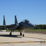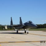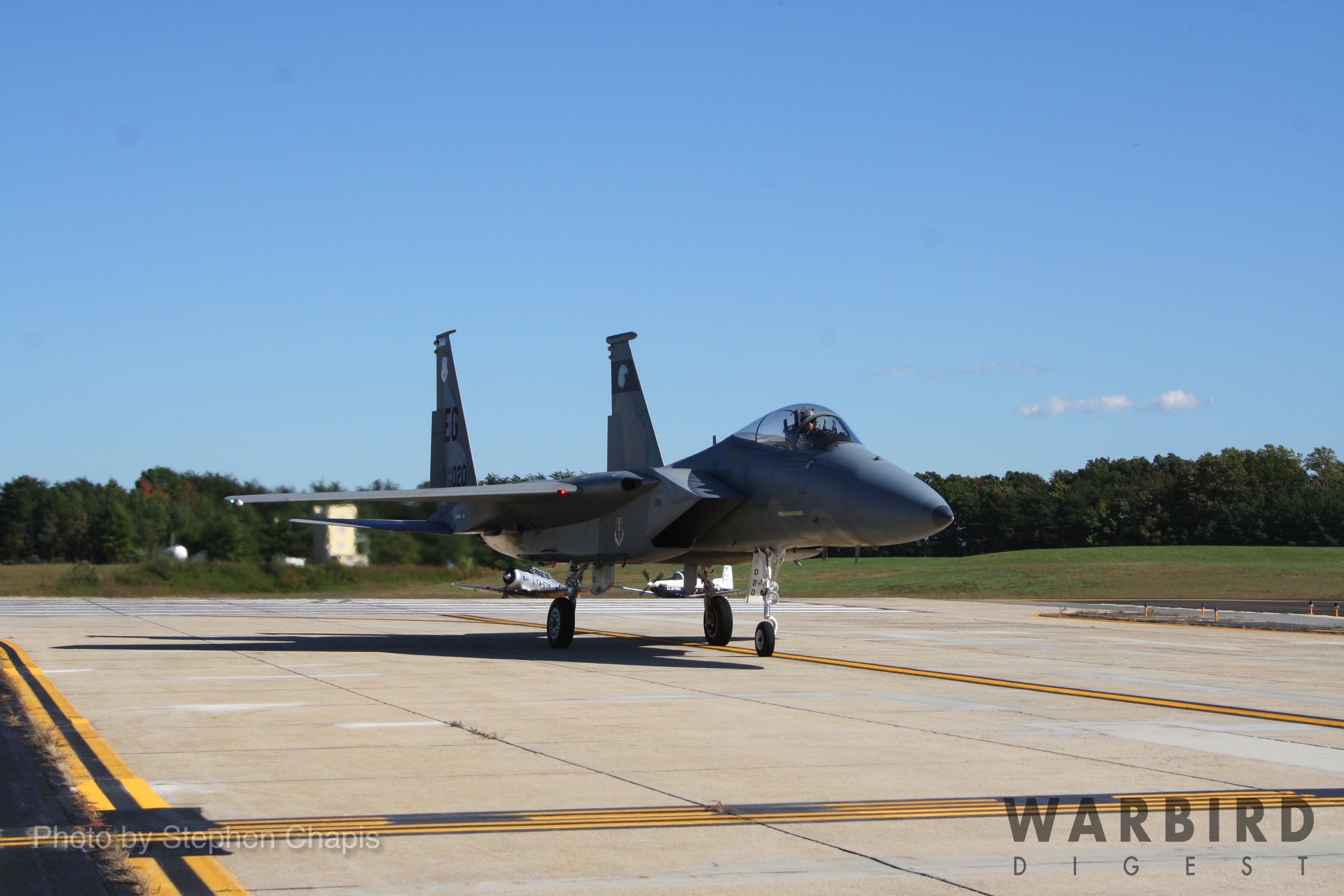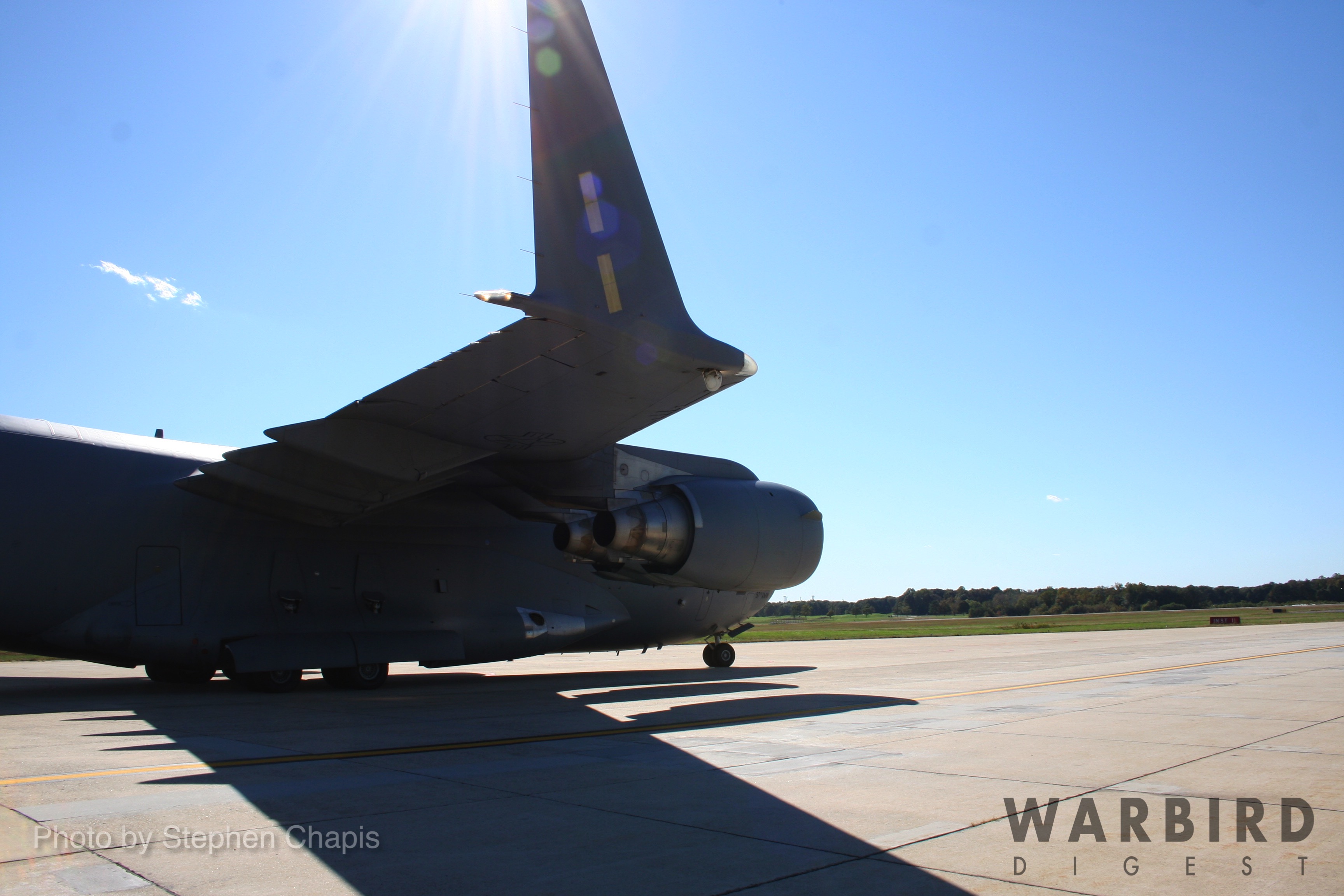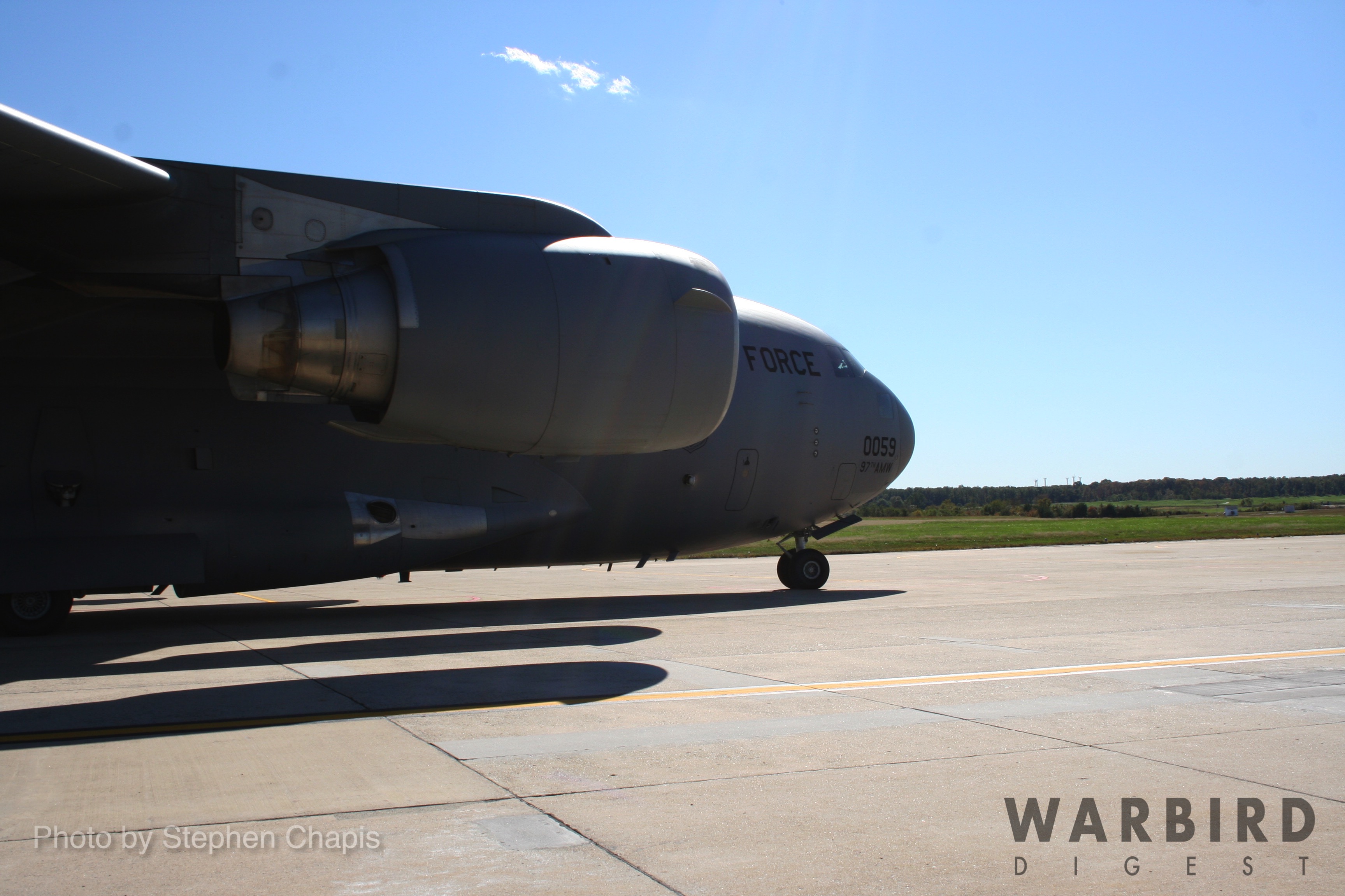The first aircraft to come by was the C-17; this required our jets to re-position to another ramp to make room for the massive Globemaster III. The C-17 pilot had to maneuver to the left side of the taxiway to clear our truck; even so the wingtip nearly was over our heads as he passed. Once safely passed our truck he steered back onto the centerline which buffeted our truck (and me standing outside) a little because the outboard engines hang over the taxiway edges. Five minutes later the F-4 lands and taxies by still trailing his drogue chute. The pilot waves as I snap his picture. Pilots love to have their picture taken. The F-4 is quickly followed by its successor, the F-15 Eagle. This Eagle is the East Coast Demo jet. It is starting to calm down now and the T-6 and T-6A cross the runway. The last aircraft to pass our truck was the Turbo DC-3. Unfortunately for me the Stearman, F-86, B-17, and B-24 turned off at mid-field and the F-22 and the Thunderbirds did not return to Andrews. Once the Gooney Bird passes us, Andrews Ground clears us across the runway, and we return to our shop and head home for the day.