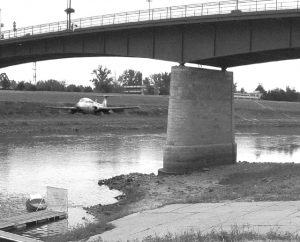 “On June 4, 1965 the Russian pilot Velentin Privalov flew underneath the central span of the bridge over the Ob river. The day was hot and sunny ,on the river’s shore vacationers, among whom were officers of the district headquarters, and suddenly the roar of the aircraft and the silver arrow rushes in front of everyone under the bridge, then suddenly soaring upward, lifting the huge wave of the Gypsies. The distance between the supports of the bridge 120 m, height 30 m span aircraft went into this “window” at the speed of 700 km / h At that speed, even a slight touch of the control knob changes the pitch of the aircraft by the meter. Airplane flying just feet above the water surface. The circumstances were complicated by the fact that only at a distance of 950 meters from the Municipal bridge downstream of the railway bridge ZapSib major highway and it took part. The pilot was only 5 seconds to catch soar up without hitting the bridge. Privalov threatened the tribunal, but the then Minister of Defense Marshal Malinovsky decided to keep the pilot in the ranks. Privalov, then served in Kubinka.”