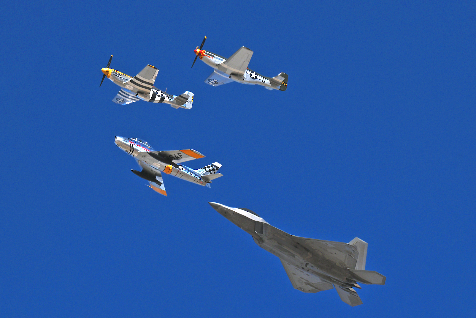 An F-22 Raptor flies alongside the Mustangs Fragile But Agile and Wee Willy II and Sabre HELL-ER BUST X. [USAF photo by Staff Sgt. Nathan Call]